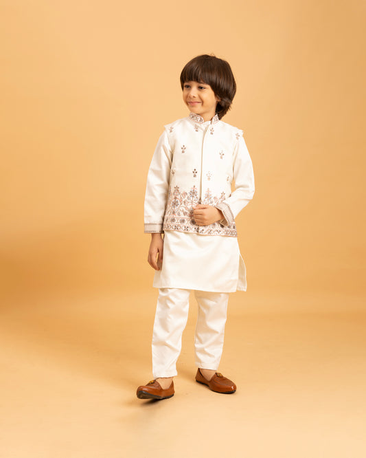 "Royal White Kurta with Mustard Floral Embroidered Nehru Jacket"