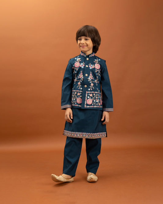 Boys Royal Blue Embroidered Kurta Set with Nehru Jacket