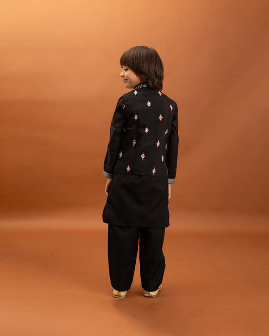 Boys Classic Black Embroidered Kurta Set with Nehru Jacket
