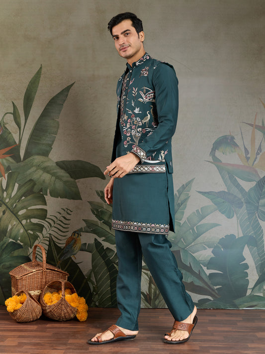 Teal Green Embroidered Kurta Set with Ethnic Jacket – Festive & Wedding Wear