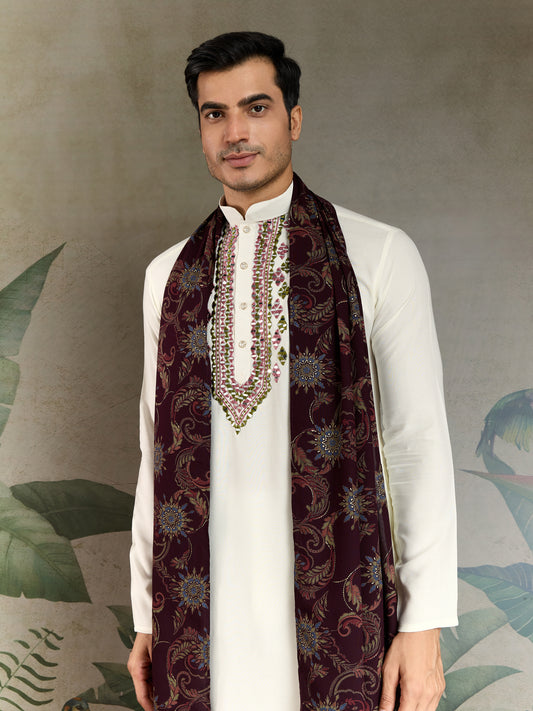 Men’s White Viscose Kurta with Dusty Purple Mirror Work