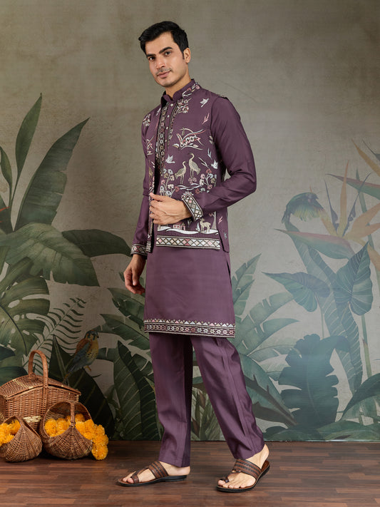 Men’s RUST PURPLE Embroidered Kurta Set with Jacket – Festive & Wedding Wear