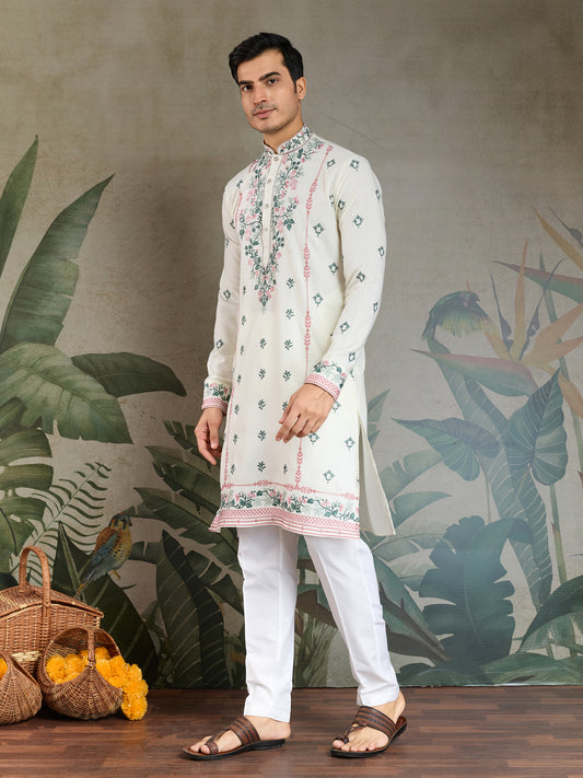 Elegant White Embroidered Men’s Kurta with Pastel Floral Detailing