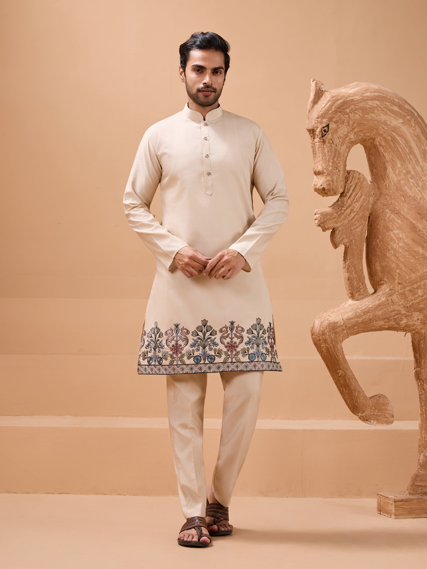Beige Embroidered Kurta Set with Elegant Floral Detailing