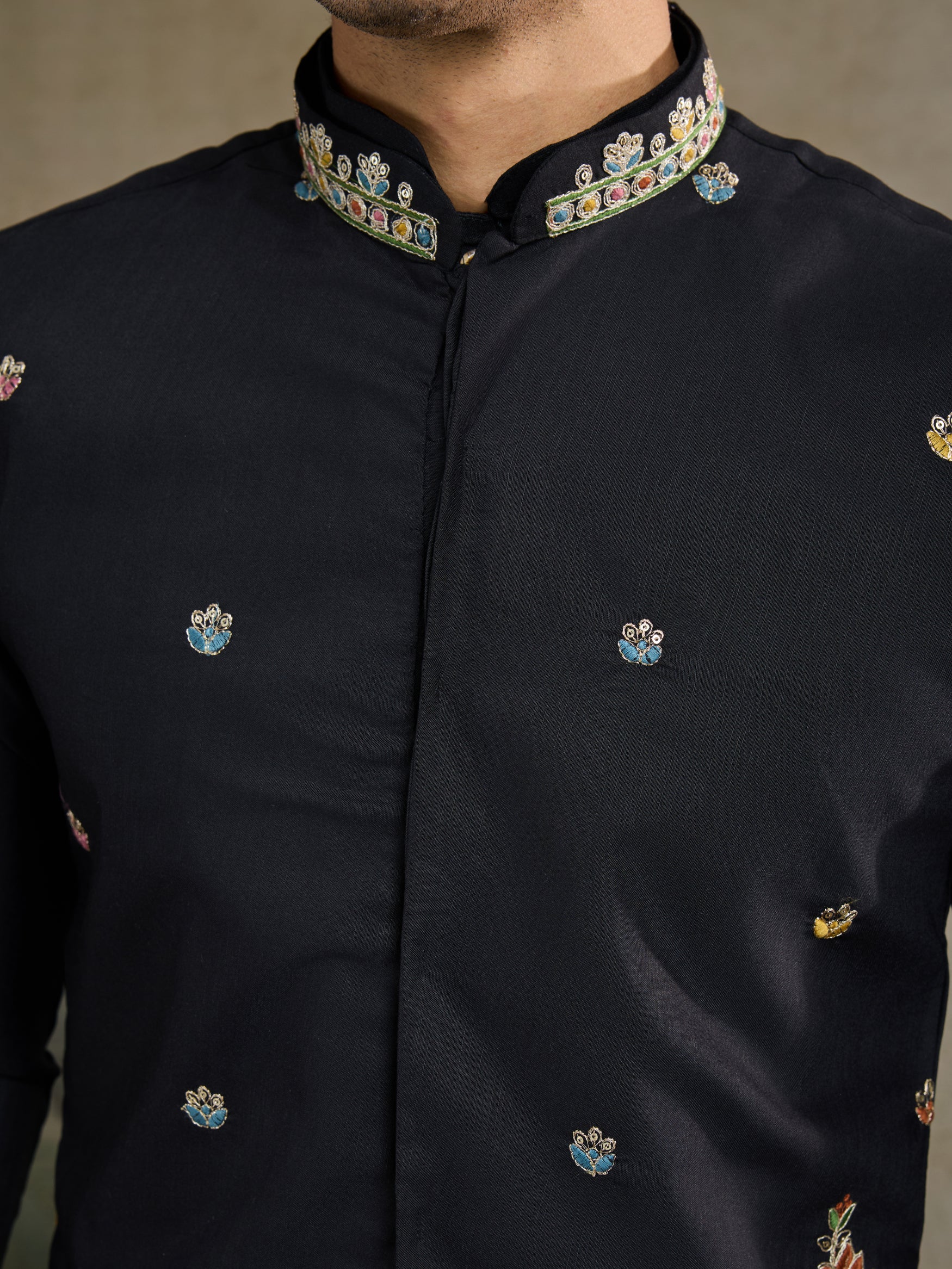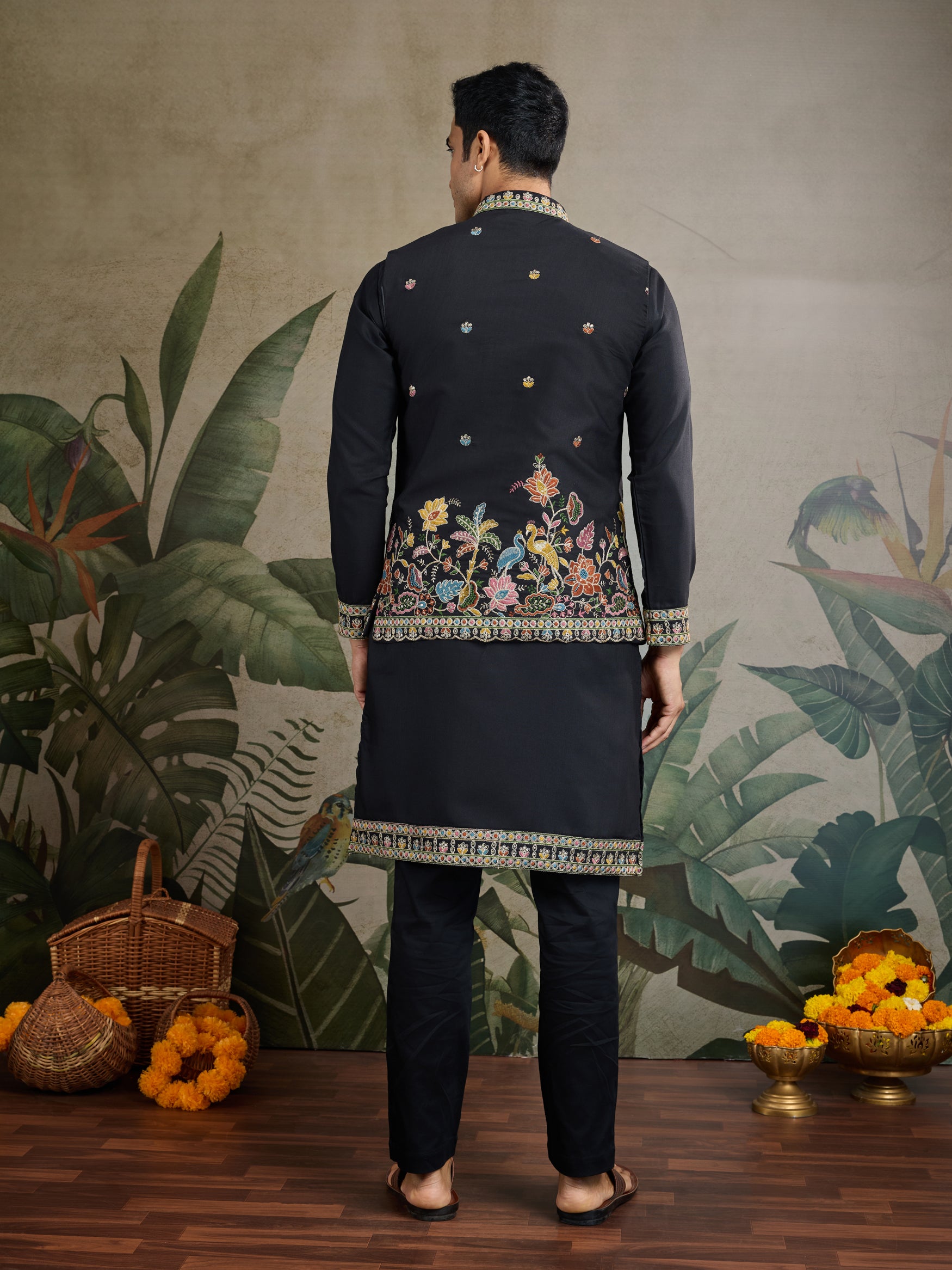 Make a statement at festive celebrations and weddings with this elegant black Indo-Western kurta set. Designed with a contemporary silhouette, the outfit features: