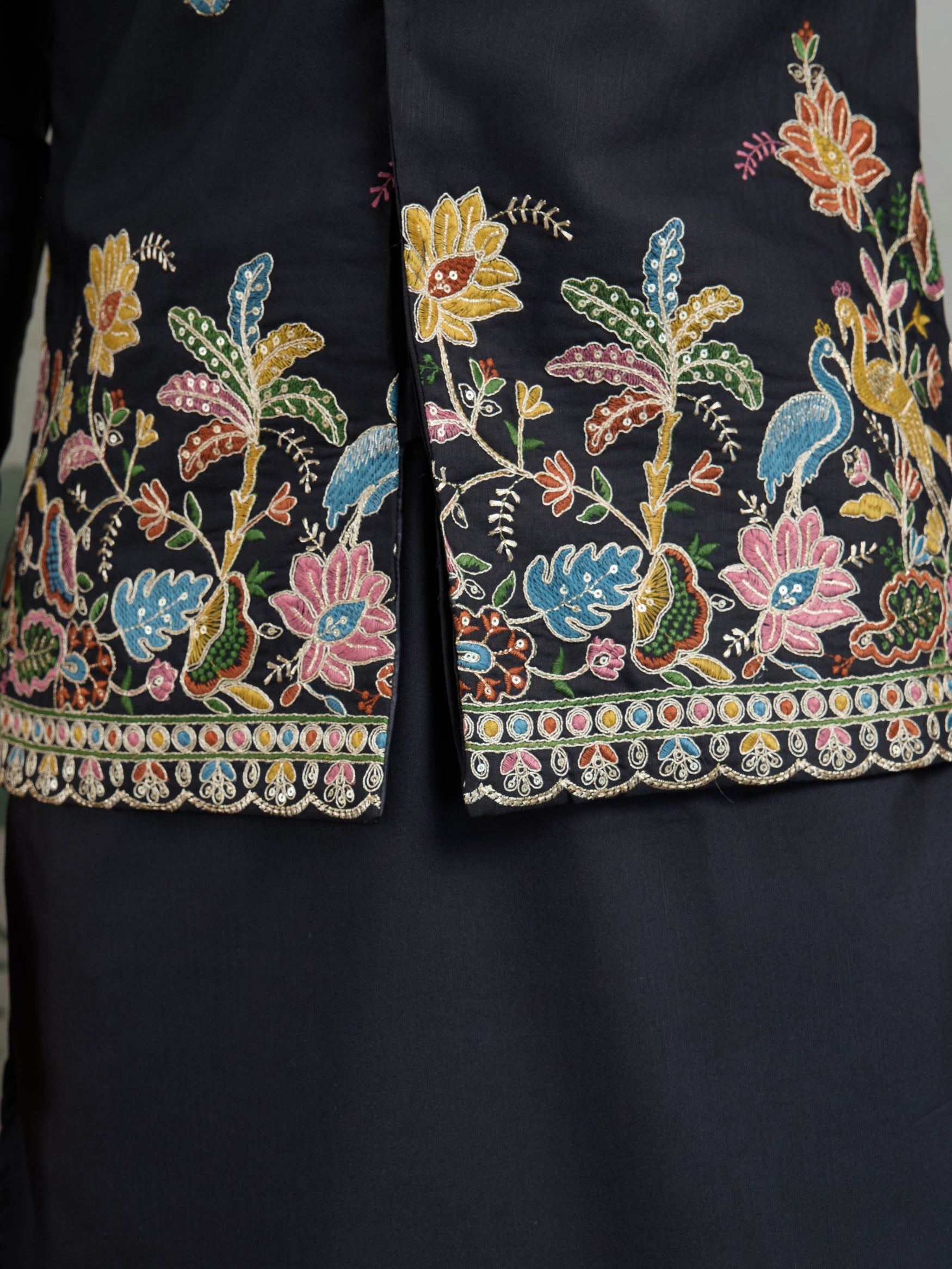 ✨ Detailed embroidery – Intricate multicolor floral and bird motifs on the jacket with embroidered cuffs and borders.