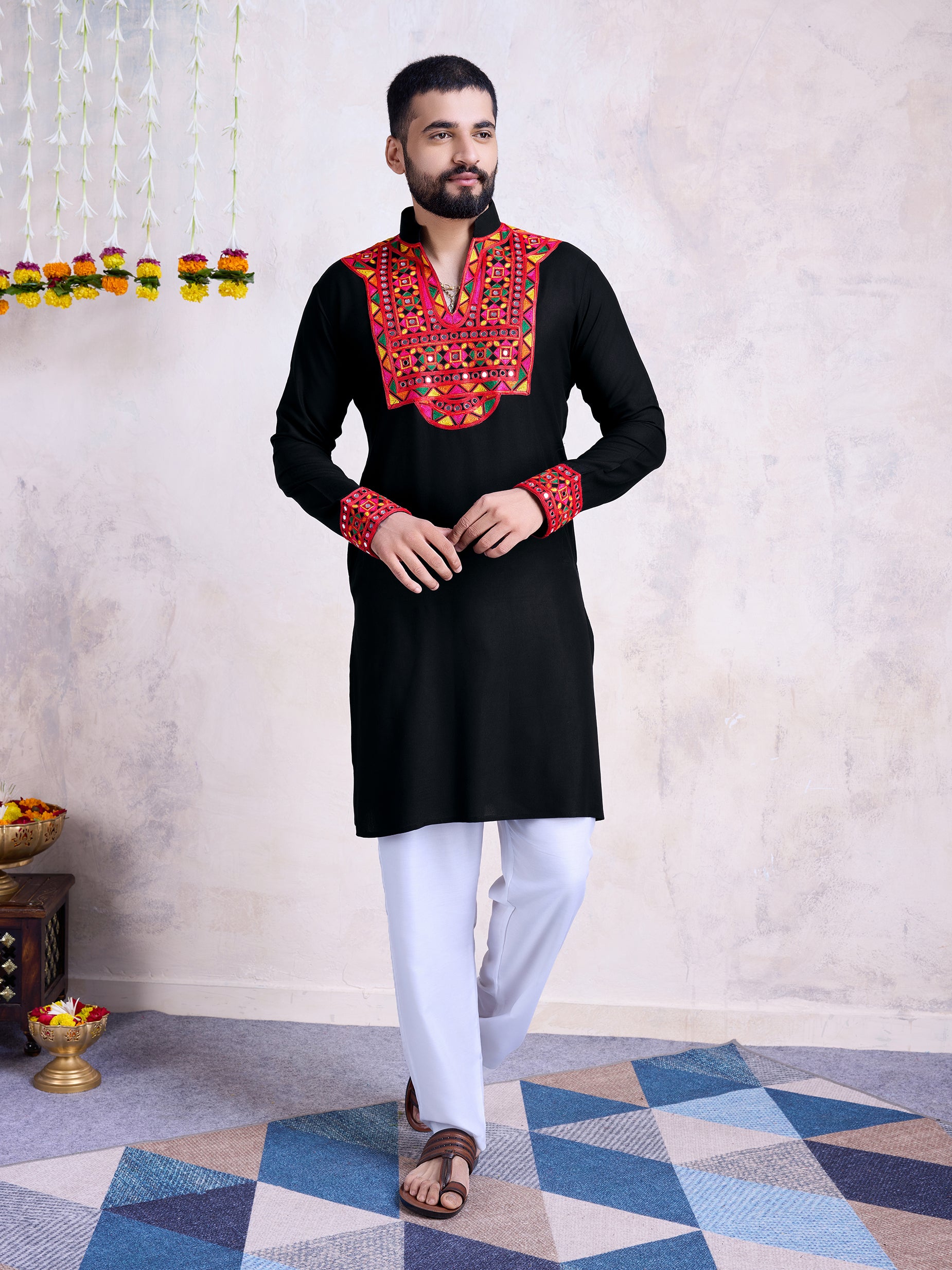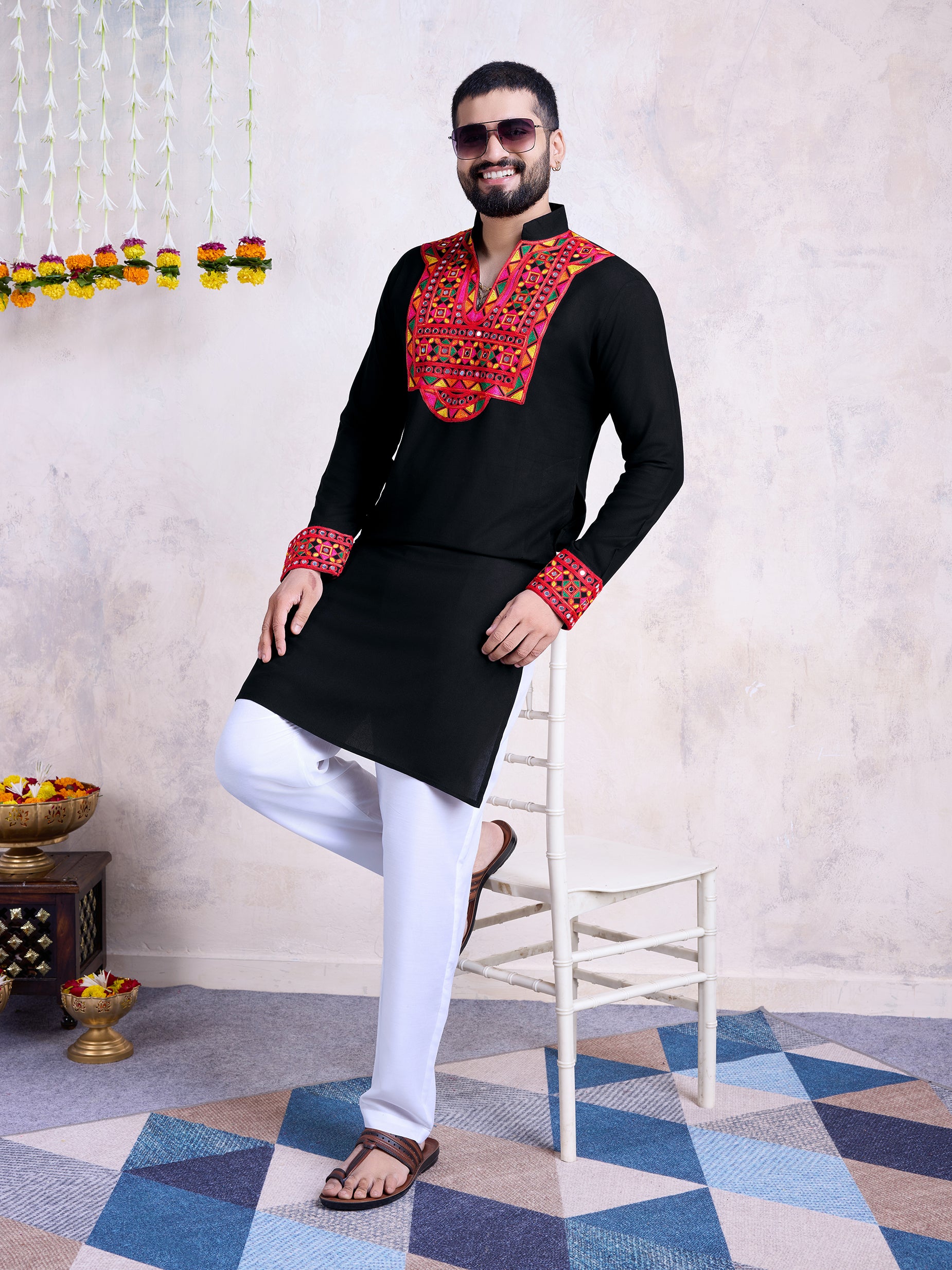 Make a bold statement with this classic black kurta adorned with vibrant multicolor embroidery and mirror work. The detailed craftsmanship on the neckline and cuffs brings a rich ethnic charm, making it an ideal choice for festive occasions, weddings, and cultural celebrations.