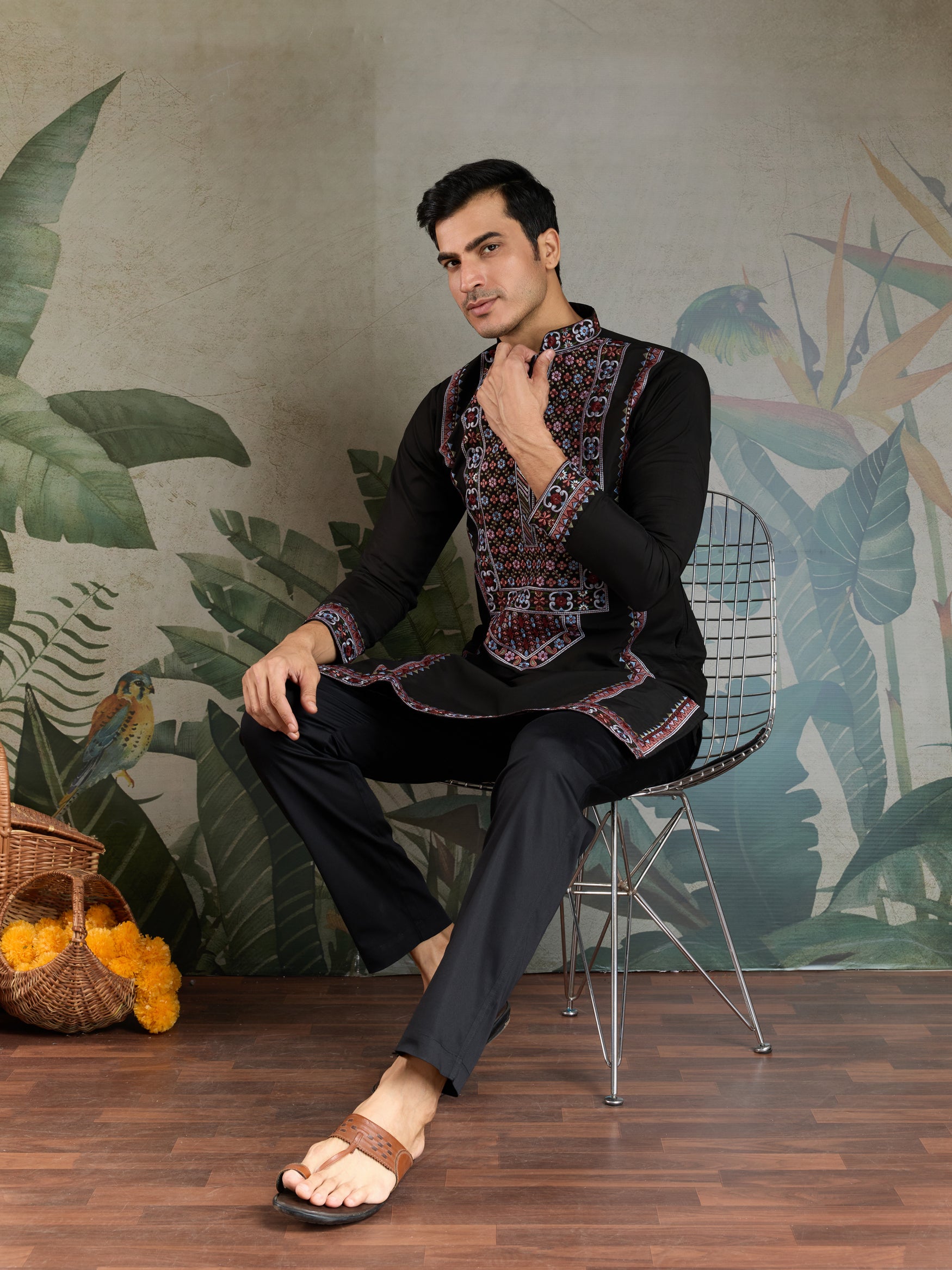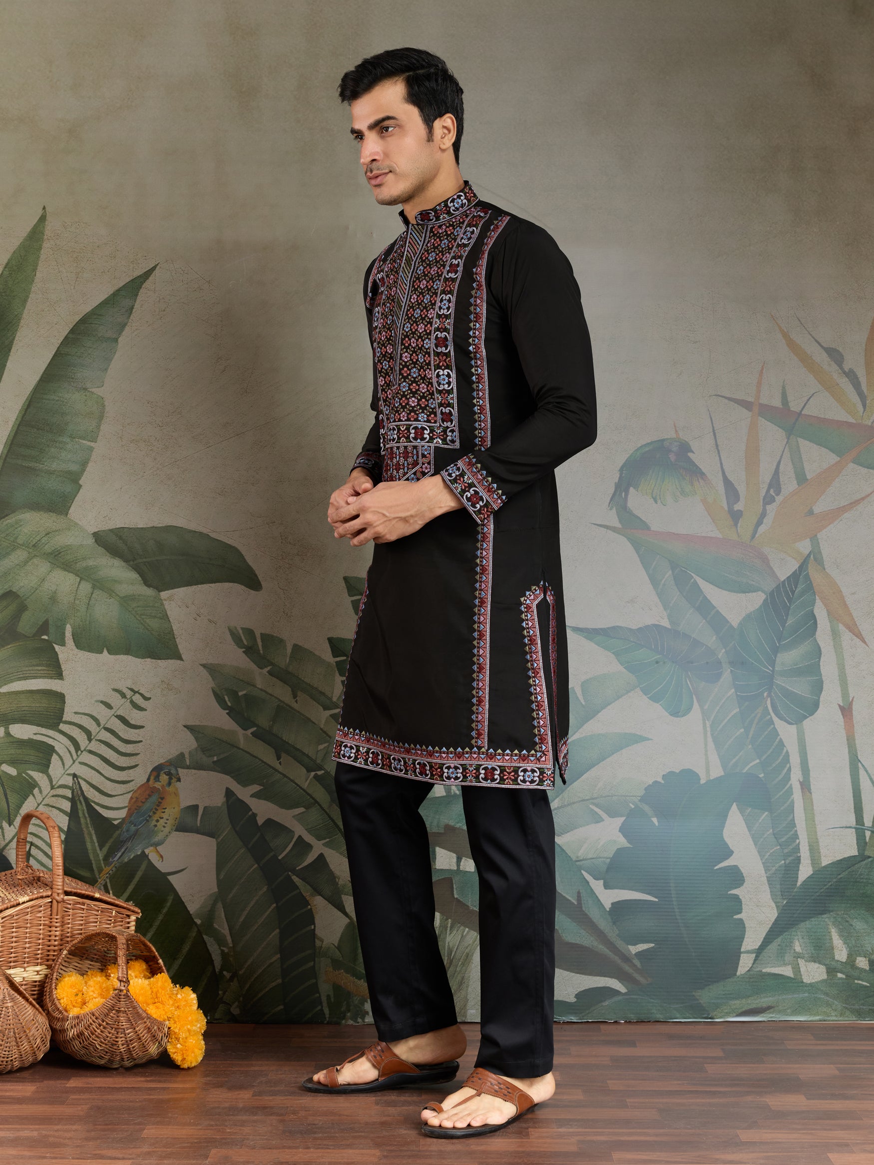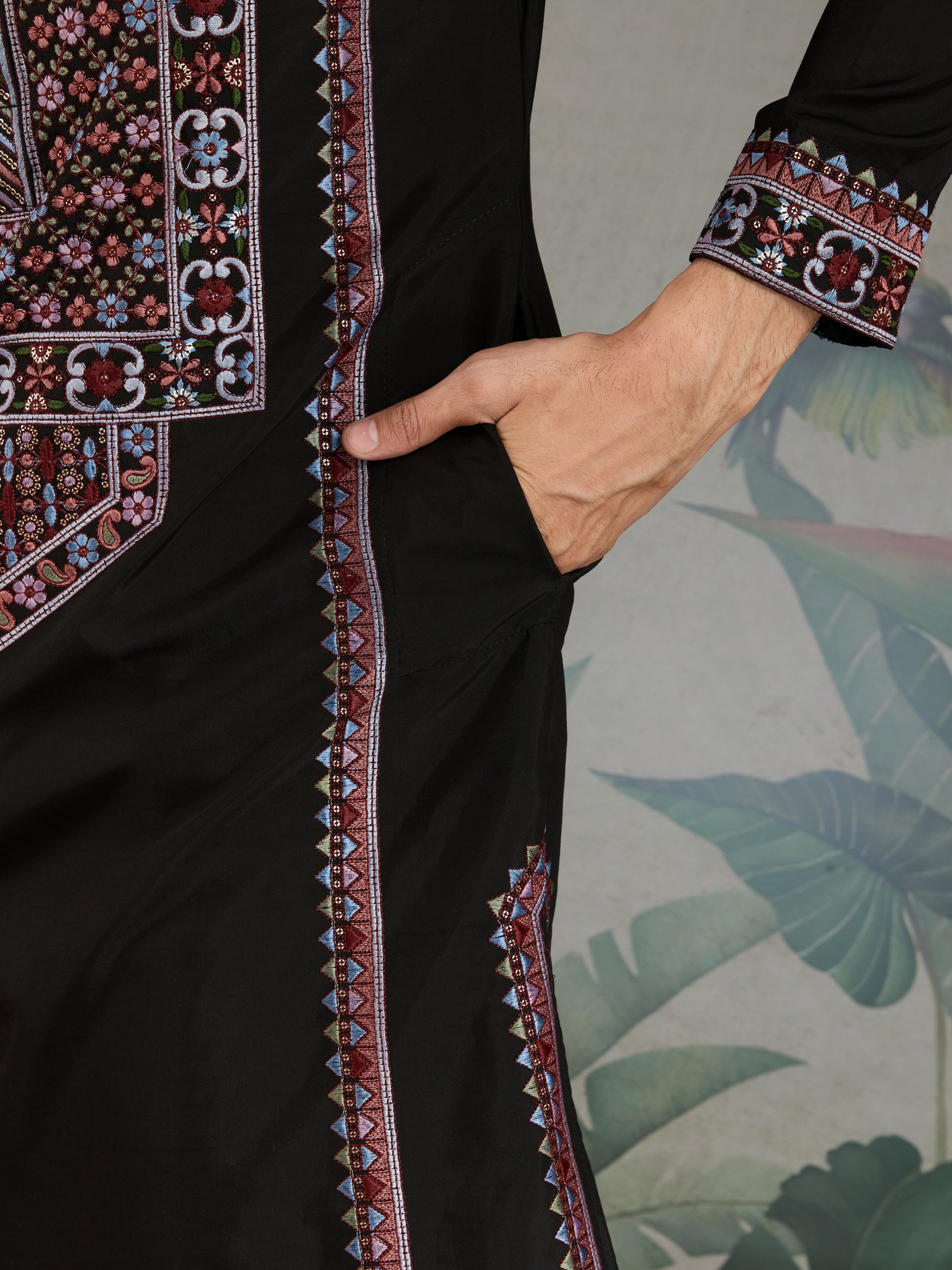 Black Men’s Kurta with Multicolor Embroidery – Premium Ethnic Wear