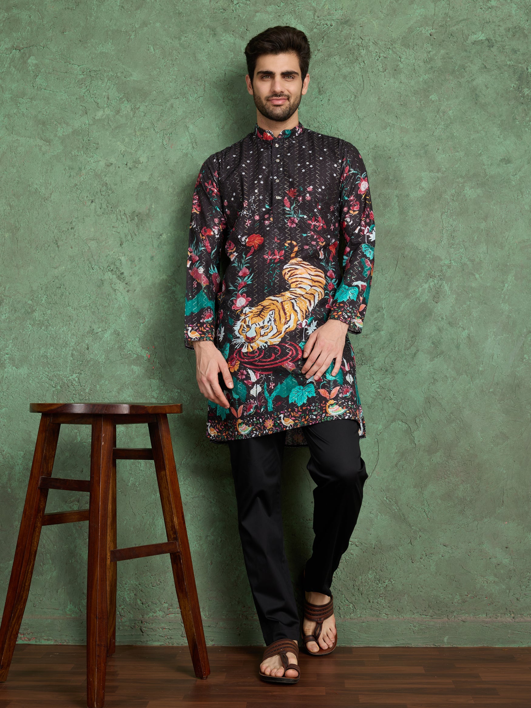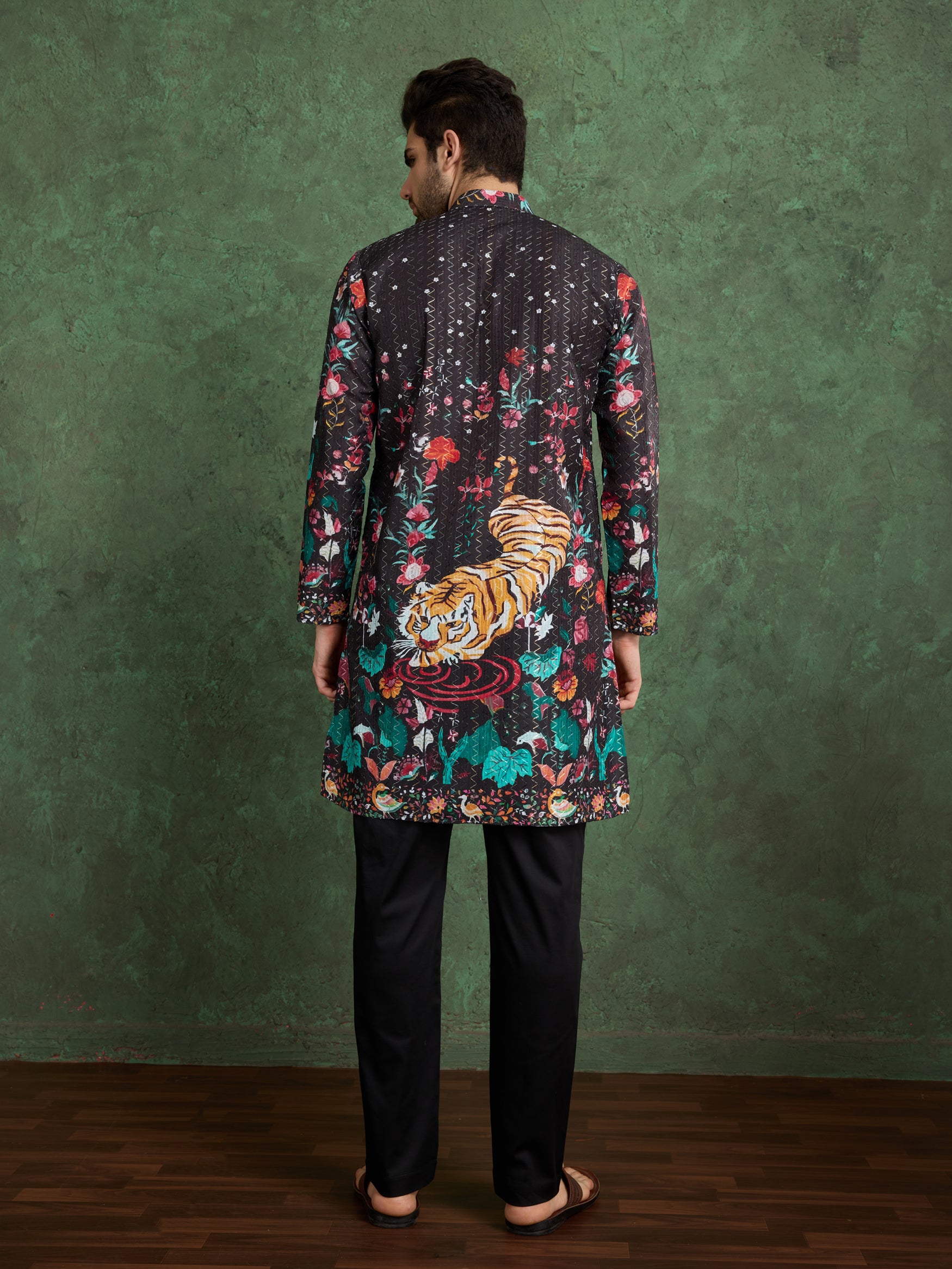 Make a bold style statement with this black tiger print kurta, designed for the modern man who loves to stand out. Featuring a striking tiger motif surrounded by vibrant floral and forest-inspired patterns, this kurta is a true blend of power and elegance.