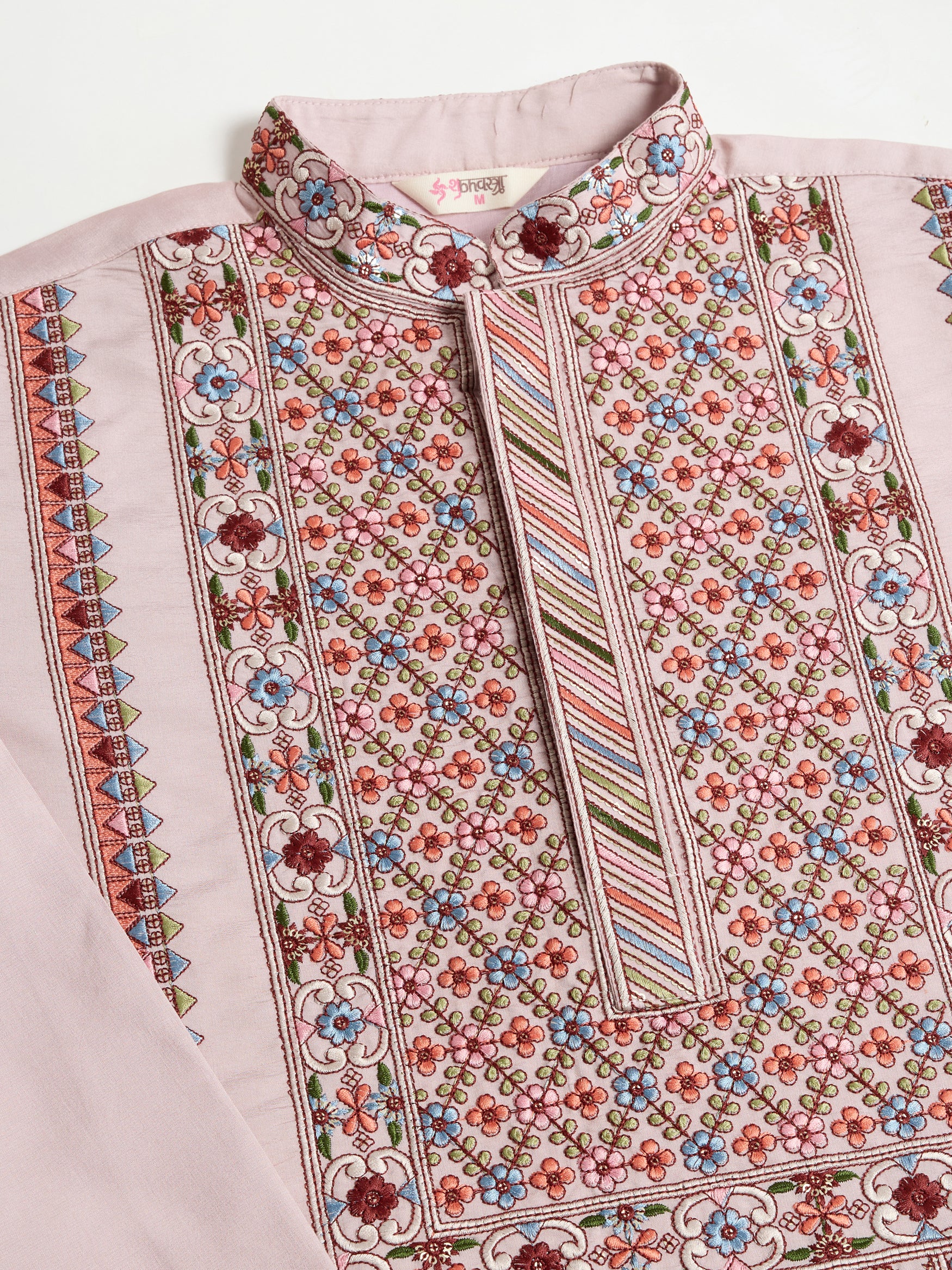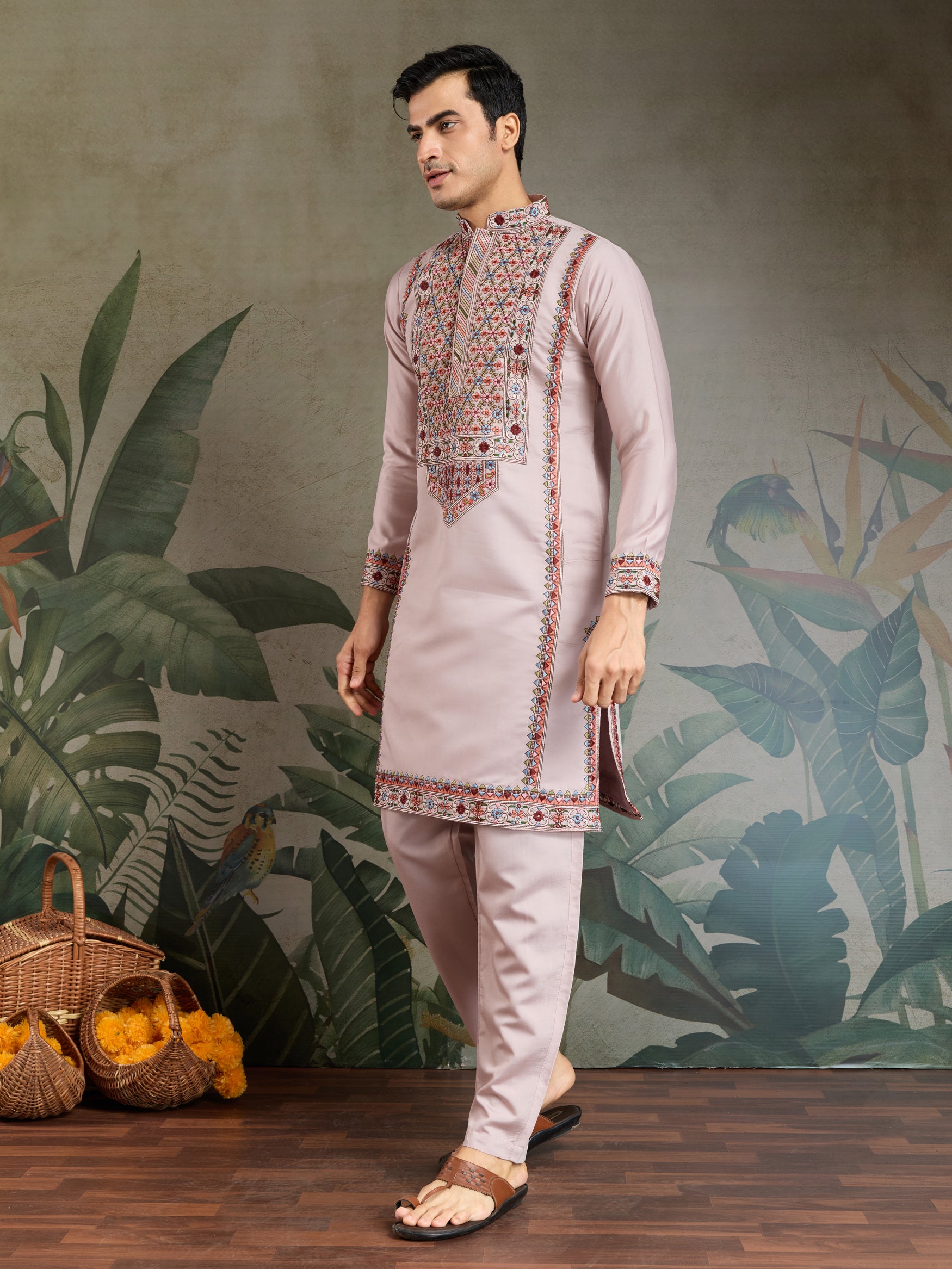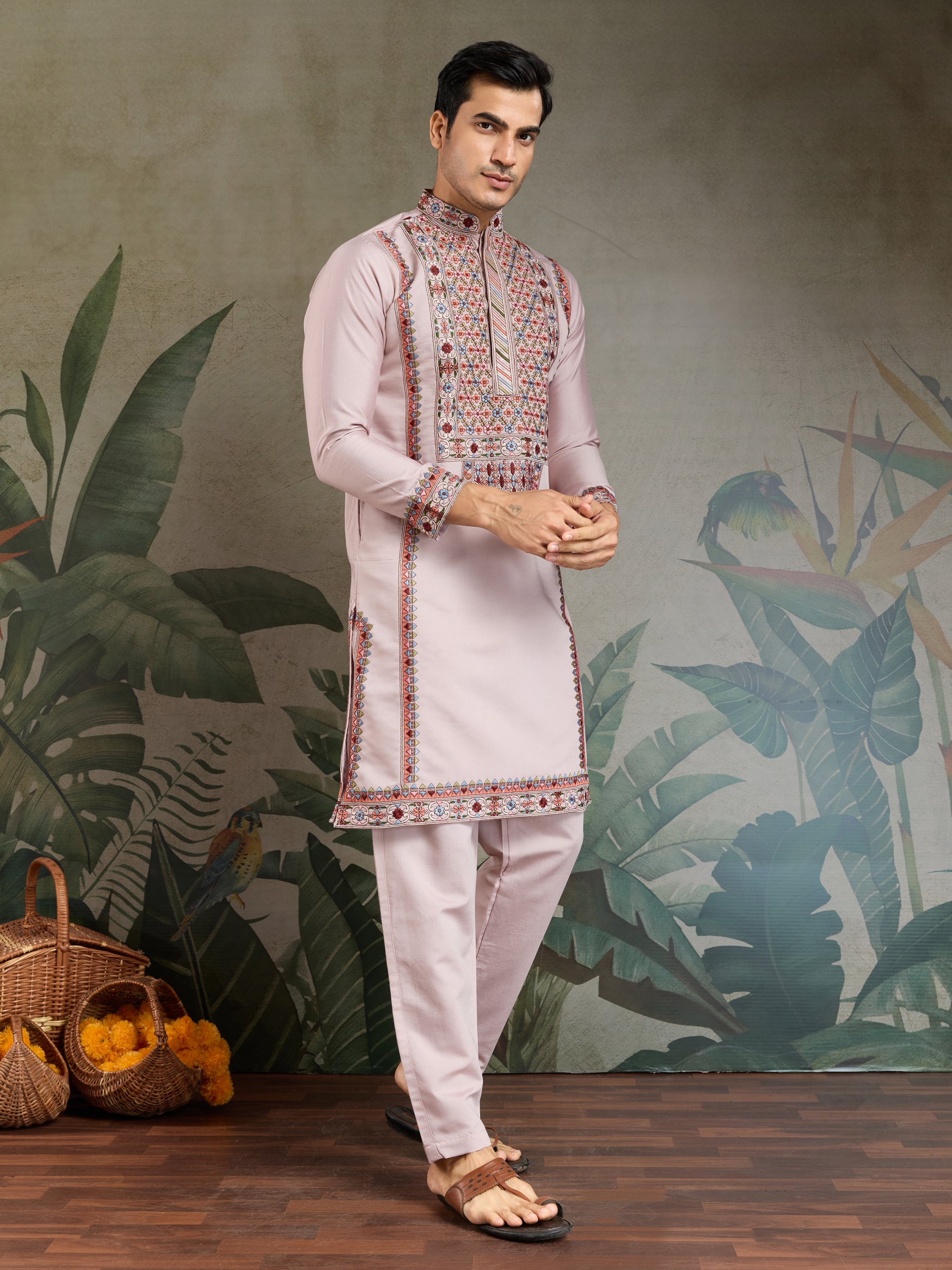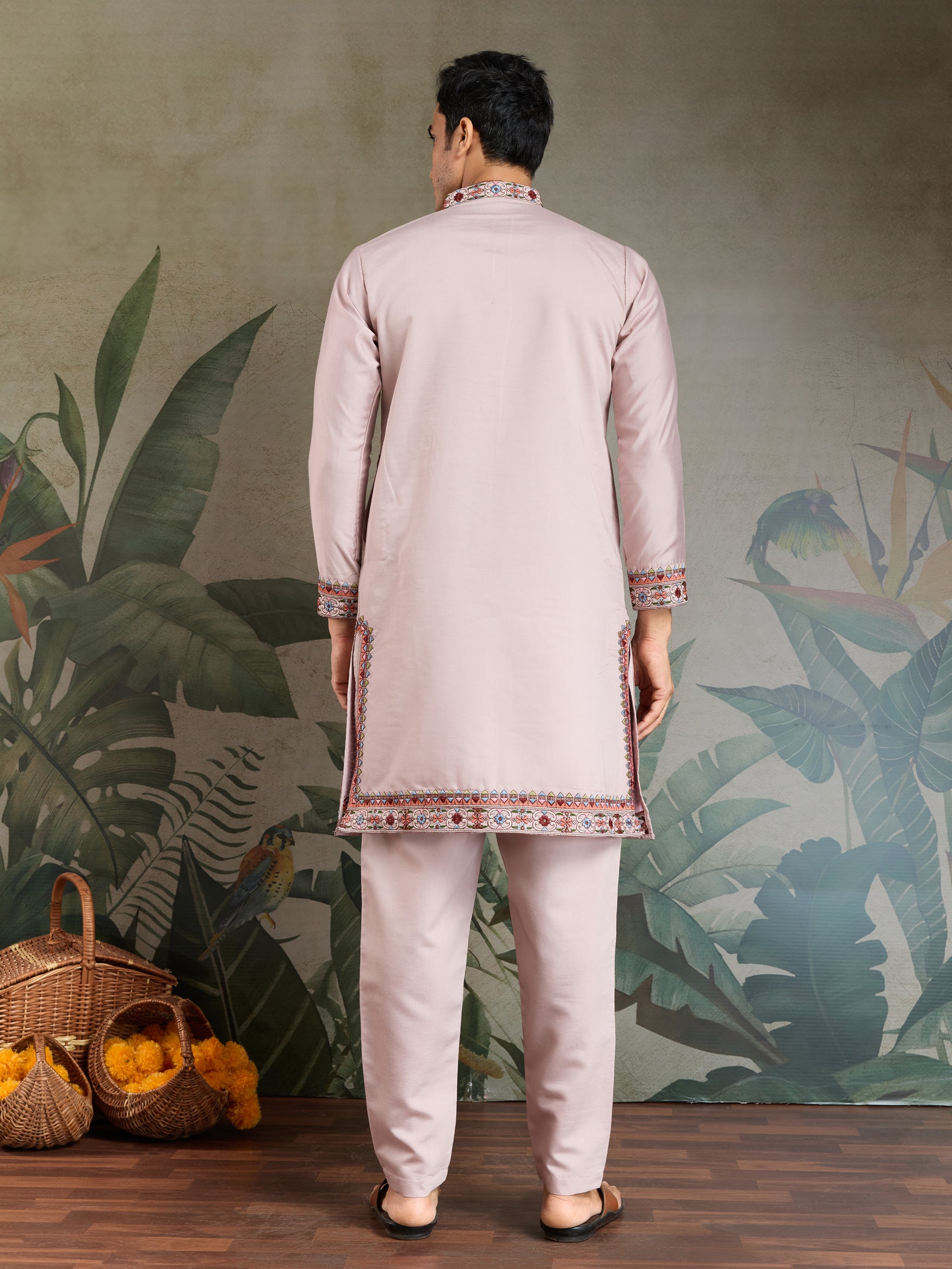 Blush Pink Men’s Kurta with Multicolor Kashmiri-Inspired Embroidery