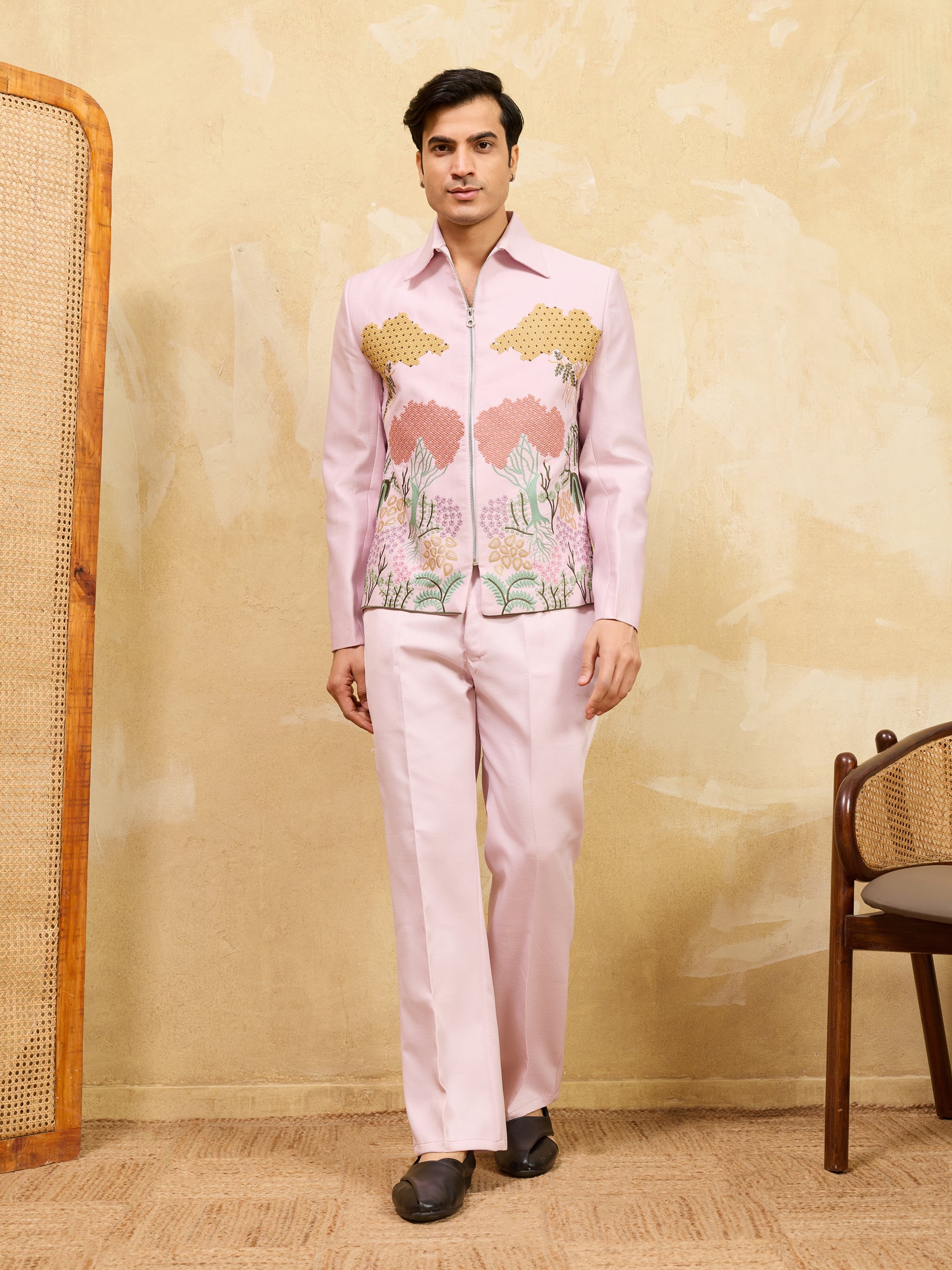 Designed in a soft blush pink hue, this contemporary jacket features exquisite botanical embroidery inspired by blooming gardens. Intricate threadwork in muted gold, dusty rose, sage green, and soft lilac creates a striking layered composition across the chest and hem, adding depth, texture, and visual richness to the ensemble.
