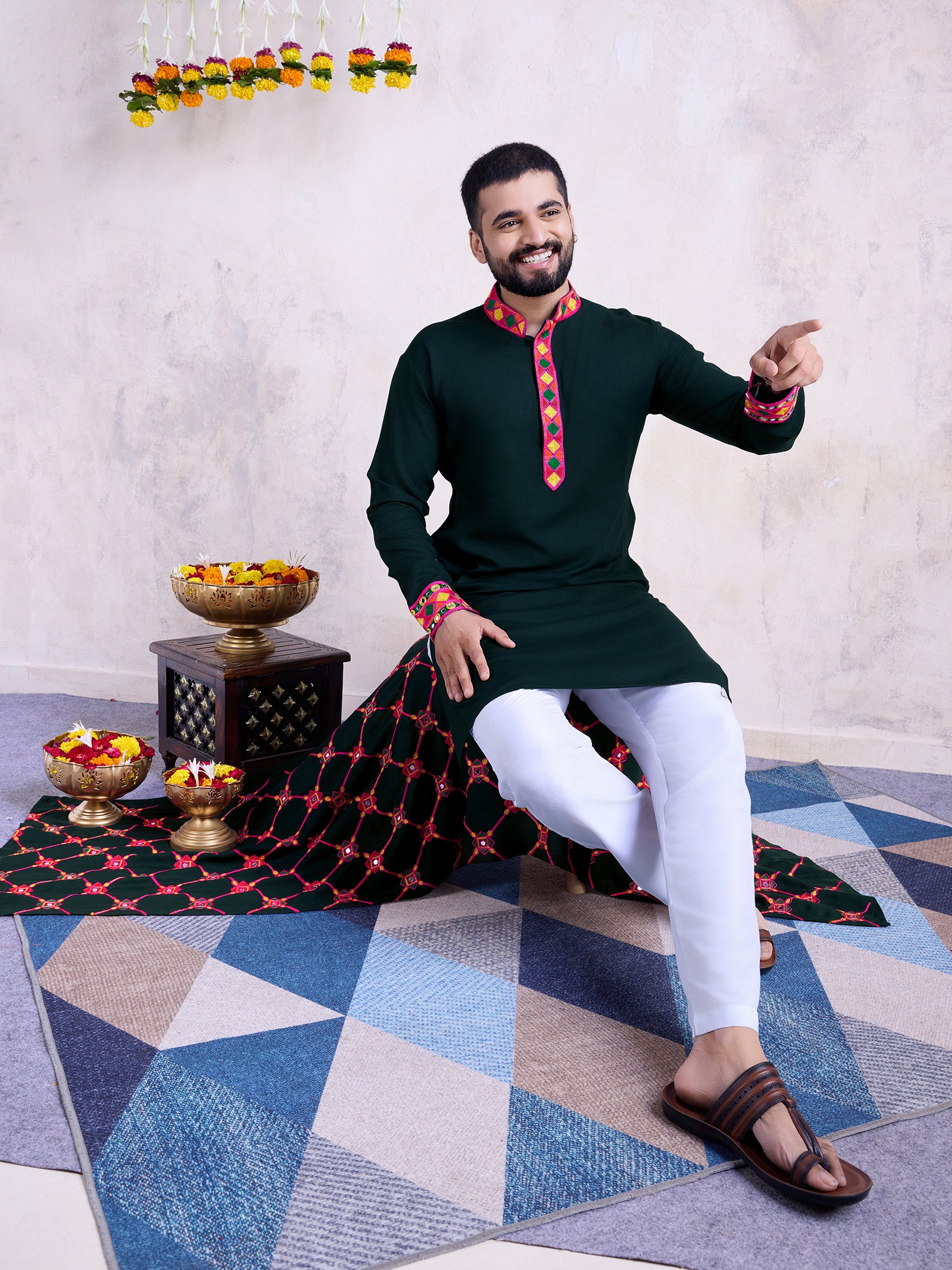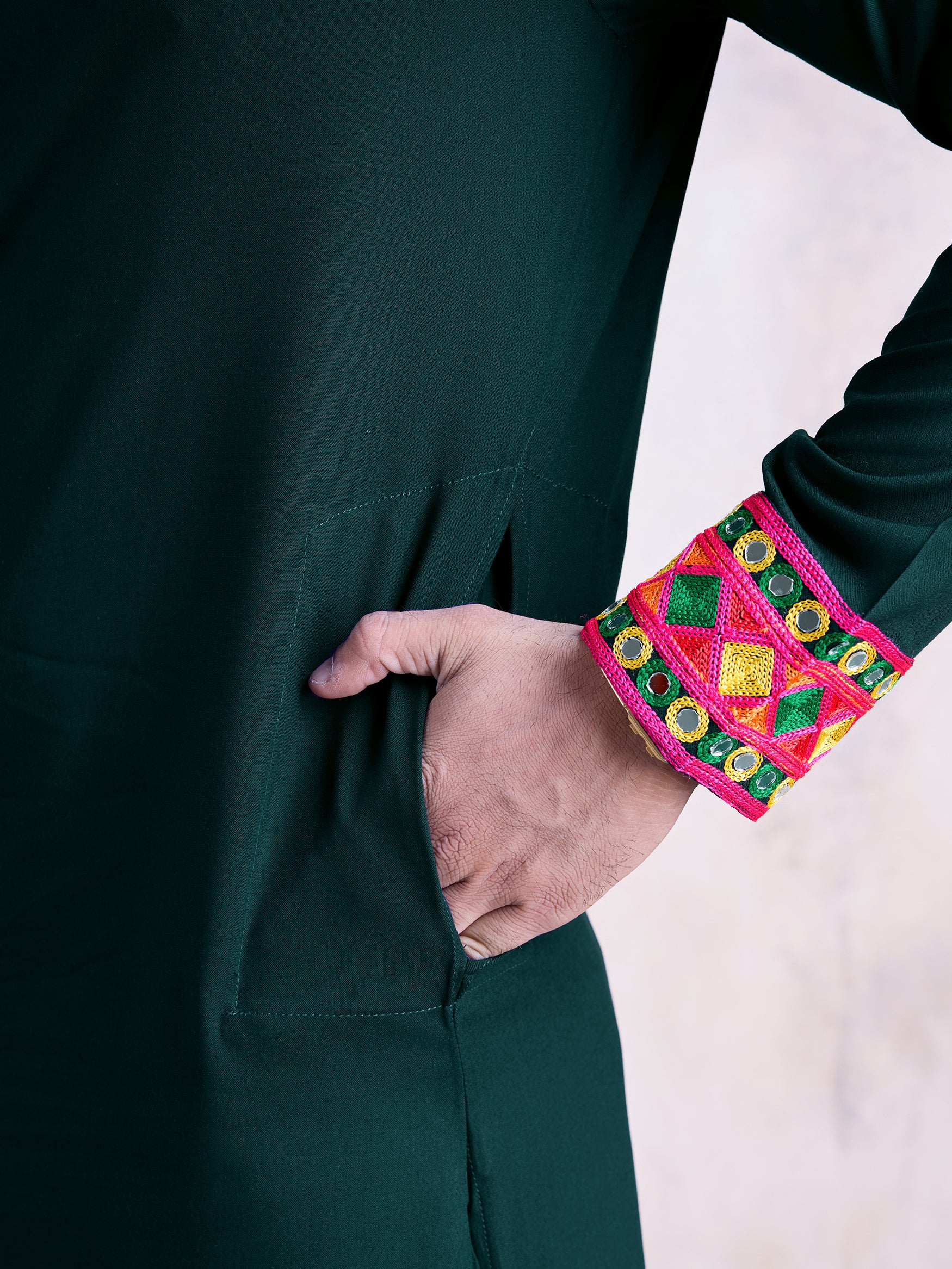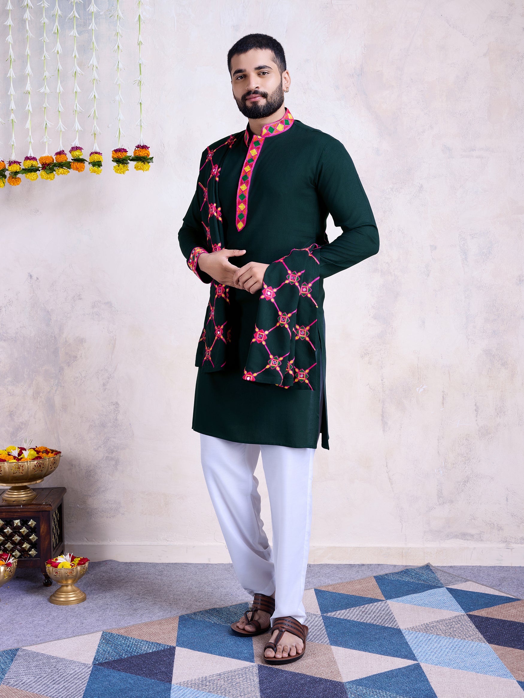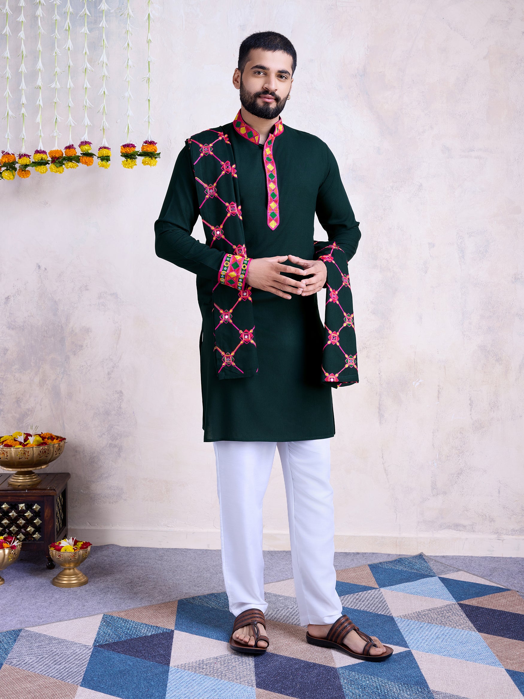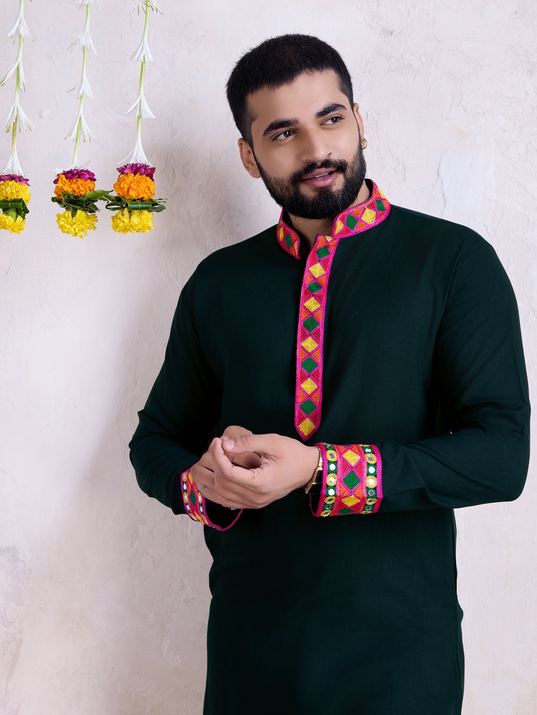 Bring timeless elegance to your festive wardrobe with this dark green kurta featuring vibrant geometric embroidery along the neckline, collar, and cuffs. The rich detailing in pink, yellow, and orange threadwork with mirror accents adds a festive sparkle, making it a perfect pick for weddings, cultural gatherings, and celebrations.