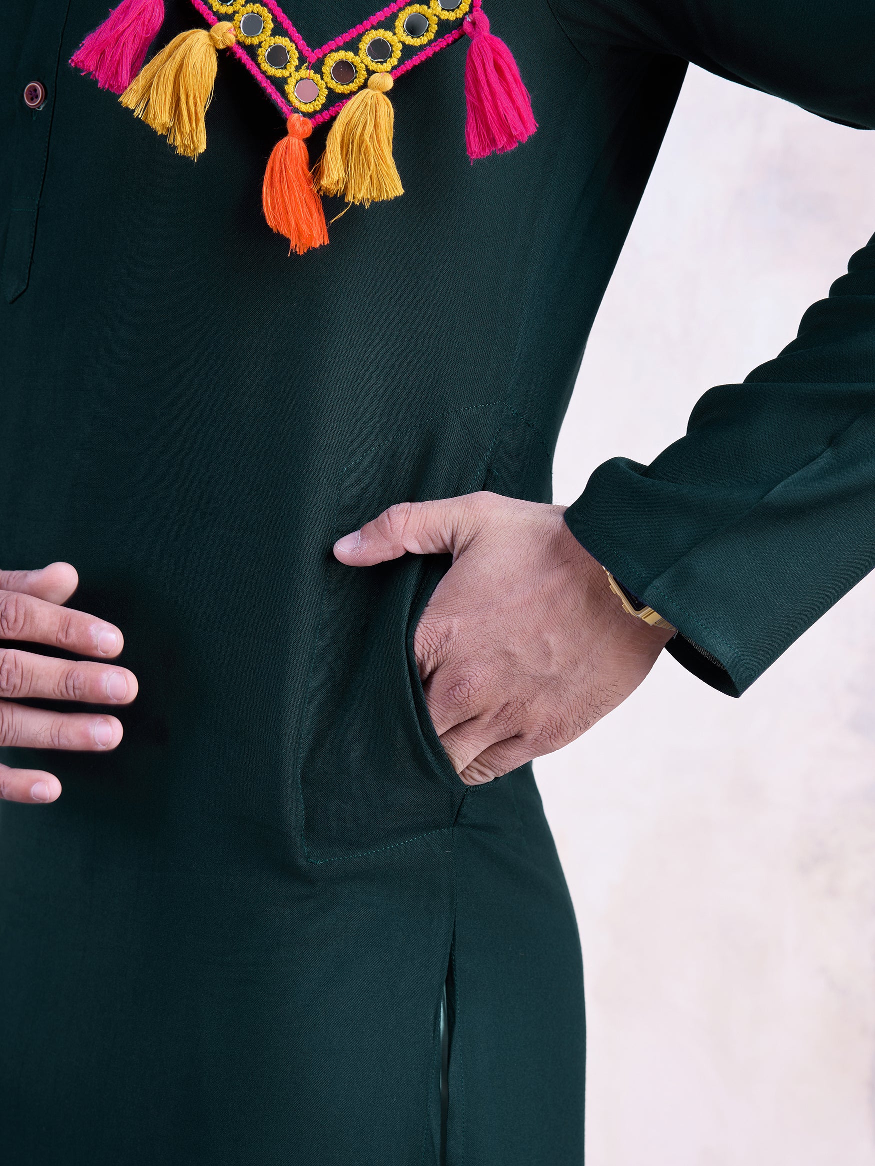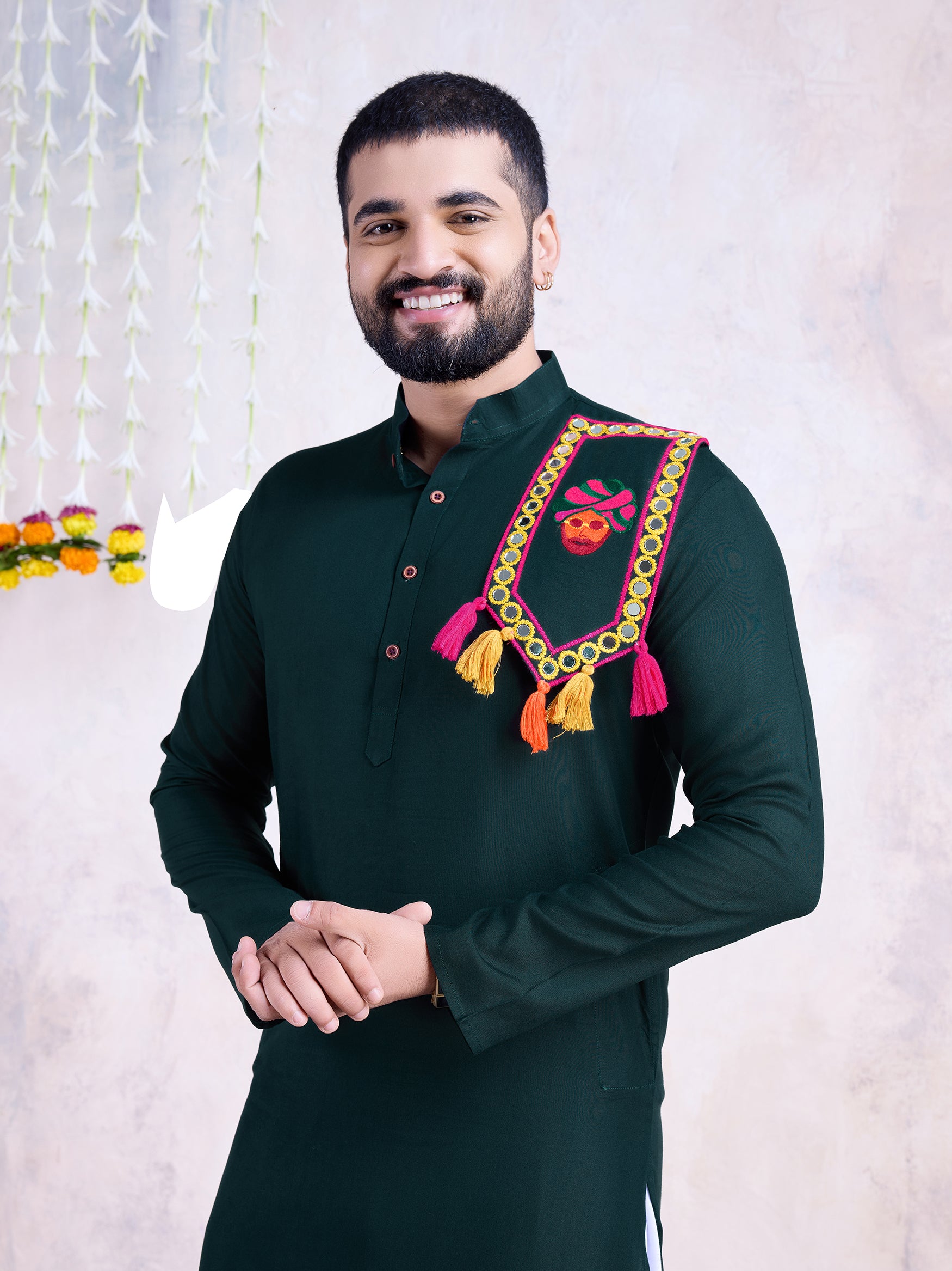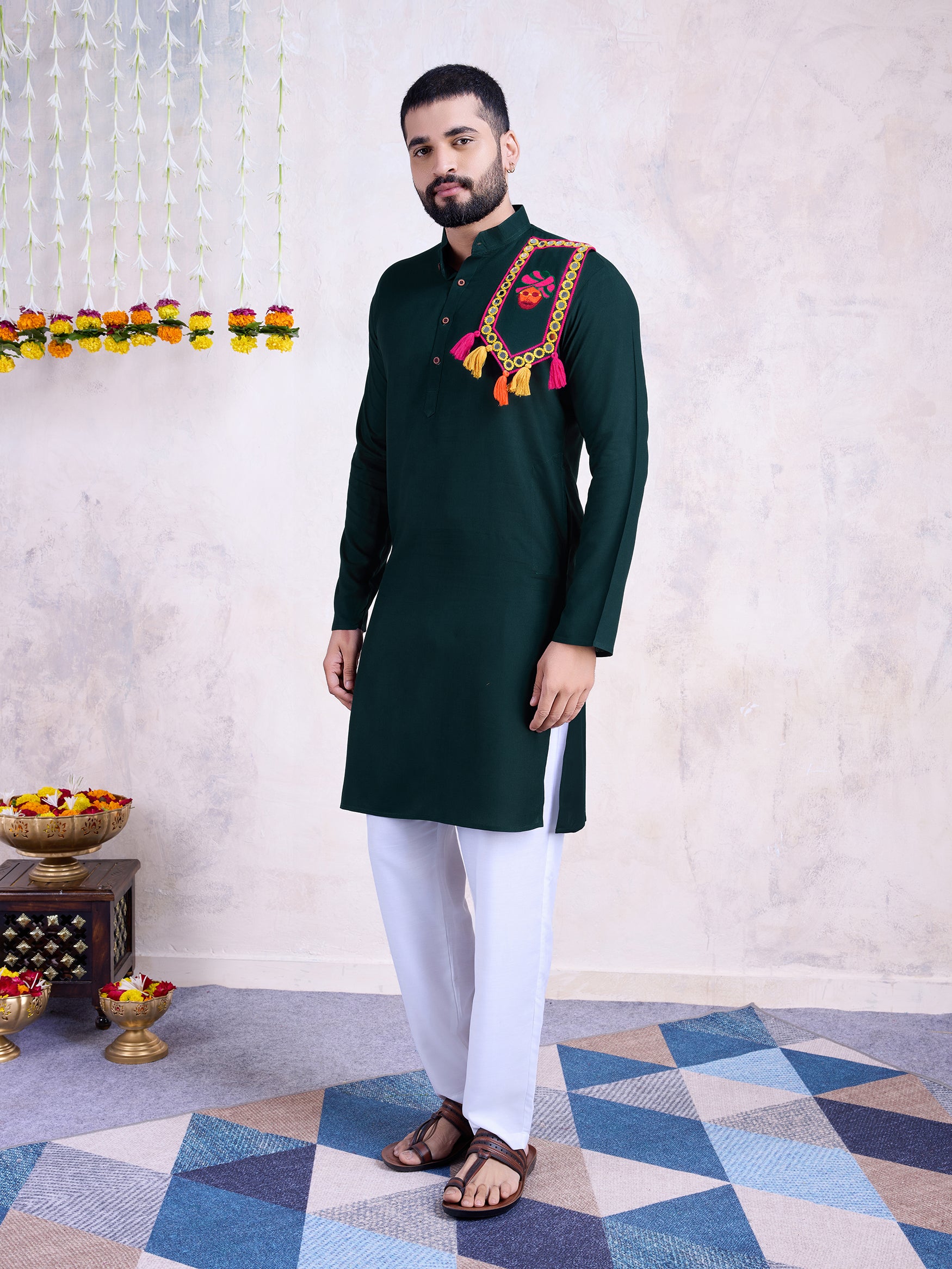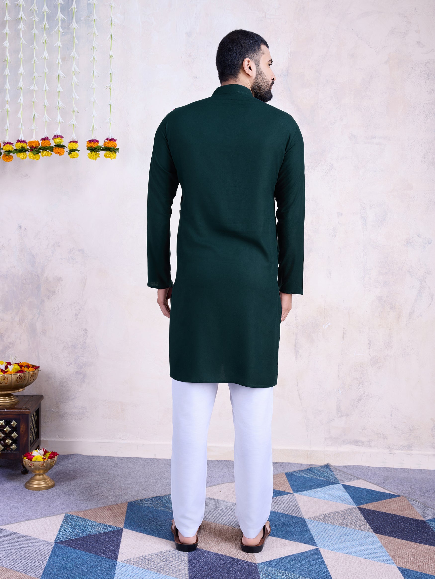 Keep it classic yet festive with this dark green solid kurta , designed for effortless elegance. The minimal design of the kurta makes it versatile and timeless, while the vibrant embroidered festive adds a pop of tradition and celebration to your look.