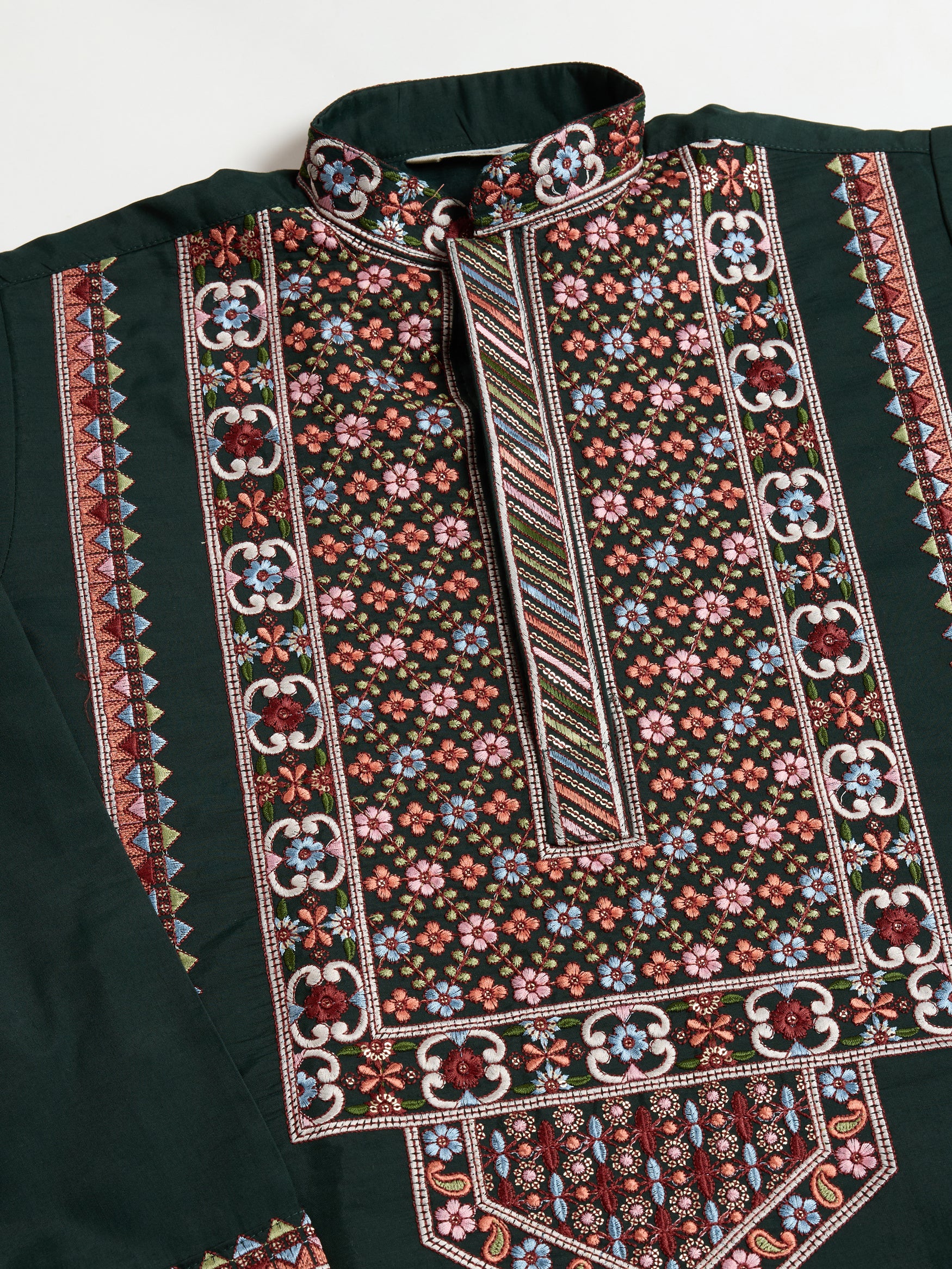 · Rich dark green base with intricate multicolor embroidery