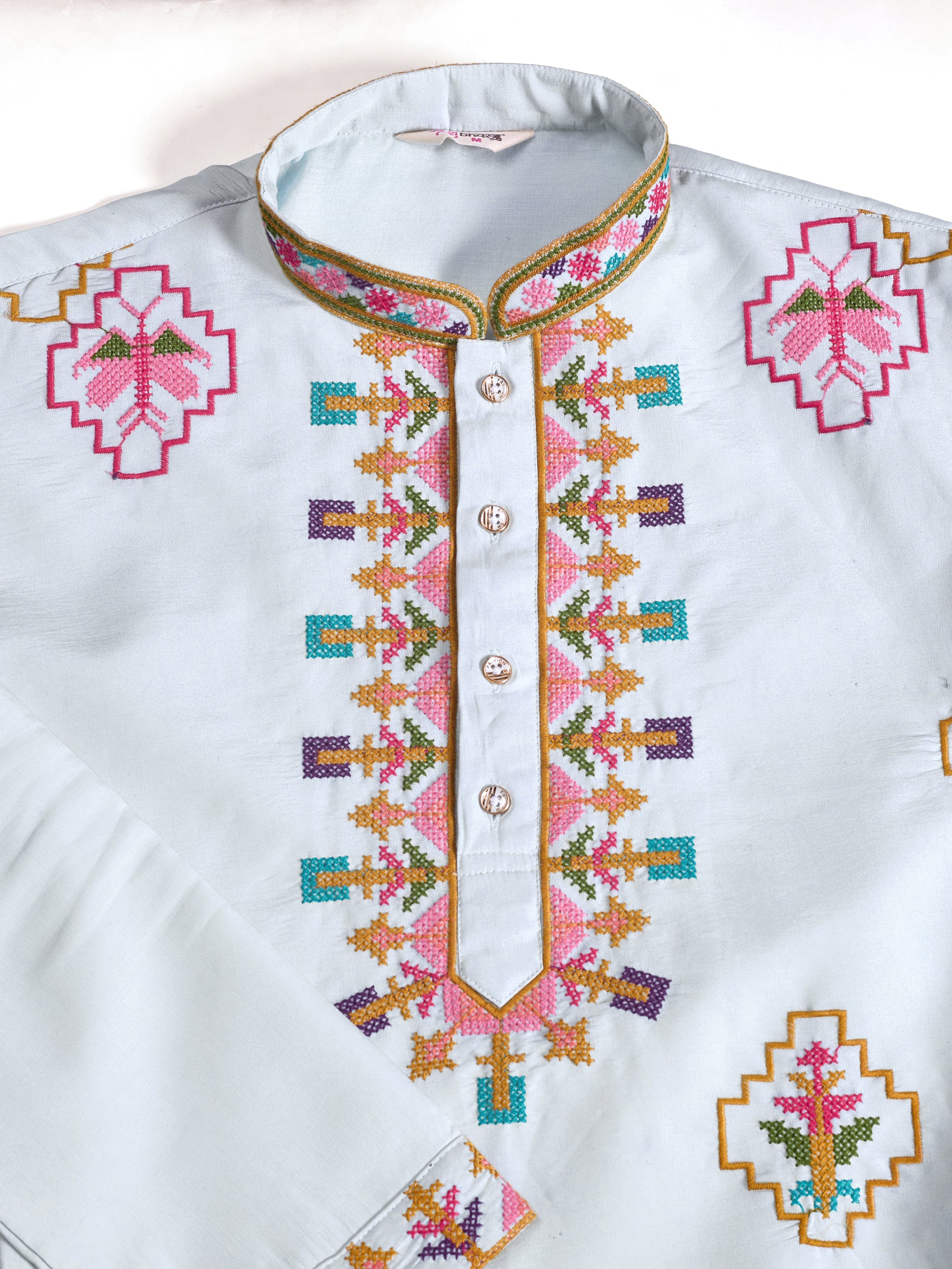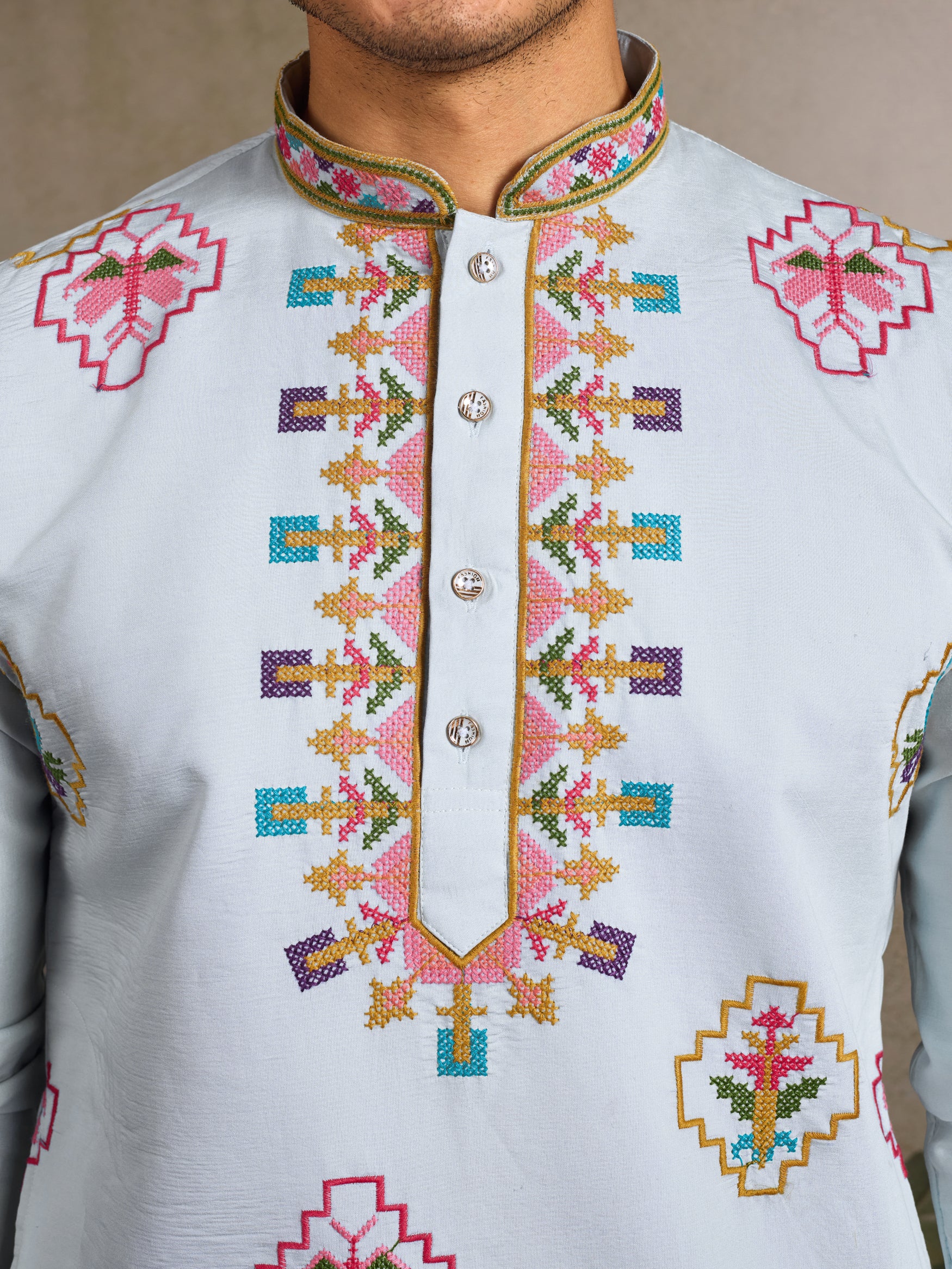 Elegant Sky Blue Kurta with Multicolor Embroidery for Men