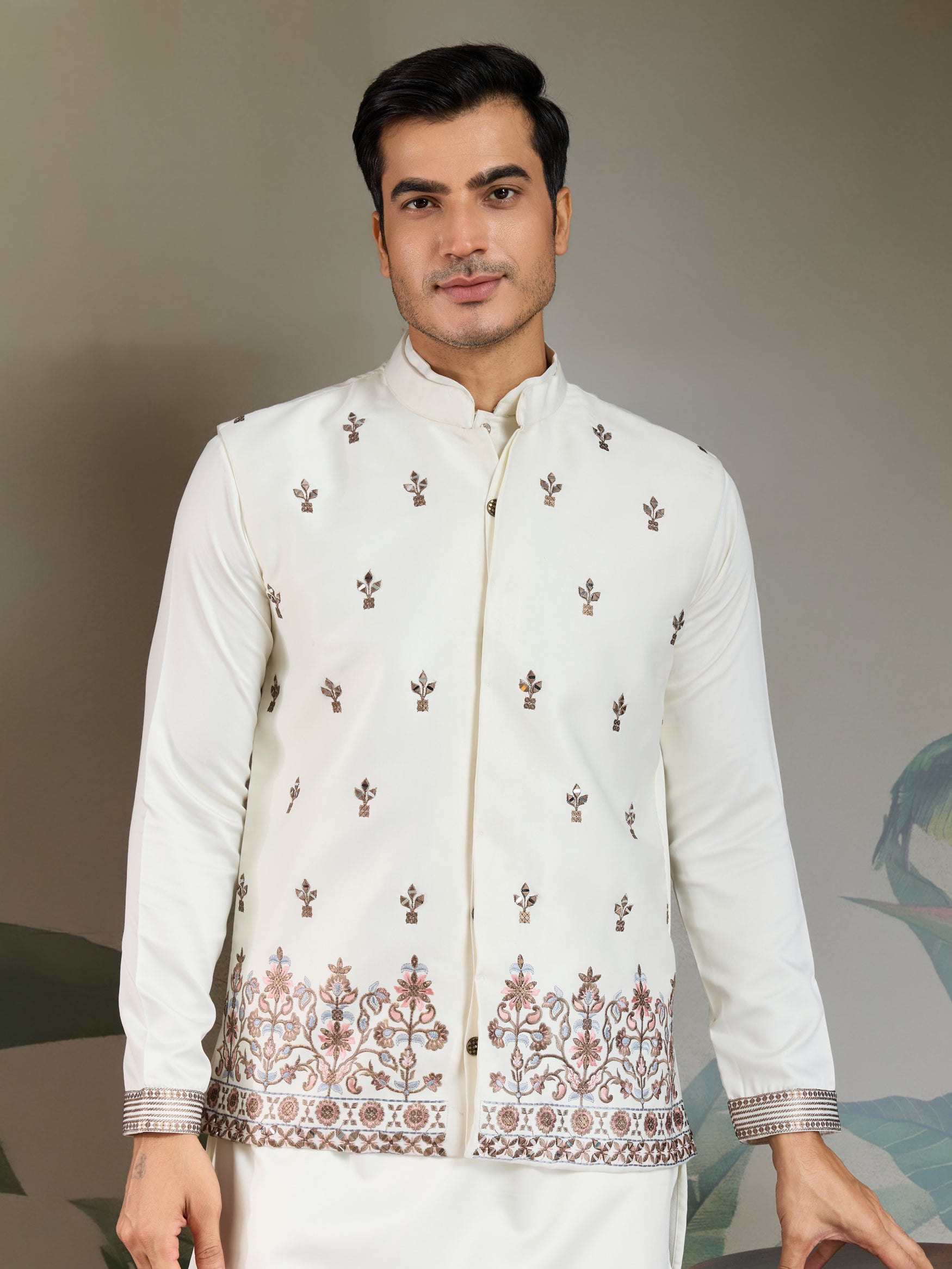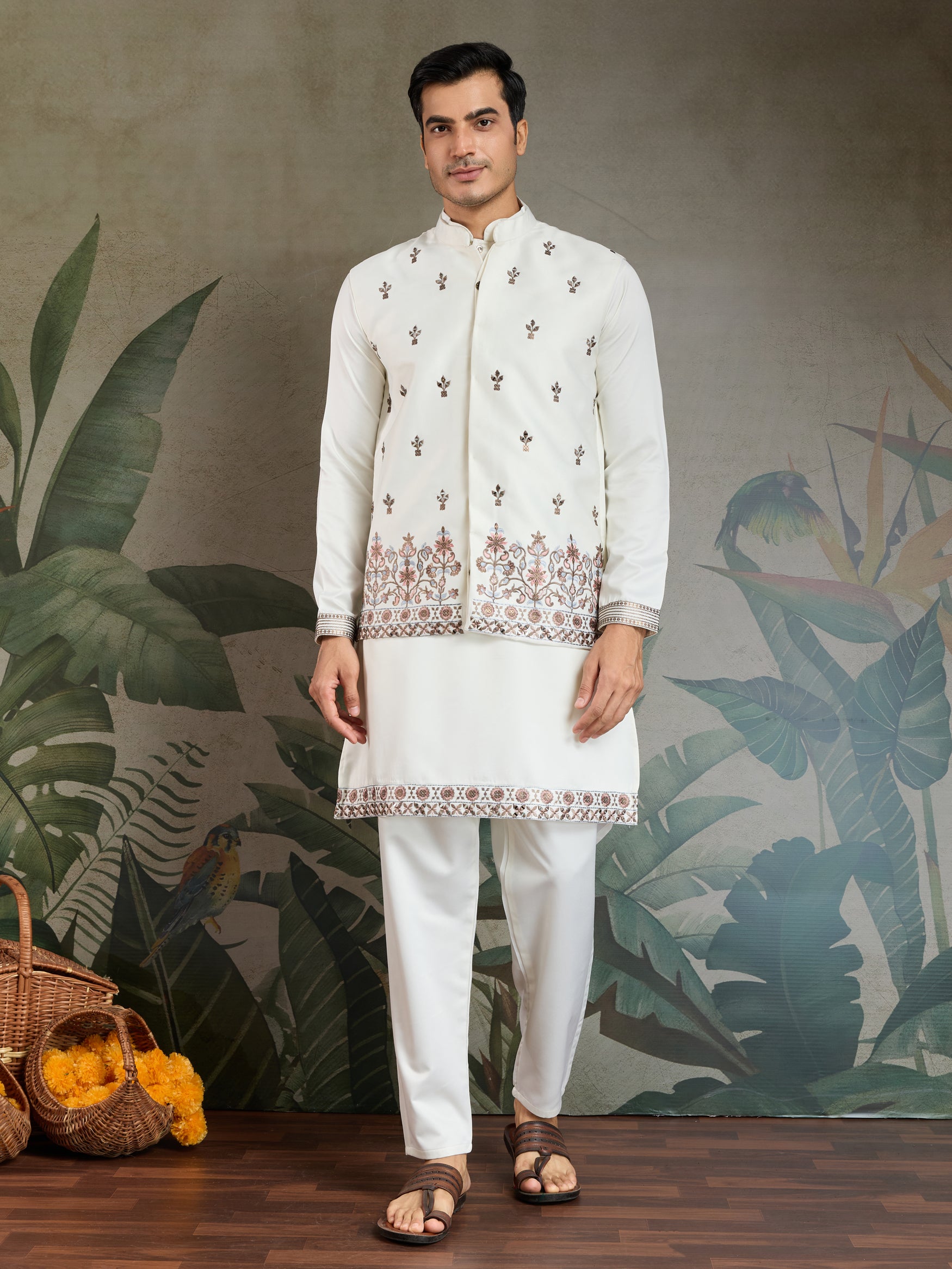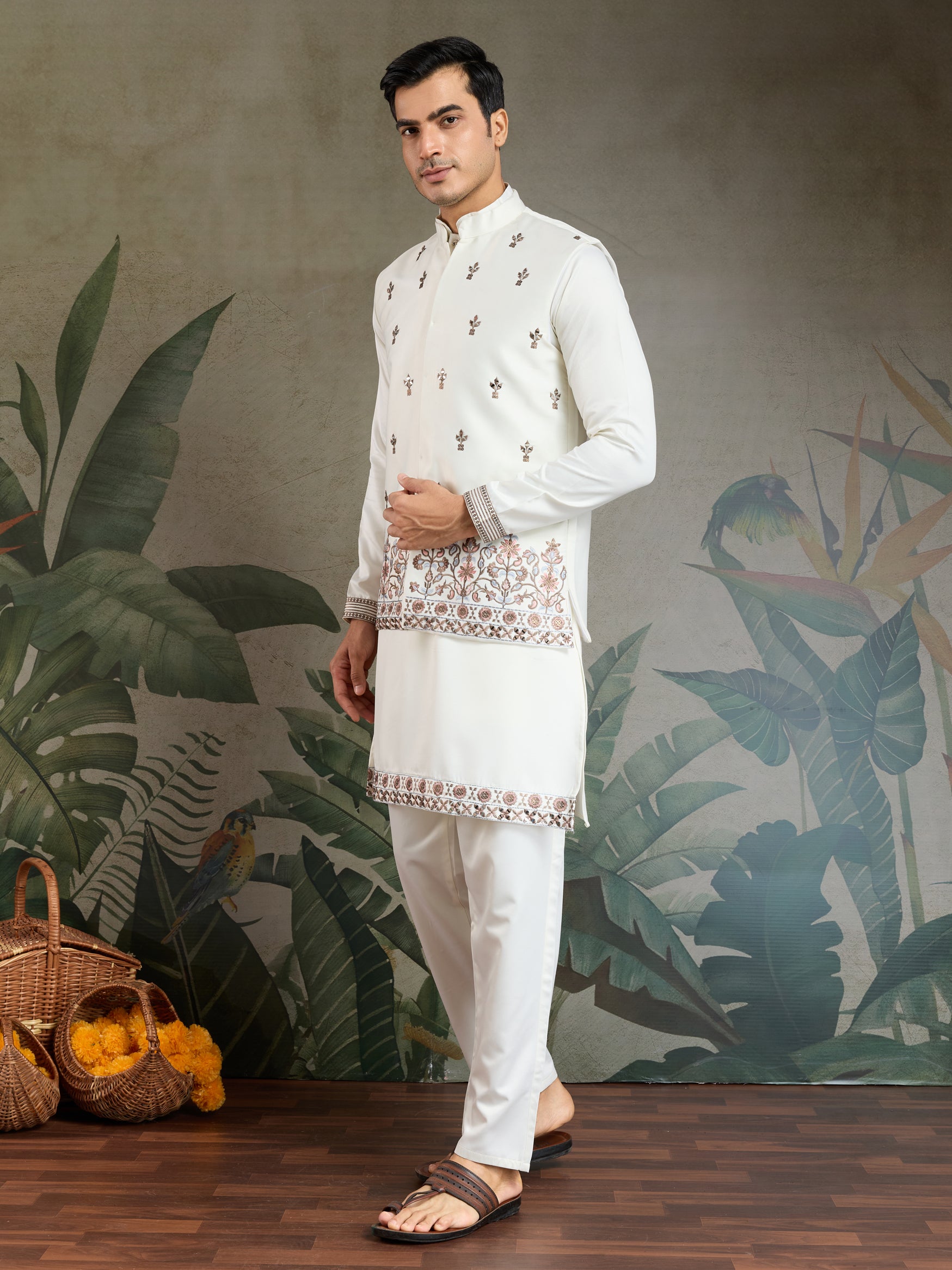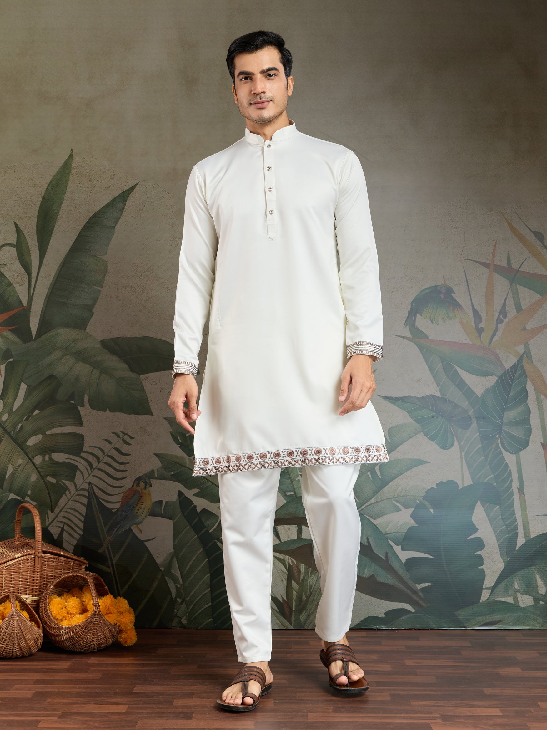 Make a sophisticated statement with this classic white kurta set, designed with fine embroidery and modern elegance. Crafted from premium fabric, the kurta features intricate floral embroidery along the hemline, cuffs, and front panel, giving it a regal touch. The straight-cut pants add to the sleek silhouette, while the mandarin collar brings in a refined ethnic charm.