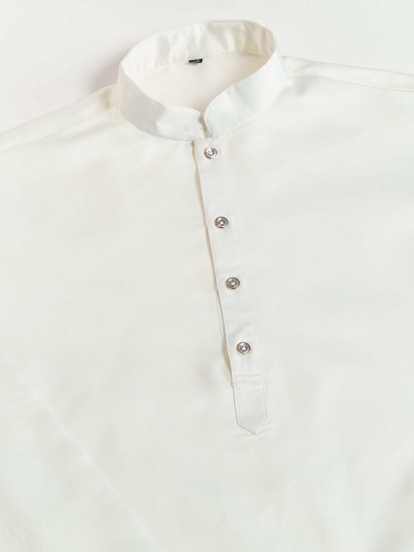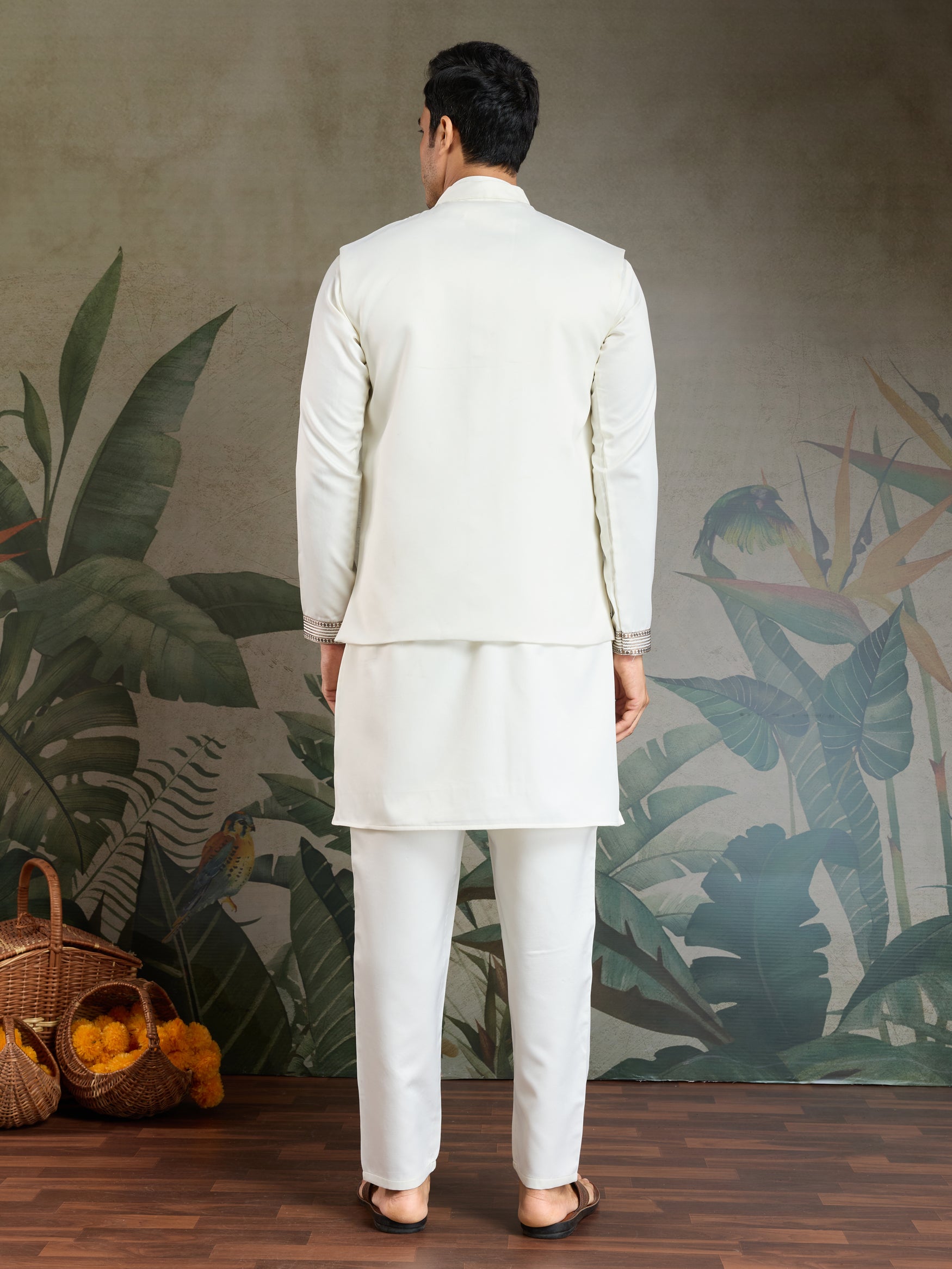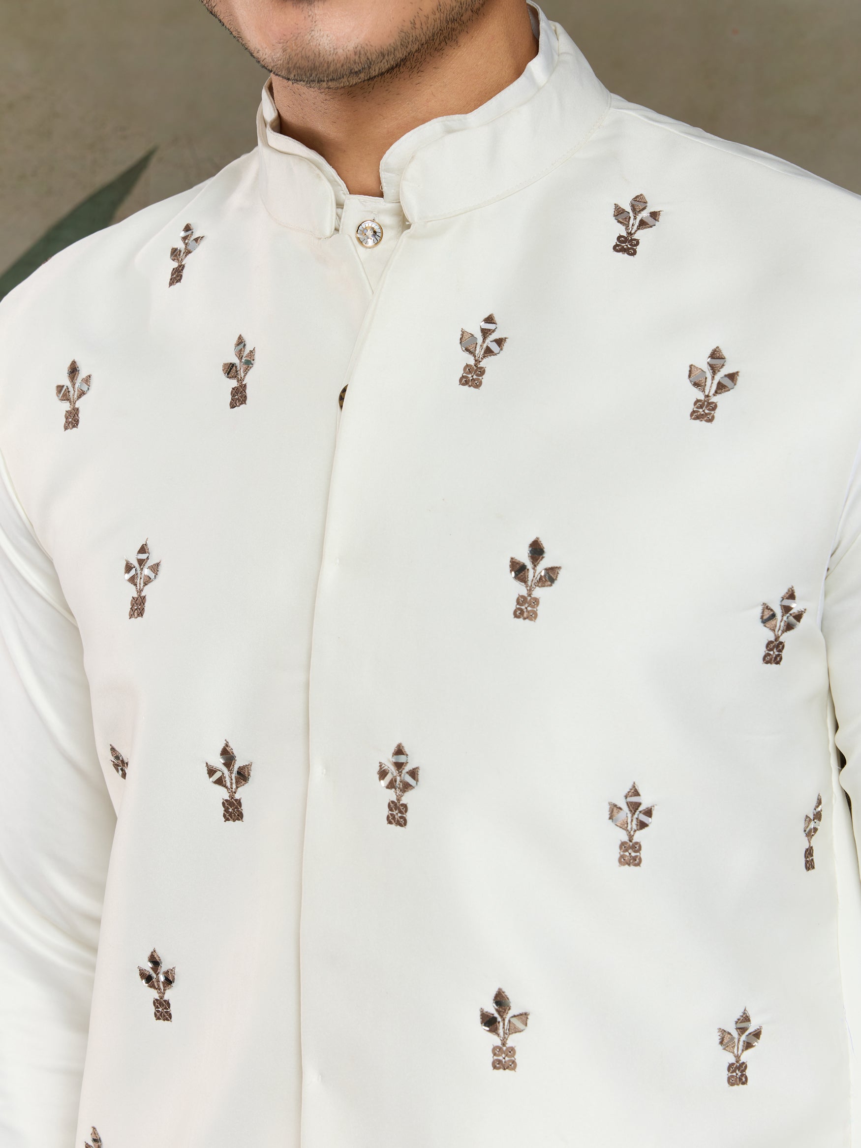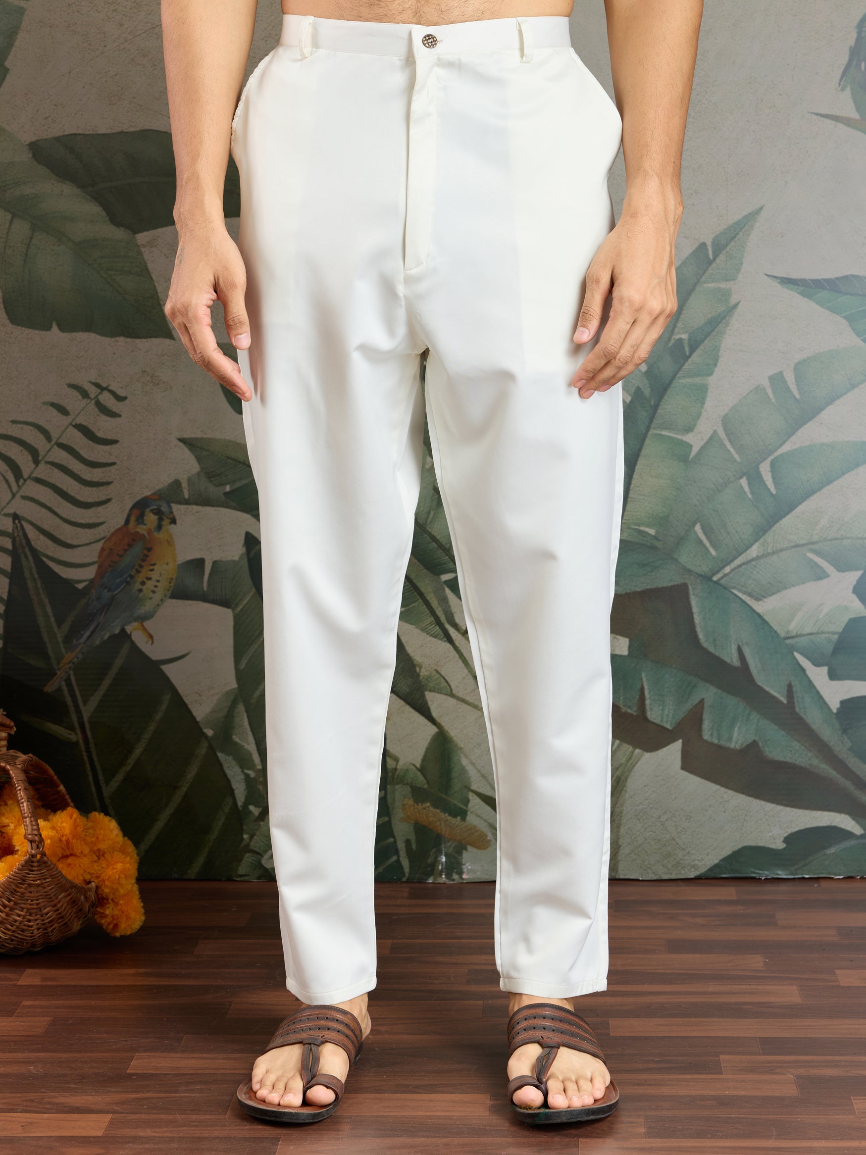 Make a sophisticated statement with this classic white kurta set, designed with fine embroidery and modern elegance. Crafted from premium fabric, the kurta features intricate floral embroidery along the hemline, cuffs, and front panel, giving it a regal touch. The straight-cut pants add to the sleek silhouette, while the mandarin collar brings in a refined ethnic charm.