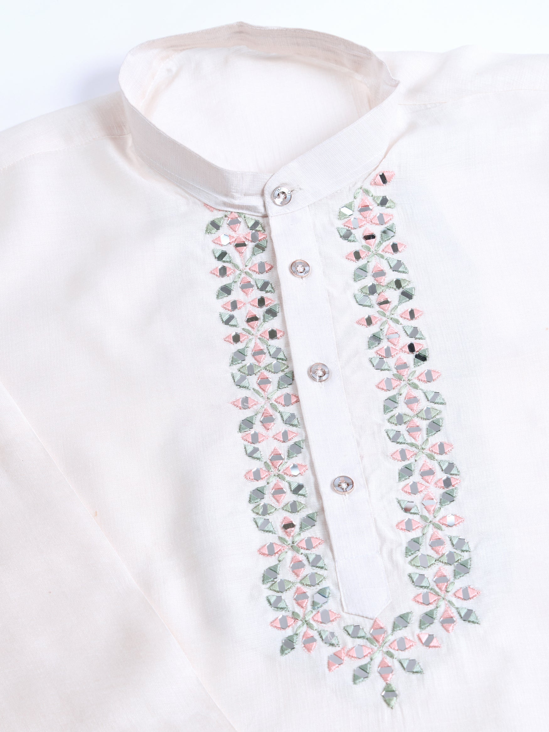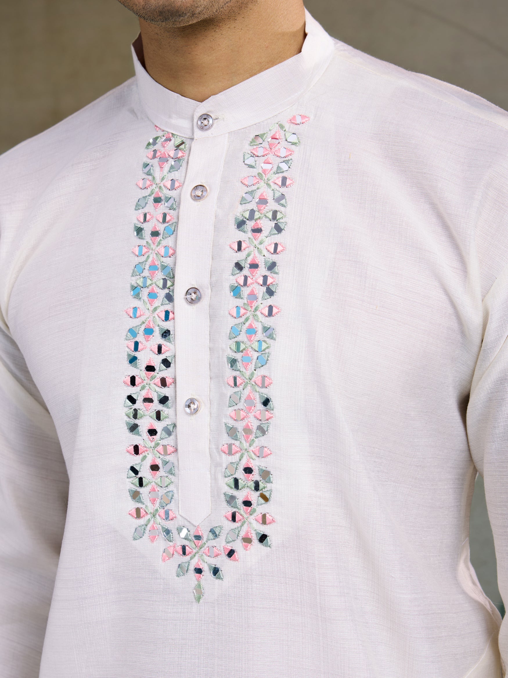 Elegant White Kurta with Mirror & Thread Embroidery and Printed Nehru Jacket