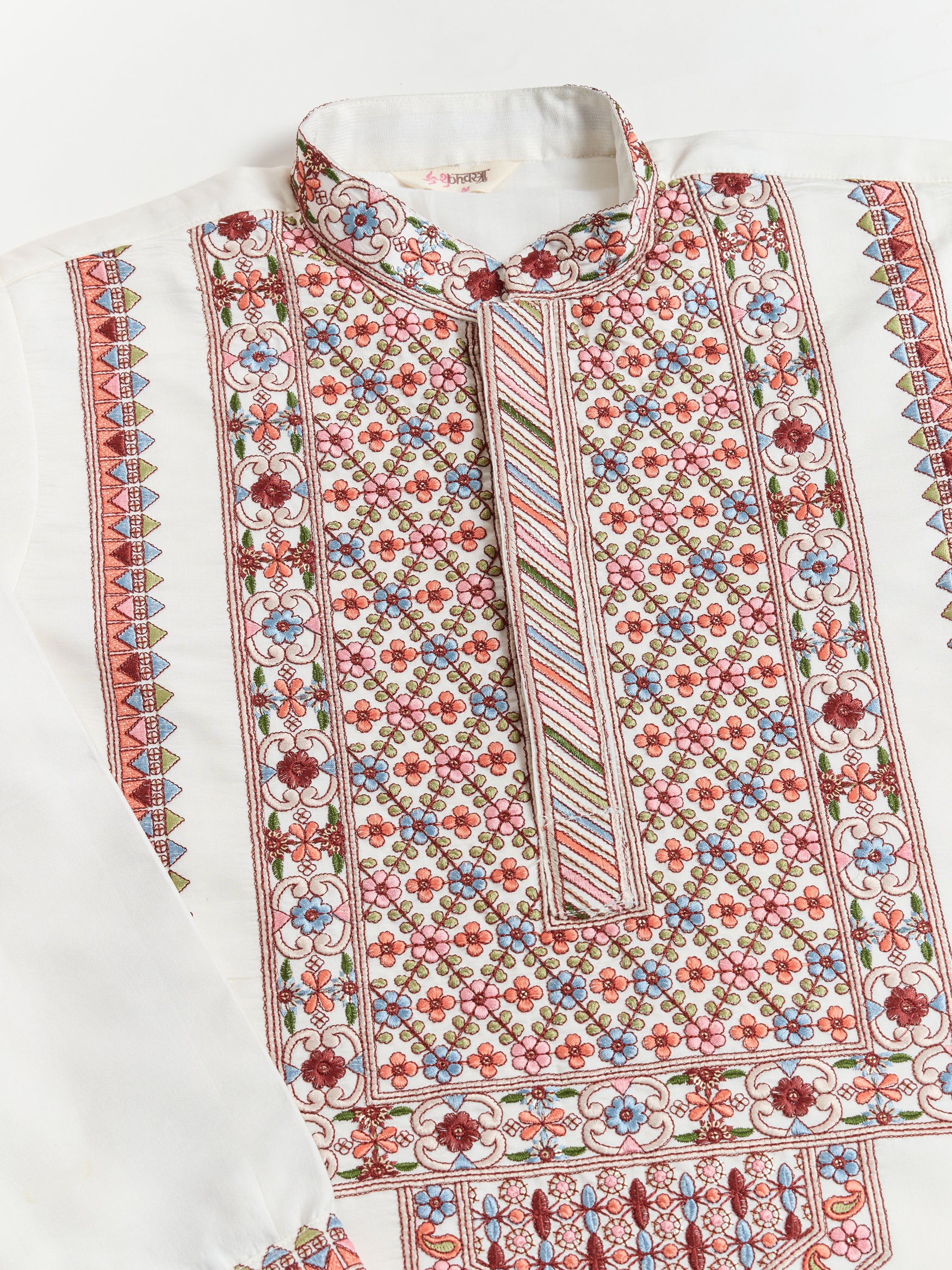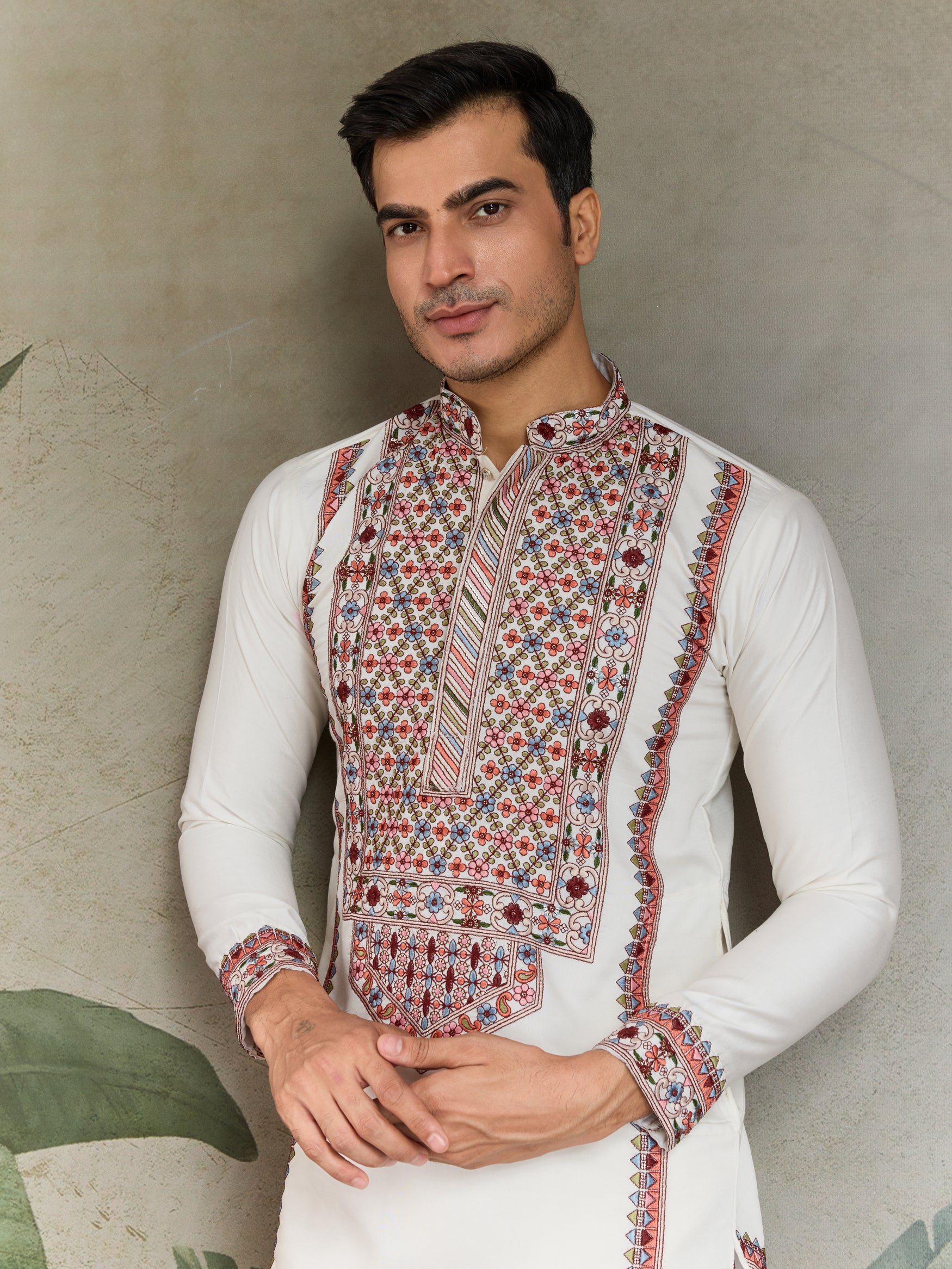 Elegant White Kurta with Multicolor Kashmiri Embroidery – Festive & Ethnic Wear