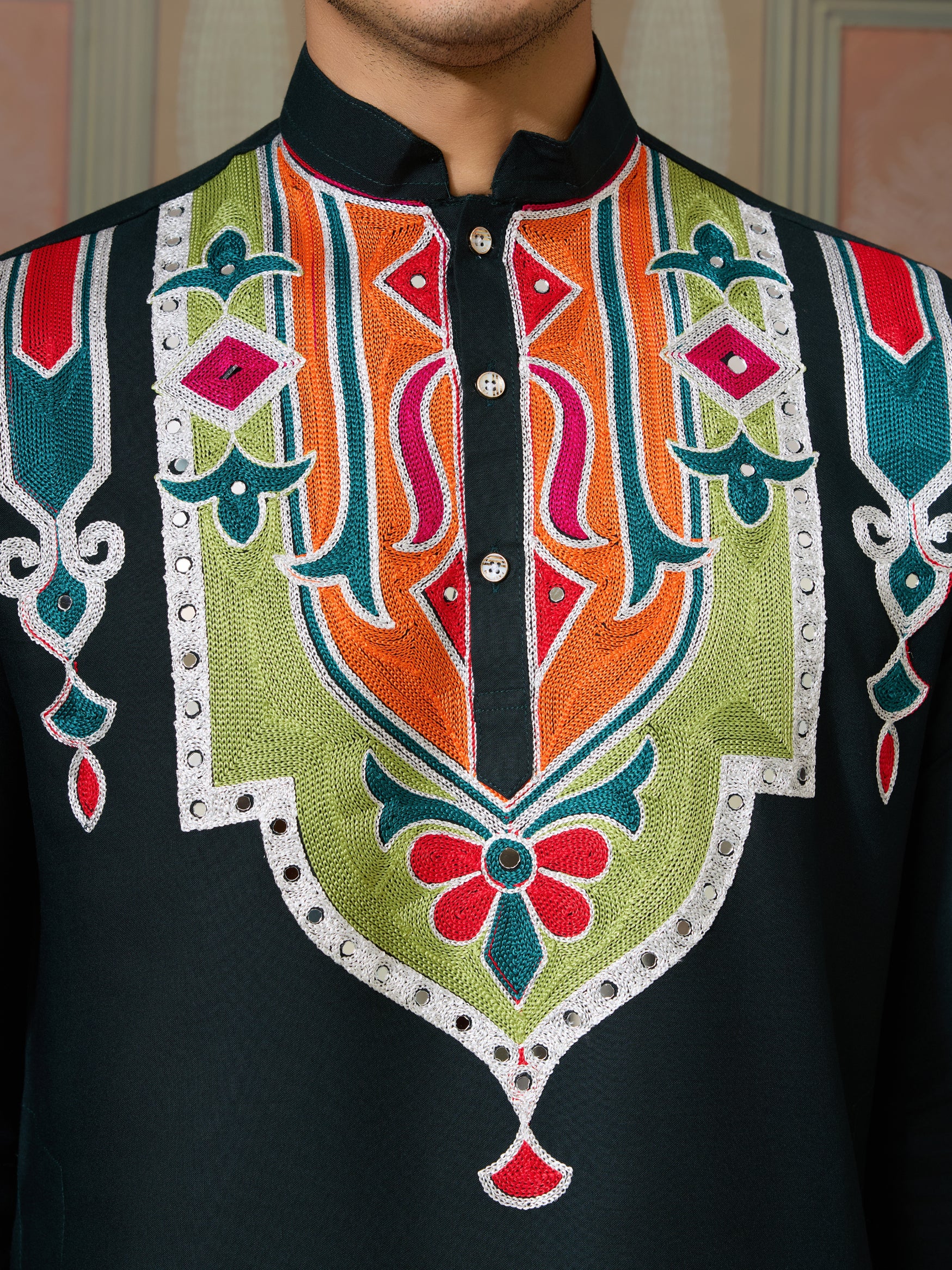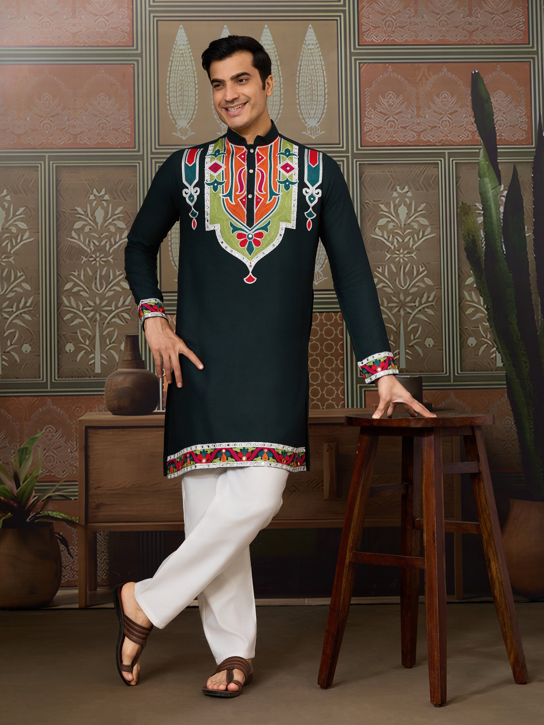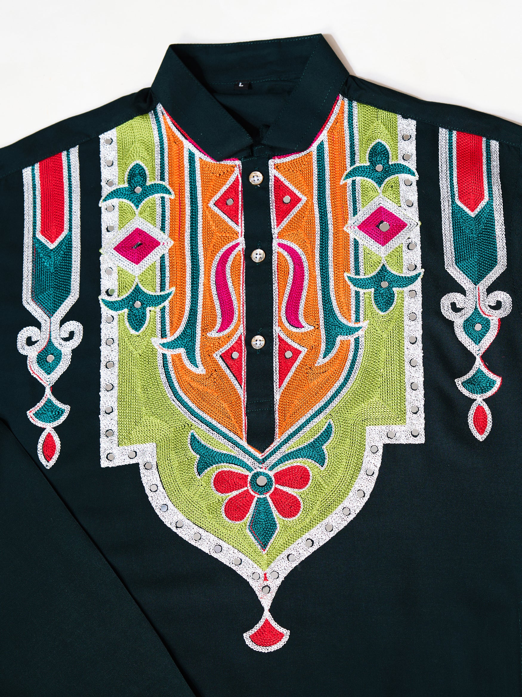 Elevate your ethnic wardrobe with this elegant green kurta, crafted from pure cotton for ultimate comfort. Featuring exquisite multi-thread embroidery and real mirror work on the front and borders, this kurta is perfect for festive occasions and traditional gatherings. The intricate detailing adds a vibrant touch, while the breathable fabric ensures you stay comfortable all day.