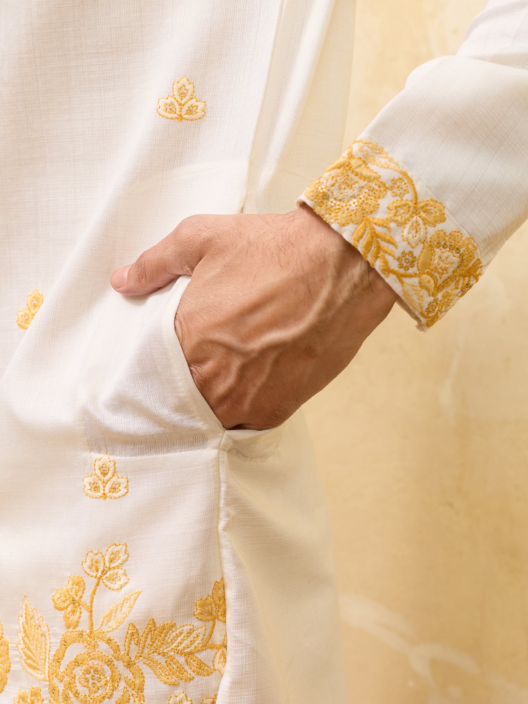 This Ivory Gold Kurta Set is designed for celebrations that deserve something unforgettable. Crafted in a soft, luminous ivory shade, the ensemble is elevated with rich golden floral embroidery that adds warmth, detail, and a royal finish.