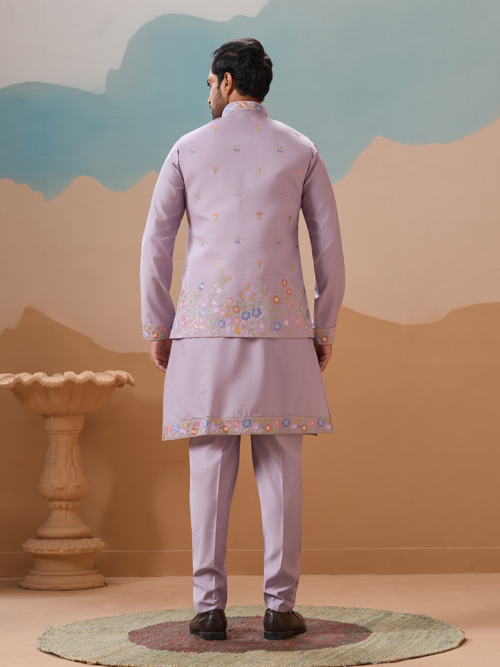 Own the spotlight with this lavender embroidered kurta set, designed for men who dare to wear colors that speak of grace and boldness together. The soft lavender hue paired with delicate multicolor floral embroidery on the collar, cuffs, and hem brings a fresh, youthful vibe to traditional wear.
