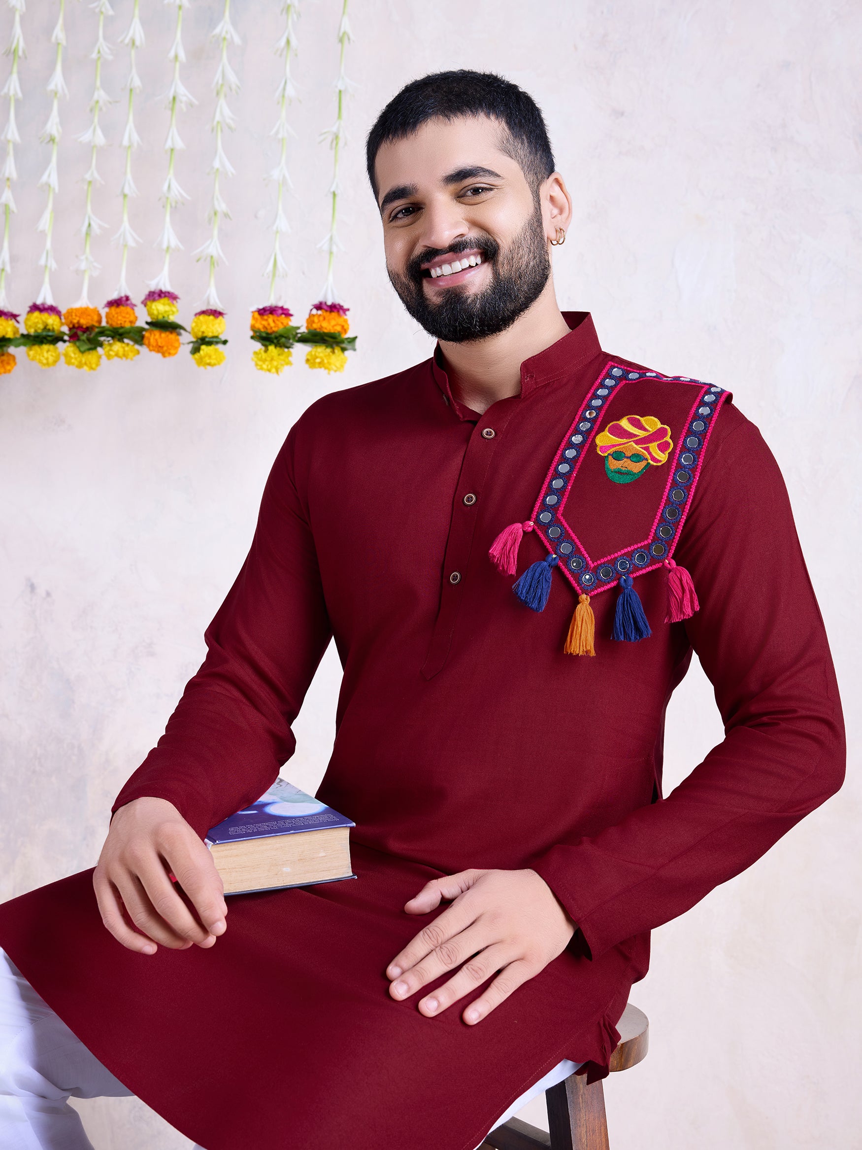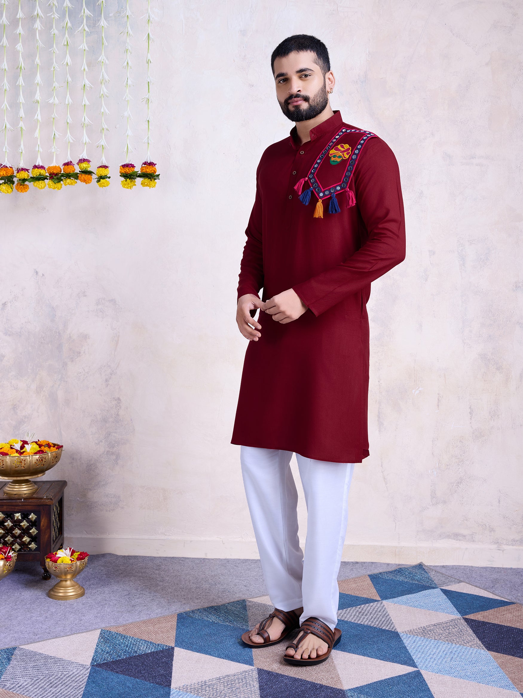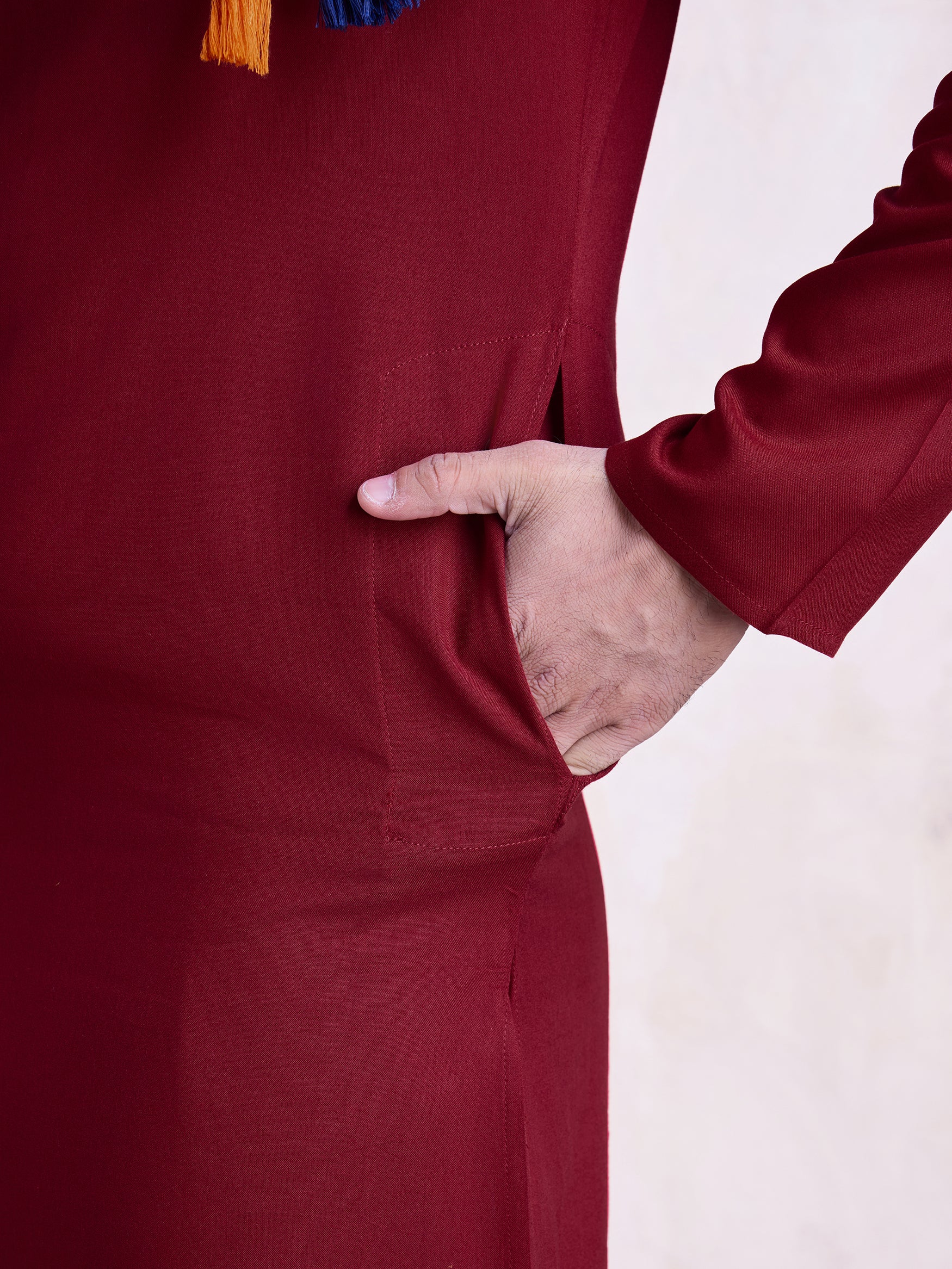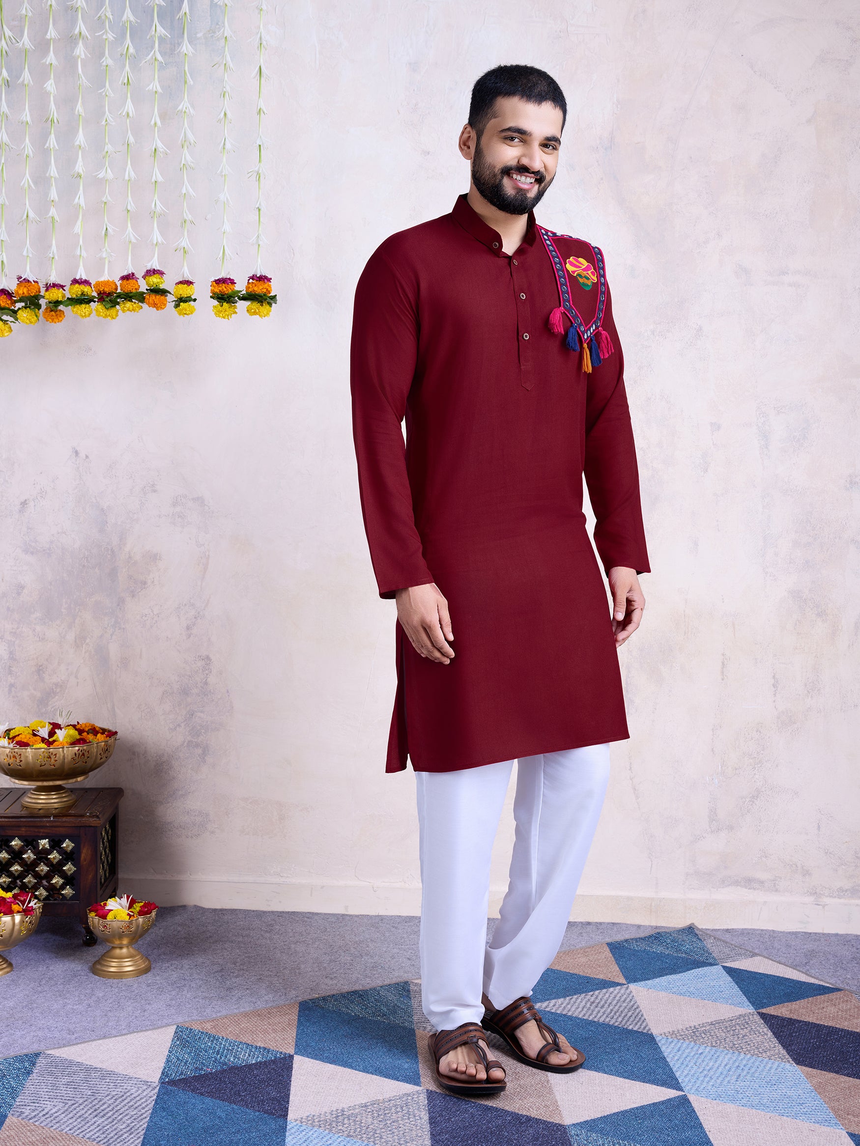 The deep maroon shade paired with contrasting white pajama pants creates a timeless look, while the embroidered shoulder patch with colorful tassels adds a unique festive charm. Its straight cut and mandarin collar ensure a sharp, contemporary fit without compromising on tradition.