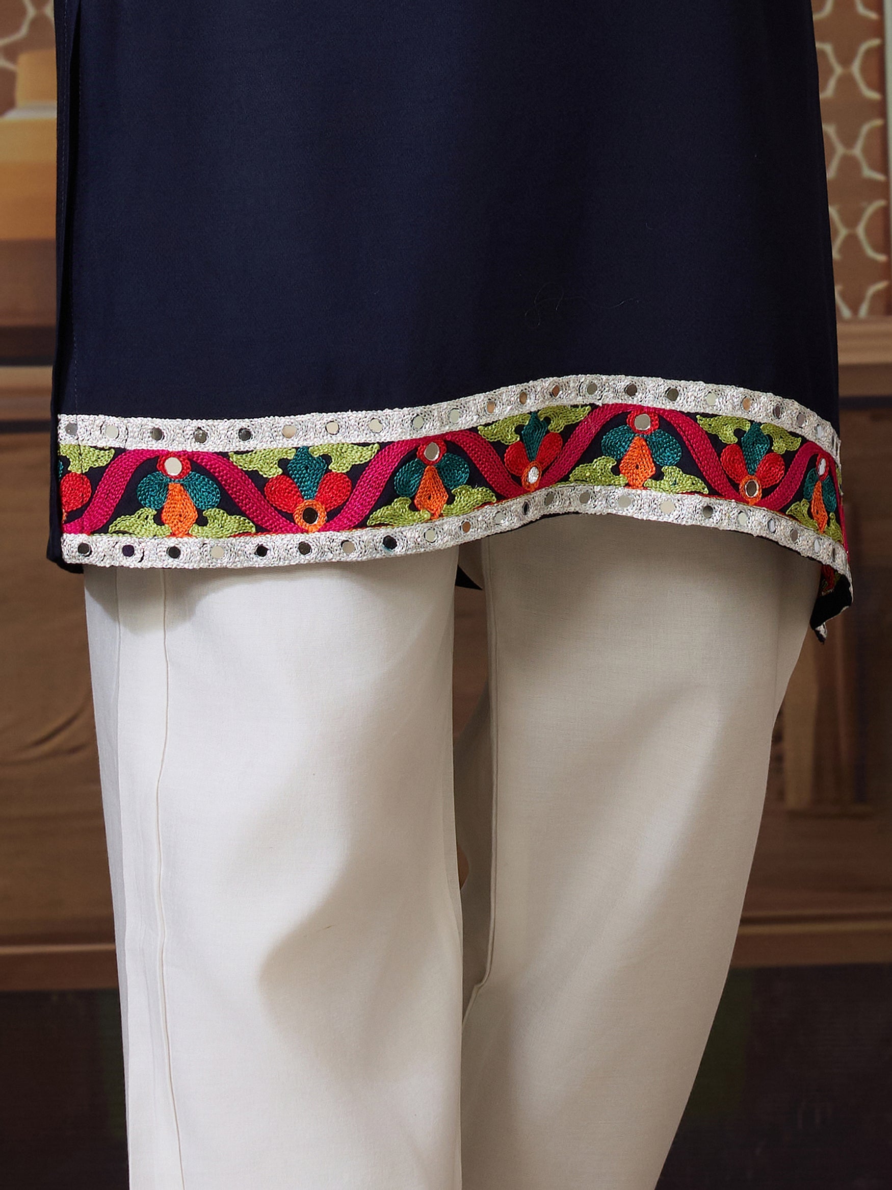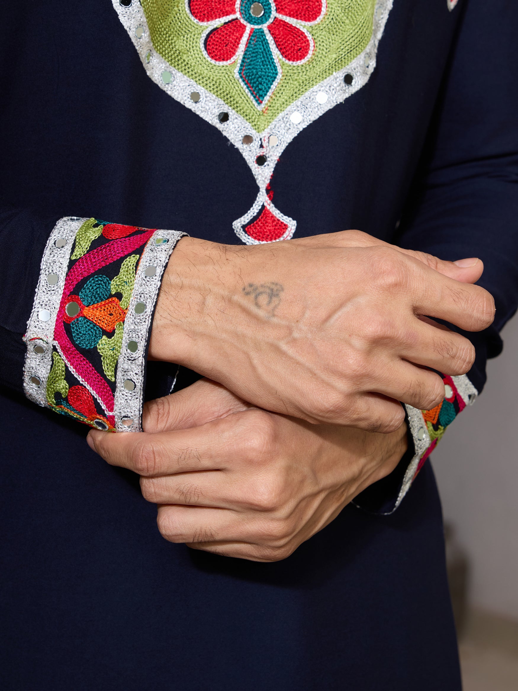 Men’s Navy Blue Pure Cotton Kurta with Multi-Thread and Real Mirror Work