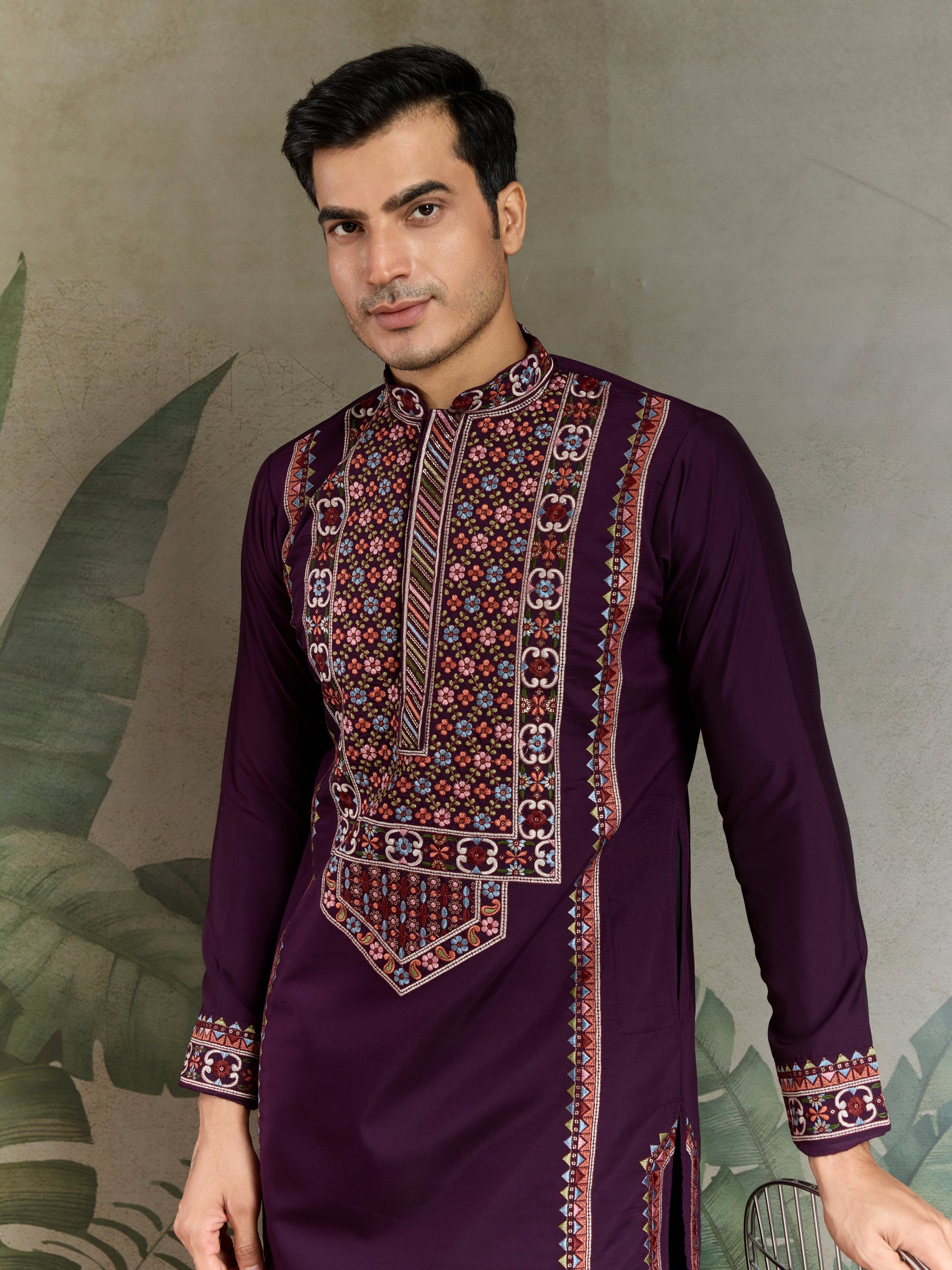 Men’s Traditional Purple Kurta with Intricate Multicolor Embroidery