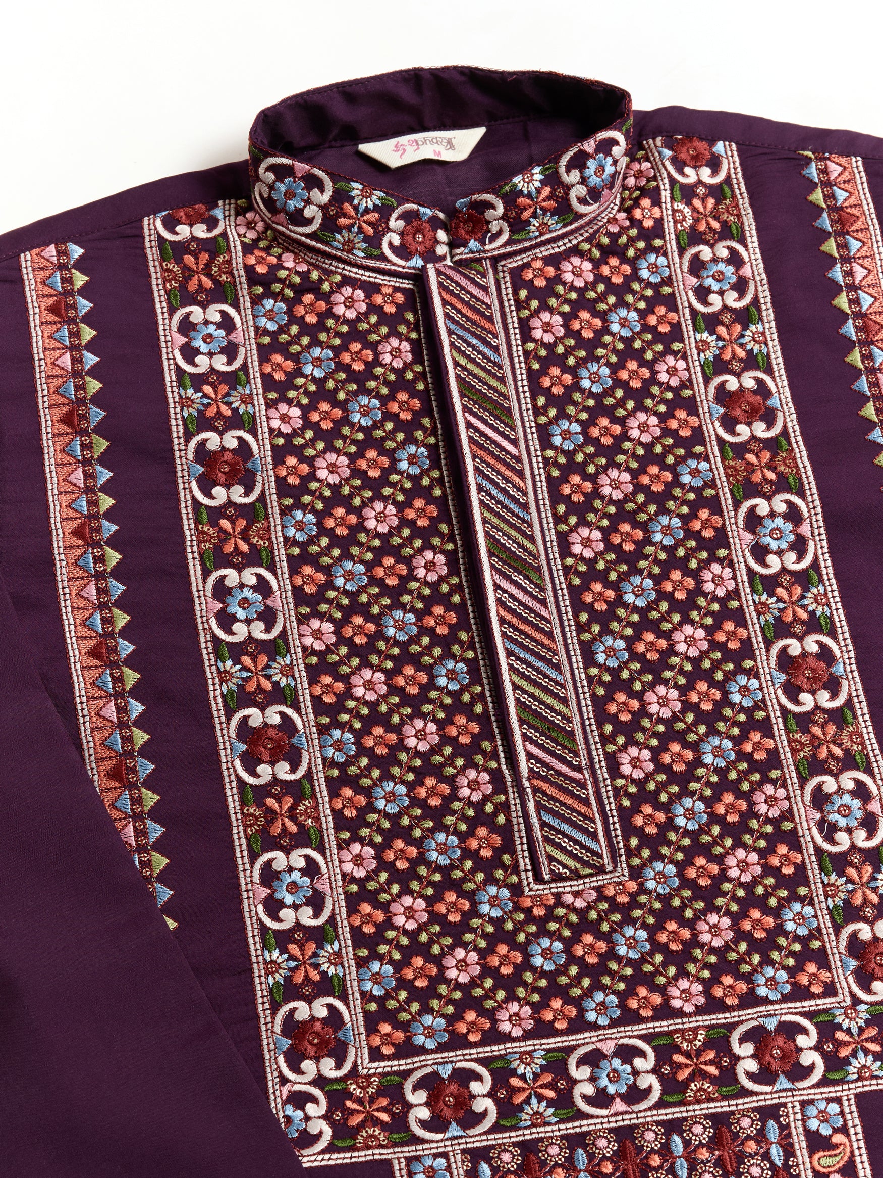 Elevate your festive and traditional look with this rich purple kurta, adorned with intricate multicolor embroidery on the front, collar, and cuffs. Crafted from high-quality fabric, this kurta offers both comfort and elegance, making it perfect for weddings, festive occasions, cultural events, or family gatherings.