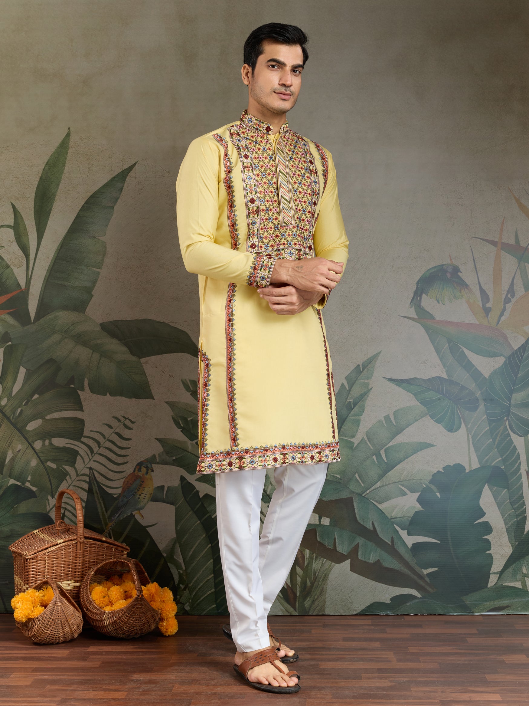 Step into elegance with this yellow embroidered cotton kurta – a perfect blend of tradition and modern style. Designed with rich multicolor thread embroidery on the neckline, chest, cuffs, and hemline, this kurta is crafted to make you stand out on festive occasions, weddings, or cultural gatherings.