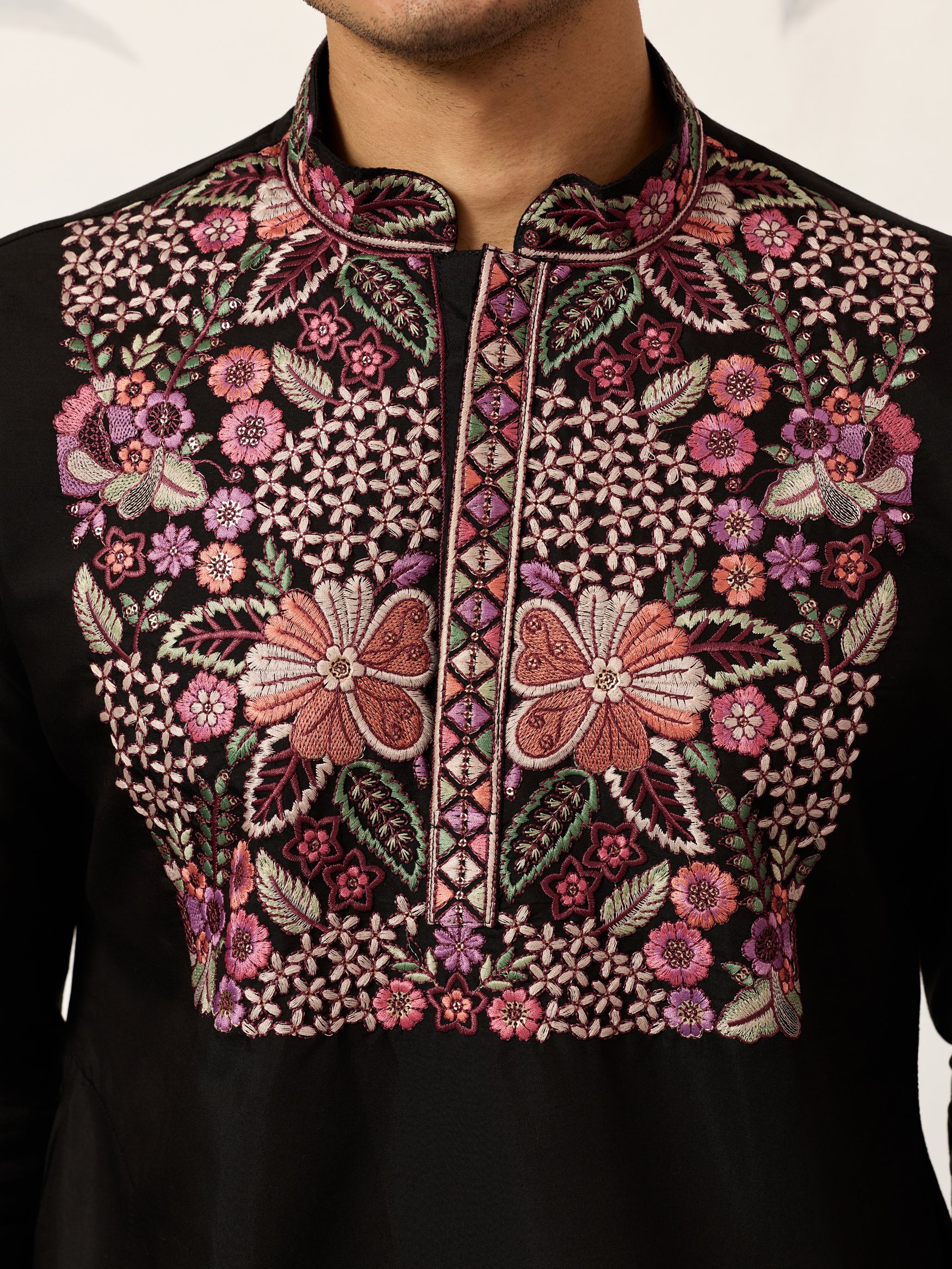 The intricate threadwork showcases detailed floral motifs in soft pink, peach, green, and ivory tones, complemented by an embroidered placket and refined mandarin collar.