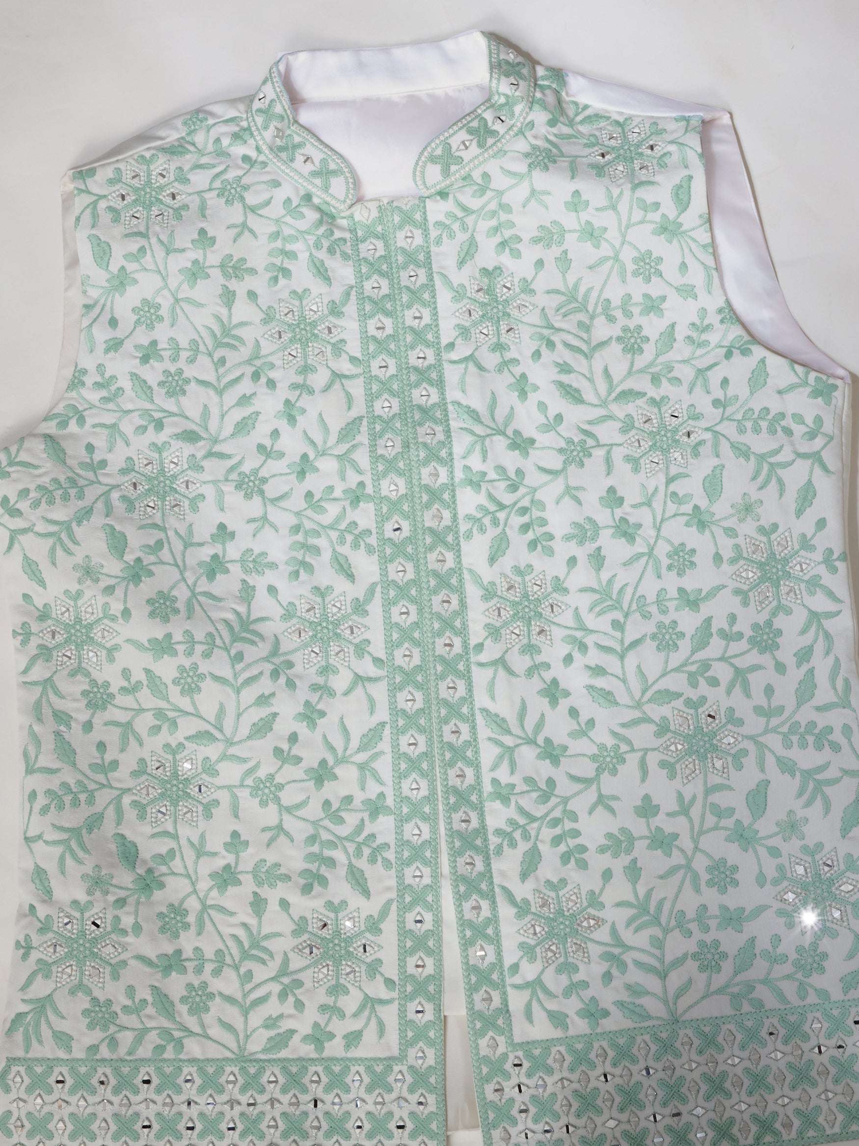 Elevate your ethnic look with this graceful pastel green embroidered waistcoat, crafted on a pristine white base. The intricate threadwork and subtle mirror detailing add a royal charm without being overpowering. A perfect pick for daytime weddings, festive gatherings, or cultural celebrations.