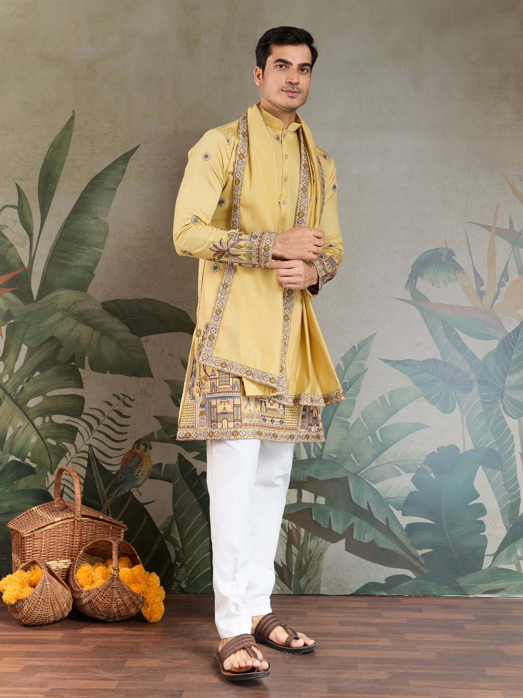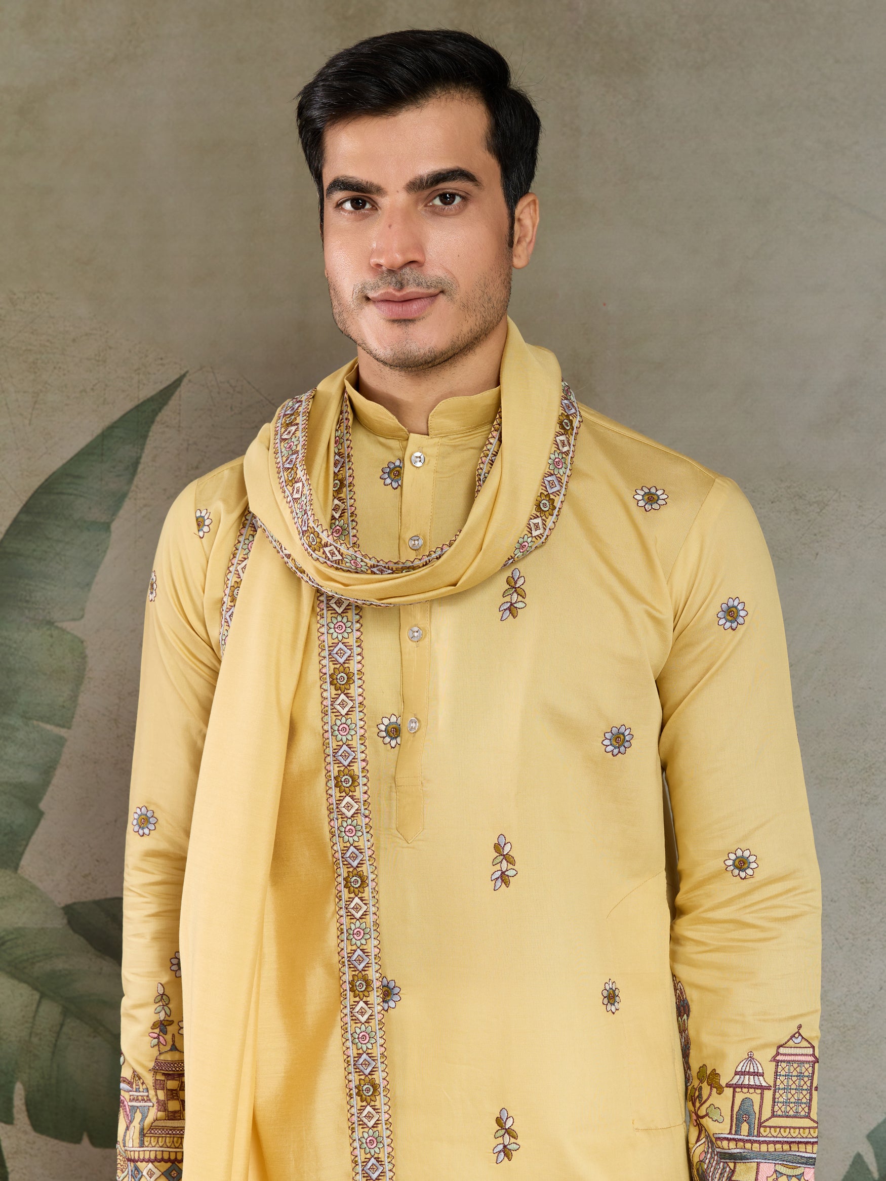 Elevate your festive look with this elegant mustard yellow embroidered kurta set. Crafted from premium fabric, this kurta features intricate thread embroidery inspired by Mughal architecture and floral motifs, adding a touch of heritage charm. The set comes with a matching embroidered dupatta and comfortable white trousers for a complete traditional ensemble.