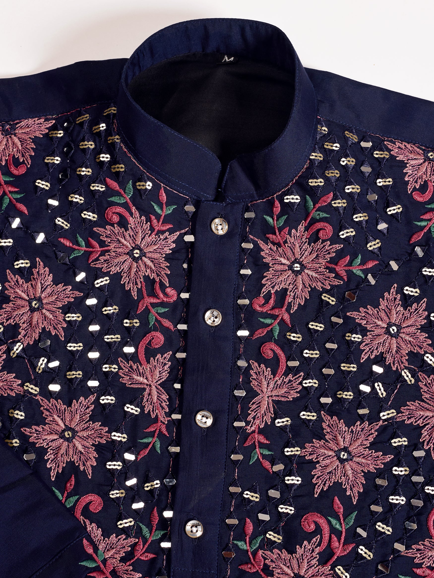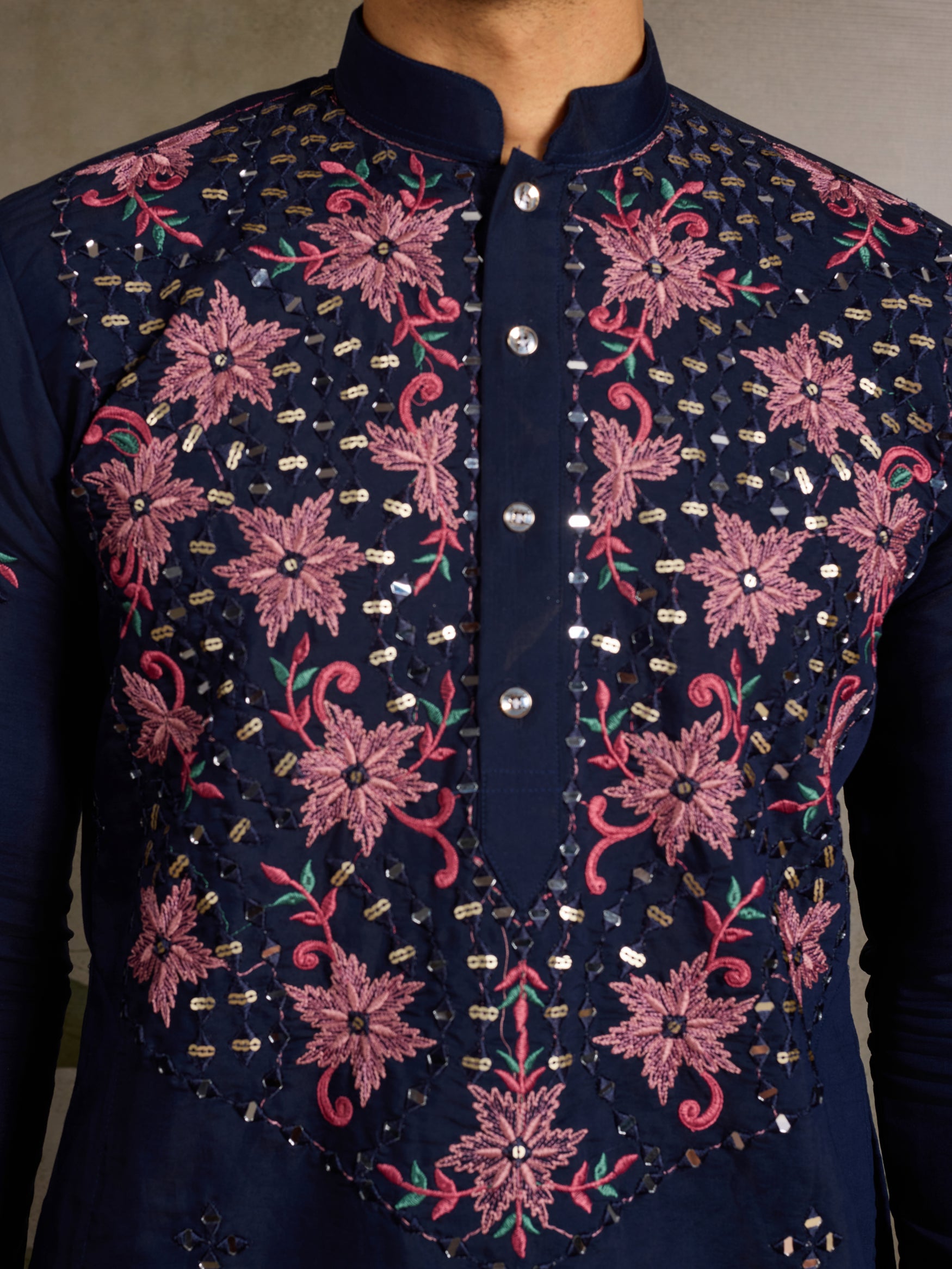 Navy Blue Floral Embroidered Kurta for Men | Festive & Wedding Wear