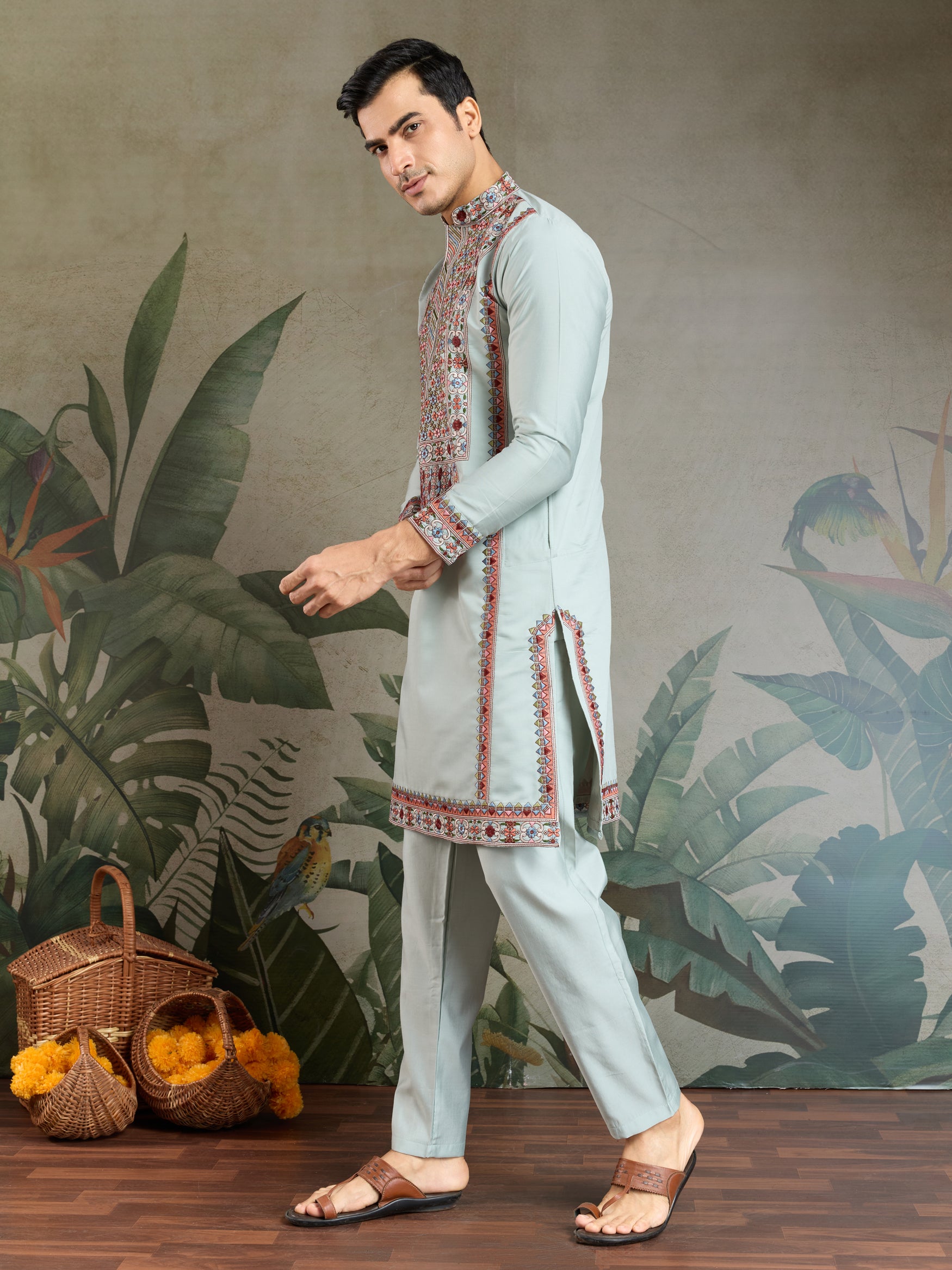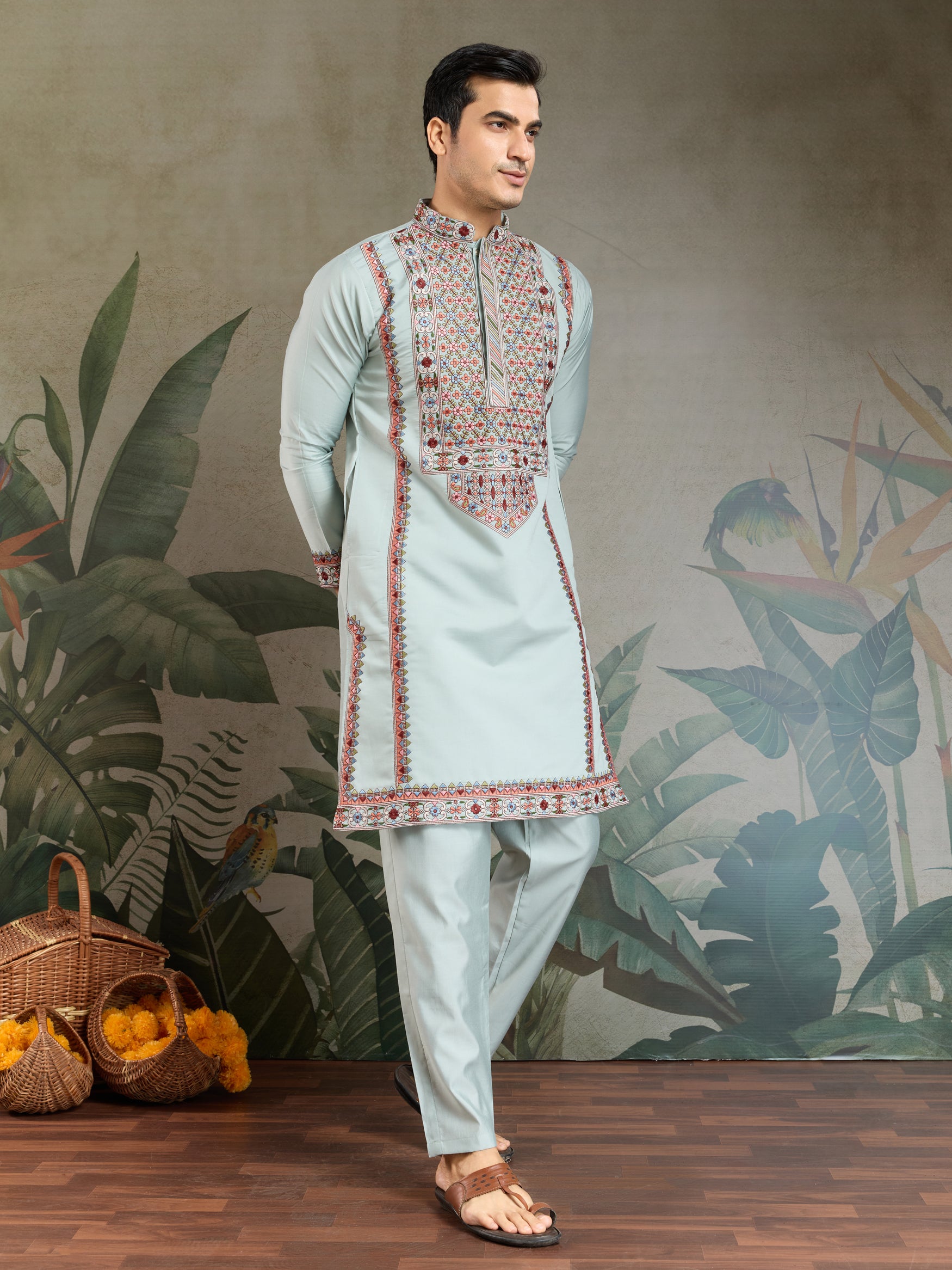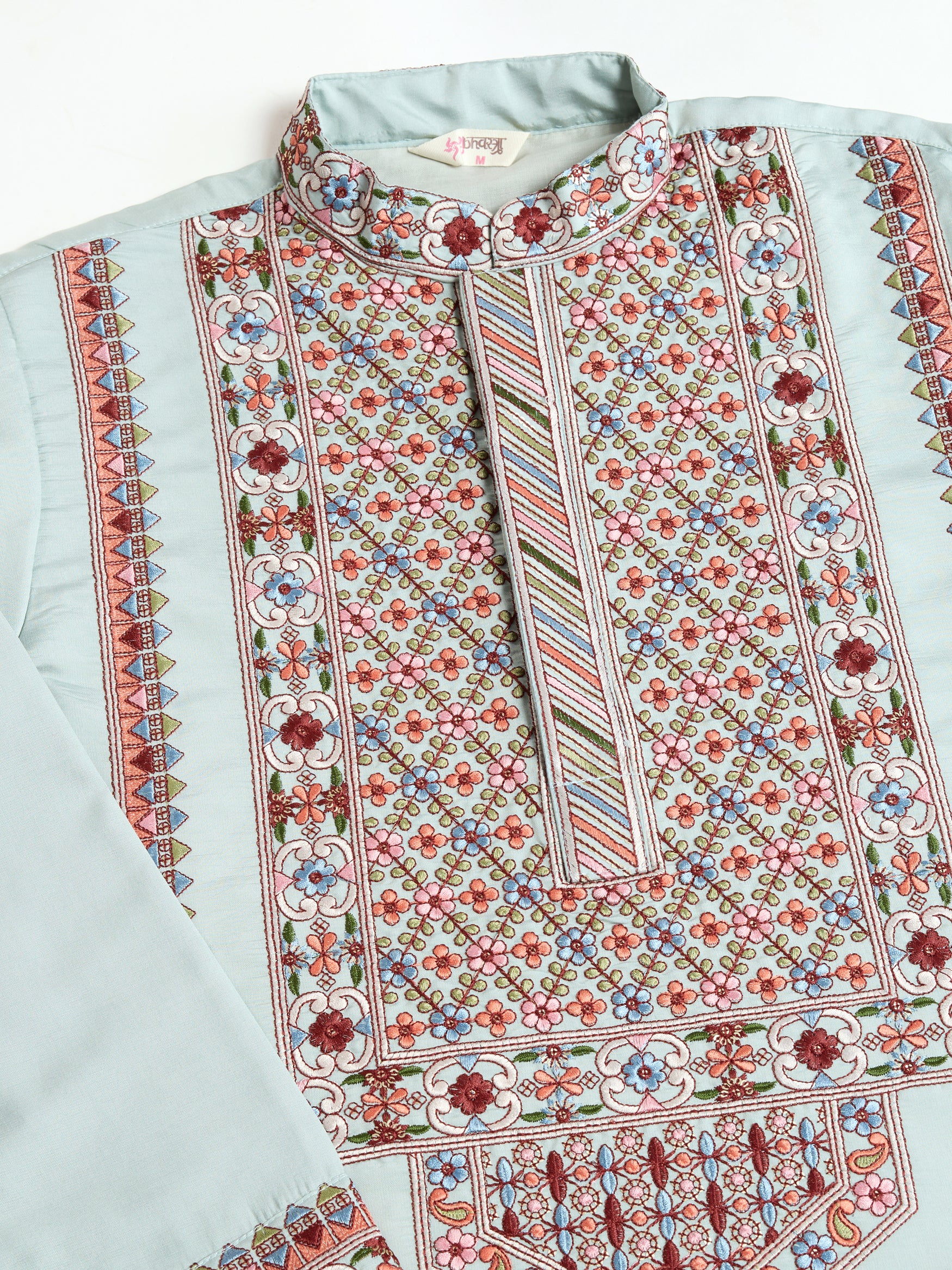 Pastel Mint Green Kurta with Multicolor Kashmiri-Inspired Embroidery
