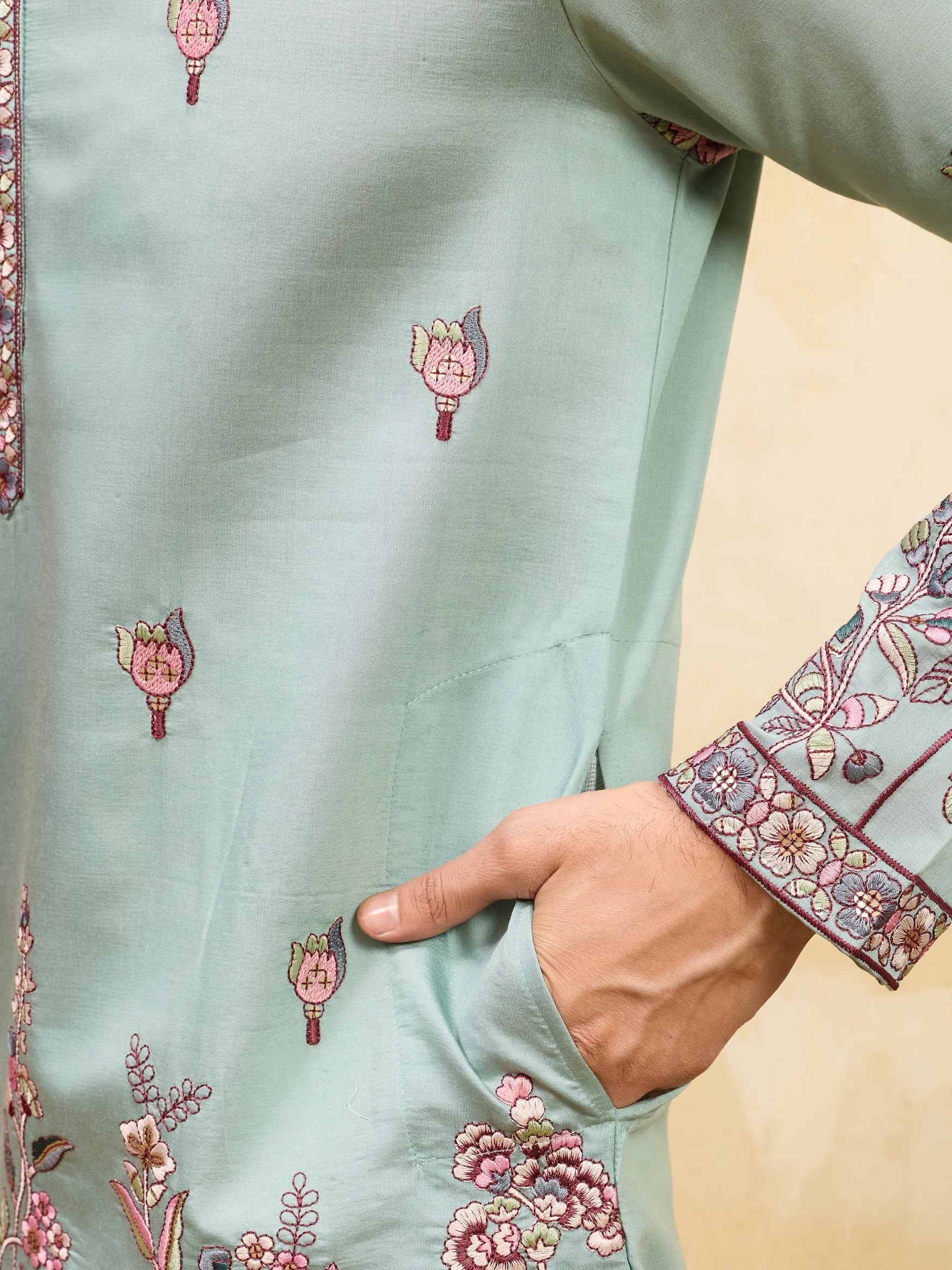 Crafted in a soothing pista green hue, this ensemble exudes understated sophistication. The kurta features delicate scattered floral buti embroidery across the body, while the hem blooms into an intricately detailed floral panel woven in shades of blush pink, muted plum, ivory, and soft sage — creating a graceful garden-inspired statement.