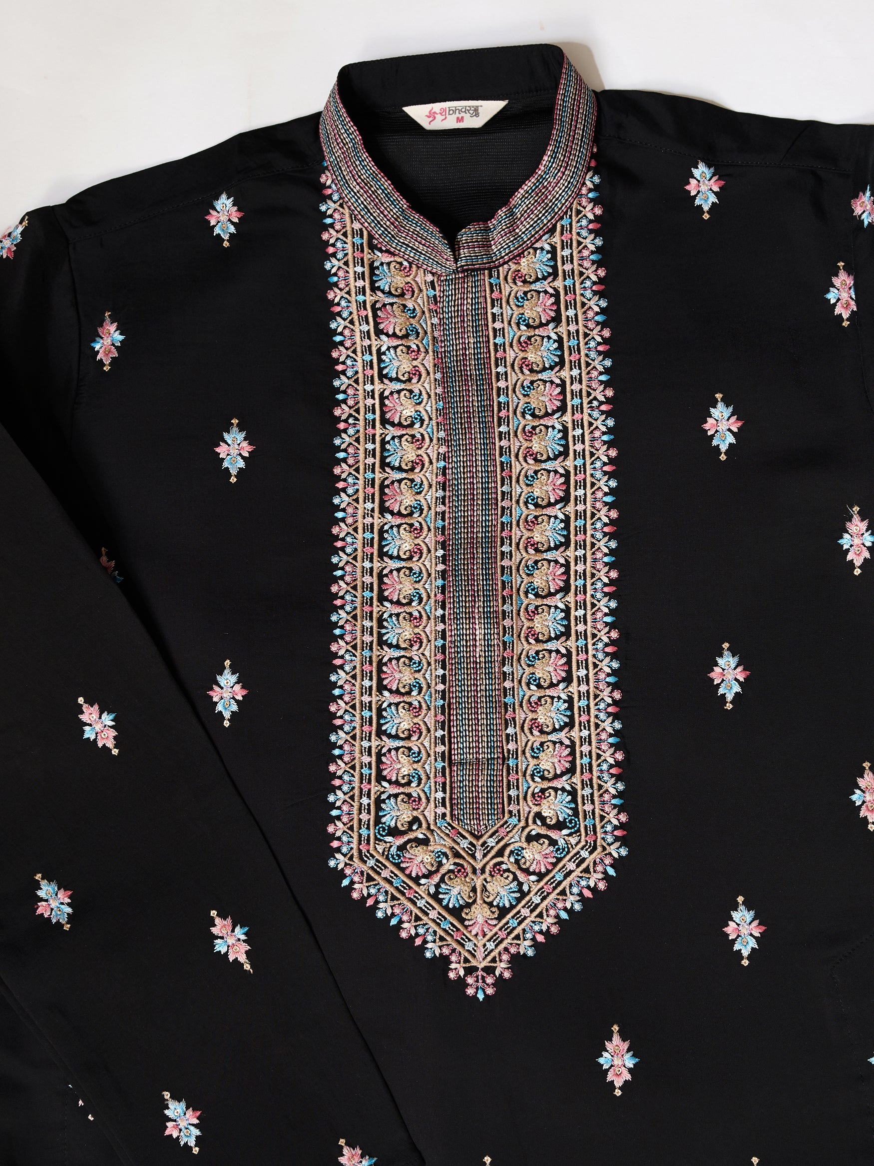 Turn heads this festive season with our Black Kurta Set, designed for men who embrace style with sophistication. Adorned with delicate multi-color thread embroidery on the neckline and jacket, this outfit blends traditional artistry with a modern royal touch.