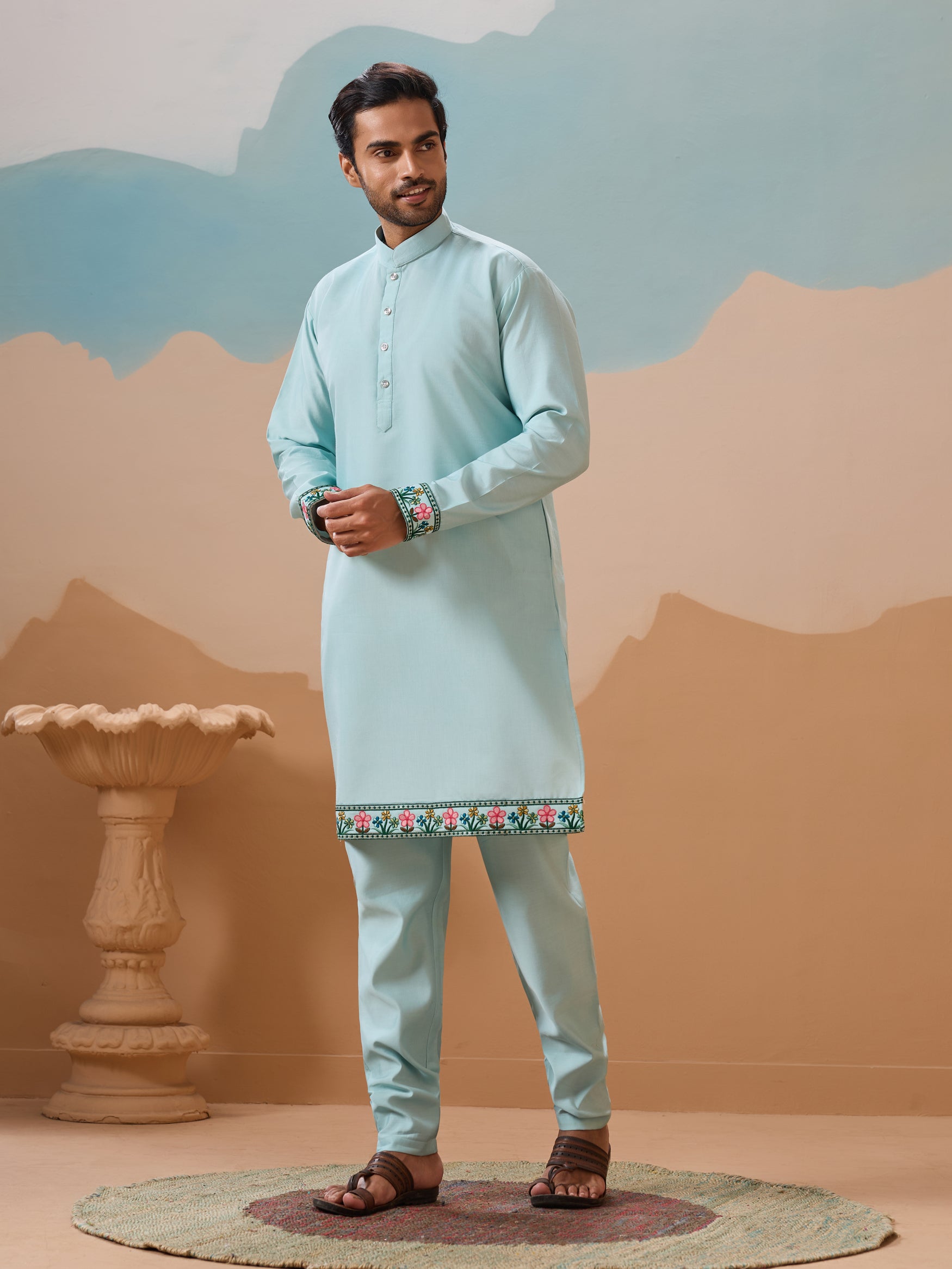 Step into a world of refined charm with this cream kurta-bandi set, adorned with intricate nature-inspired embroidery.
