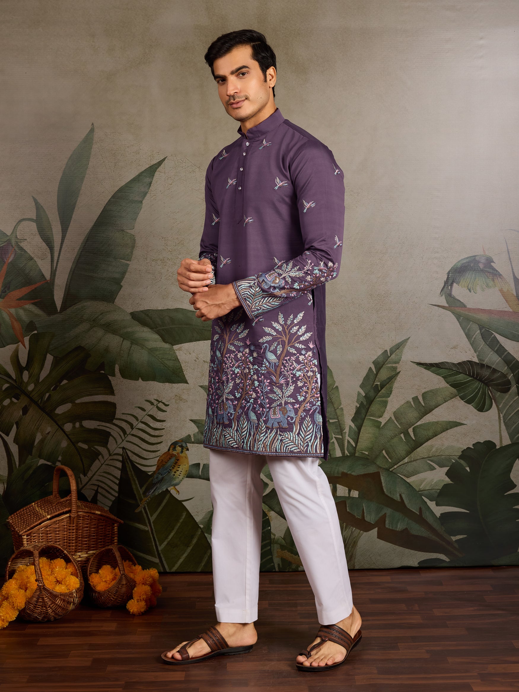 Step into the wild with elegance! This regal mauve kurta features intricate thread embroidery of exotic birds, royal elephants, and blooming flora — a masterpiece that brings nature's charm to life. Perfect for festive occasions, weddings, or making a statement at cultural events.