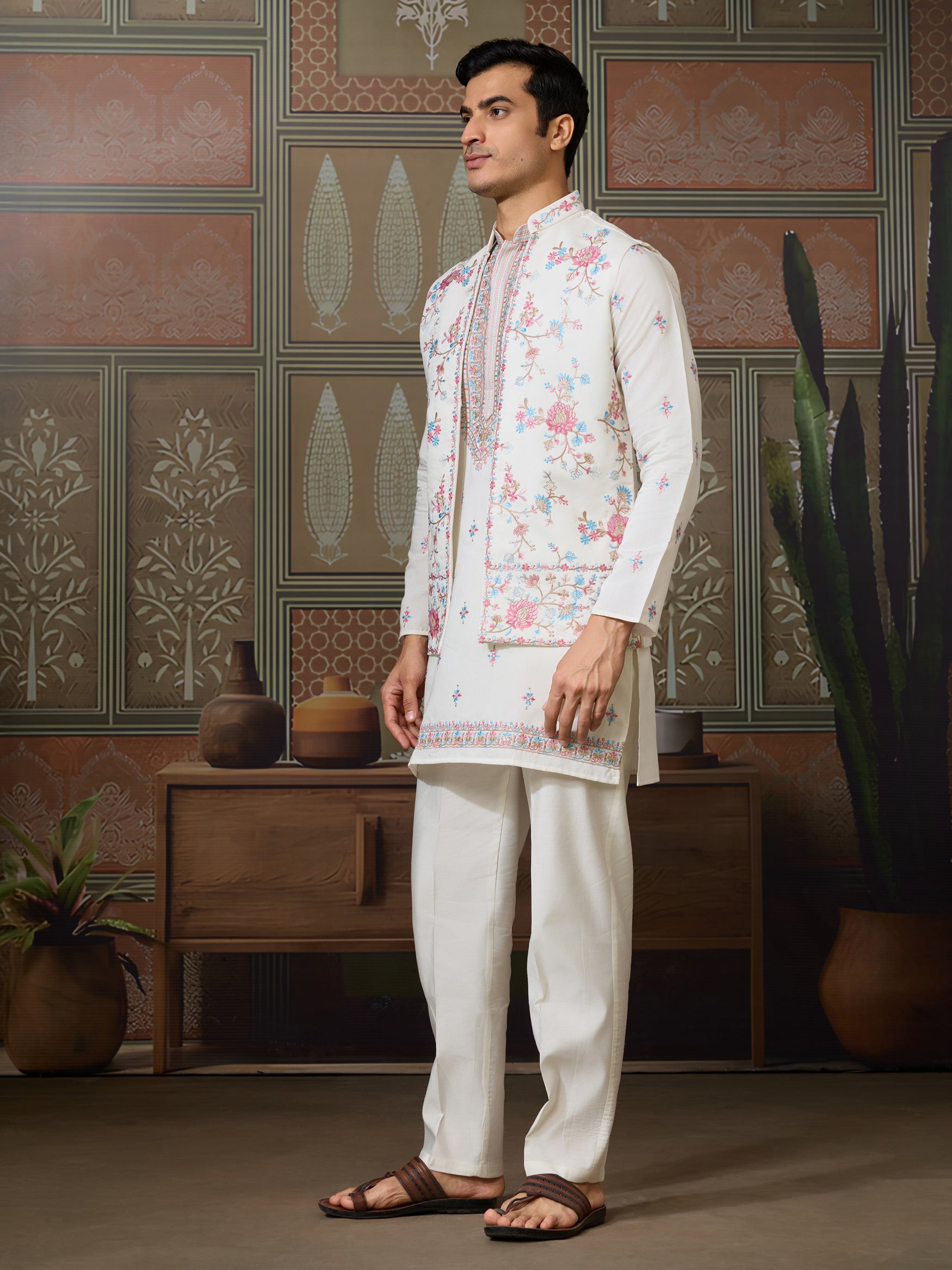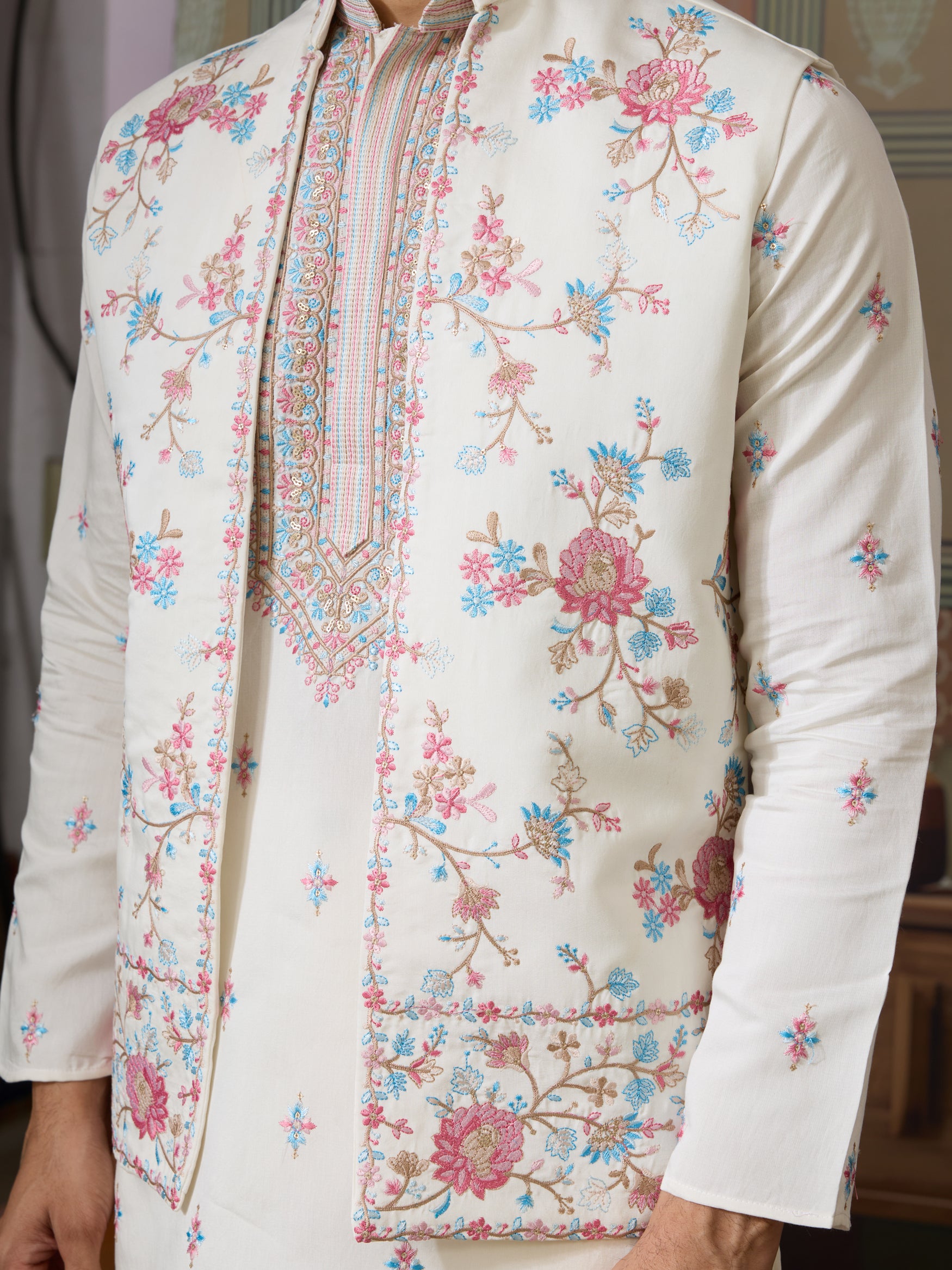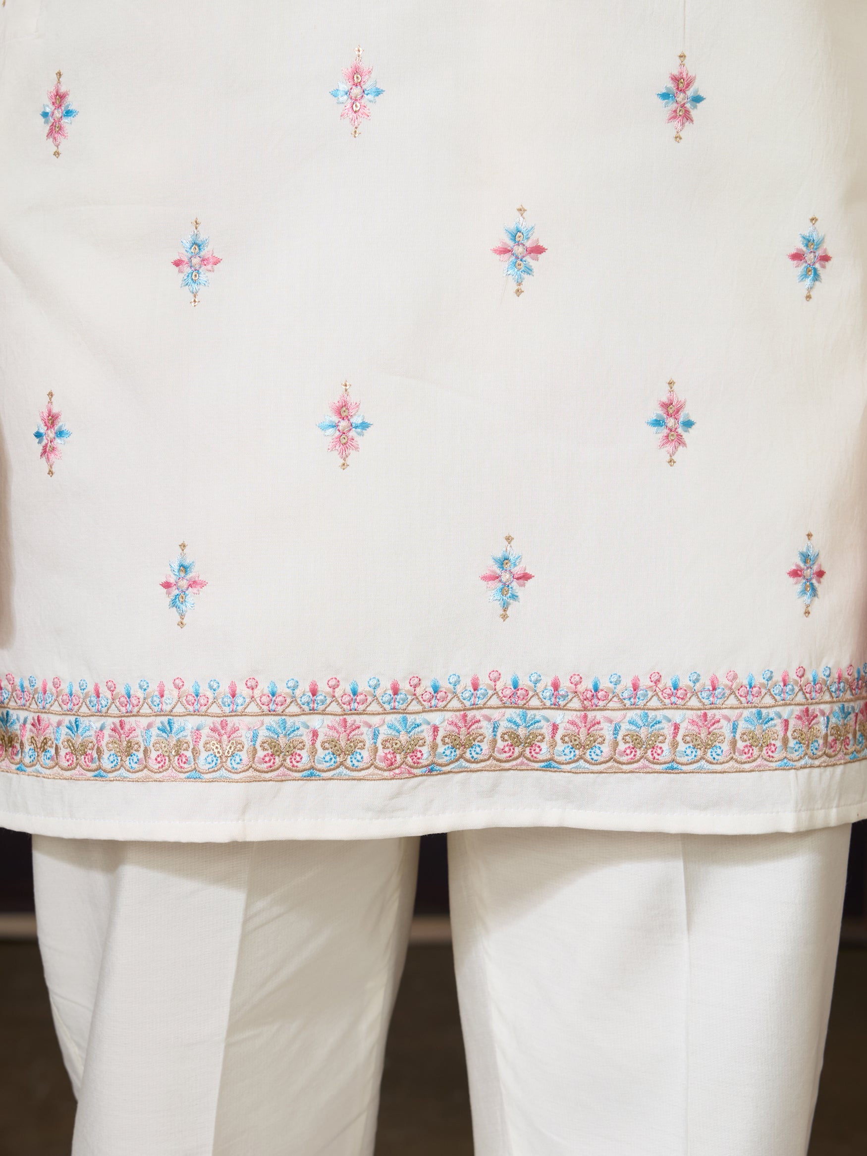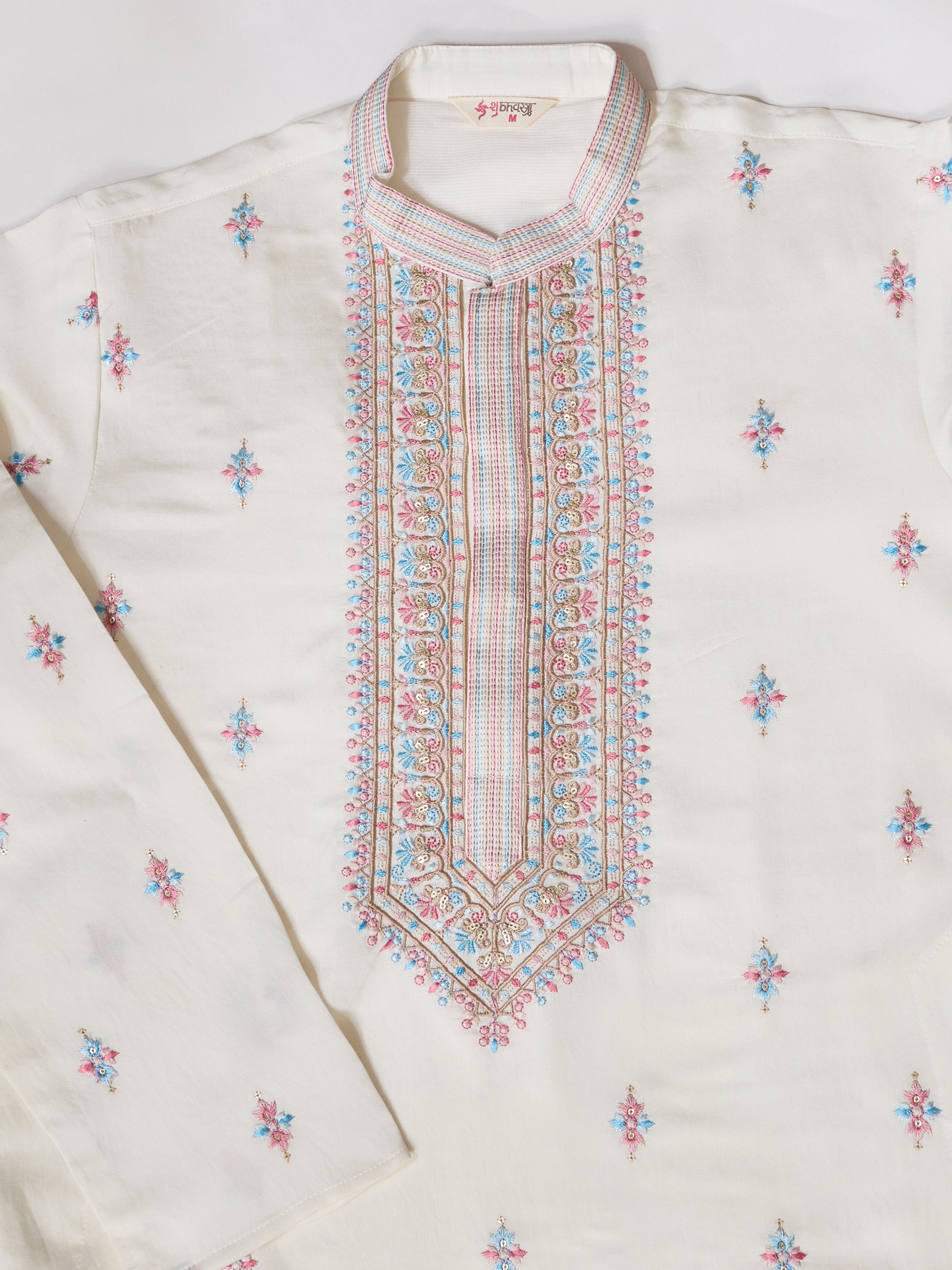 Grace meets elegance in this regal white kurta set, detailed with delicate pastel floral embroidery in pink & blue. The soothing white base adds a royal charm, making it a perfect choice for weddings, haldi ceremonies, receptions & festive gatherings. Crafted for both comfort and luxury, this outfit ensures you stand out with a sophisticated traditional look.