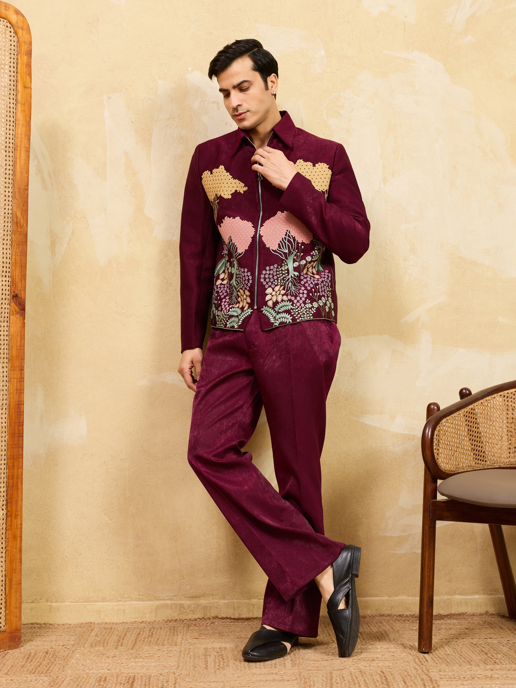 Delicate threadwork in soft gold, blush pink, and muted green creates a striking contrast against the deep burgundy base, giving the outfit a regal yet refined presence. The structured silhouette, sharp collar, and sleek zipper detail add a modern touch, while the coordinated trousers complete the look with effortless sophistication.