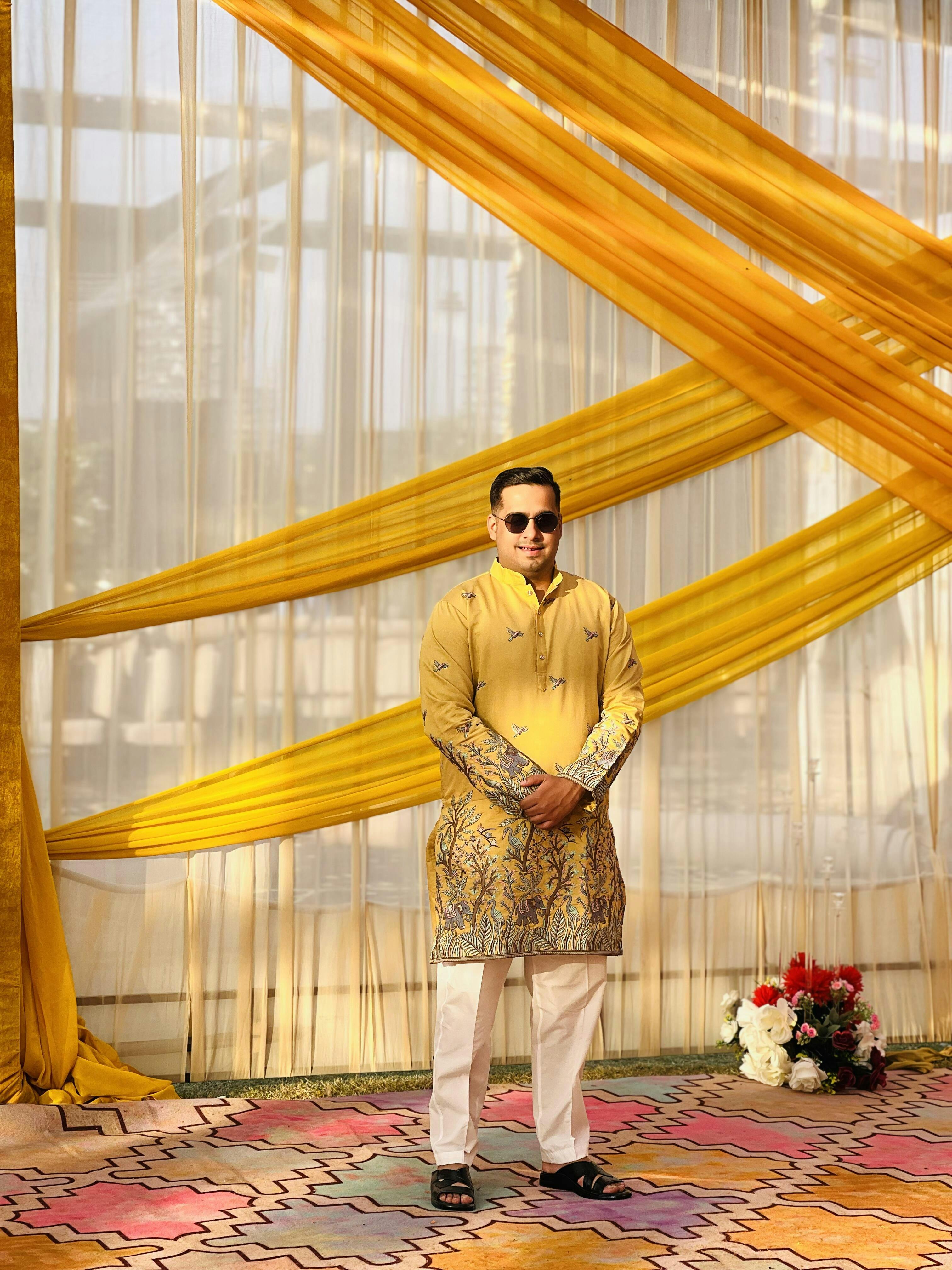 Step into tradition with a twist! This mustard yellow kurta features intricate jungle-inspired embroidery — from majestic elephants to serene cranes, dancing under pastel-threaded trees and birds. A perfect blend of heritage and haute couture, ideal for festive celebrations and cultural stories.