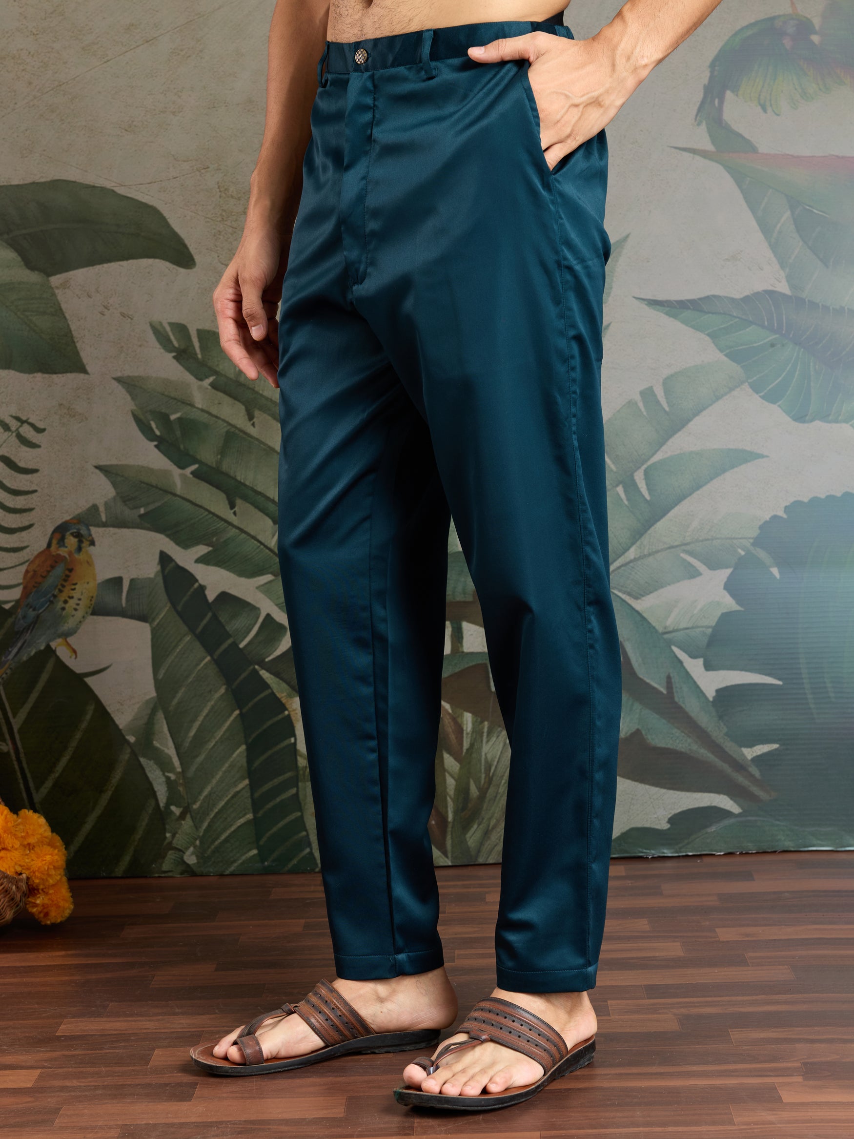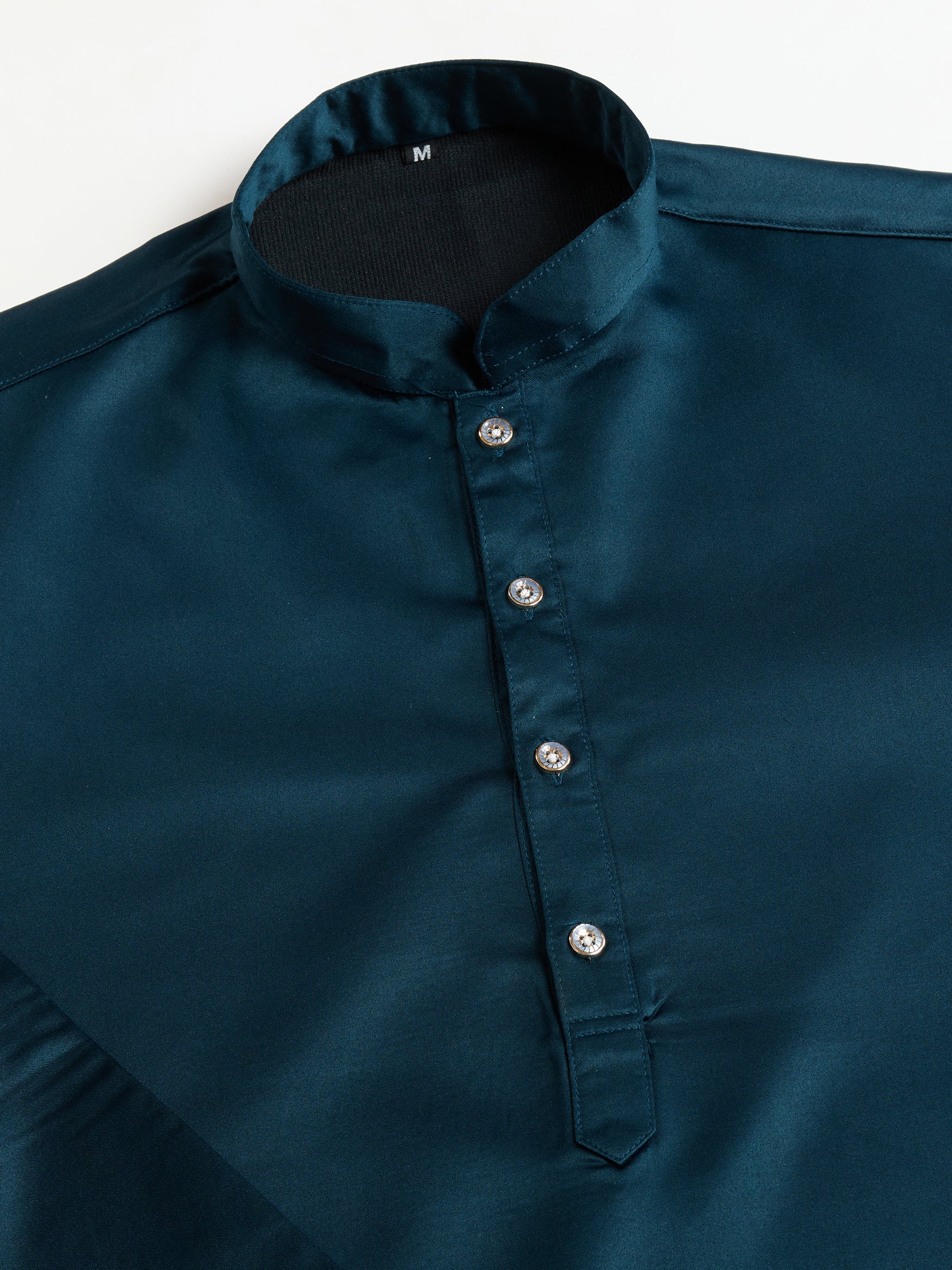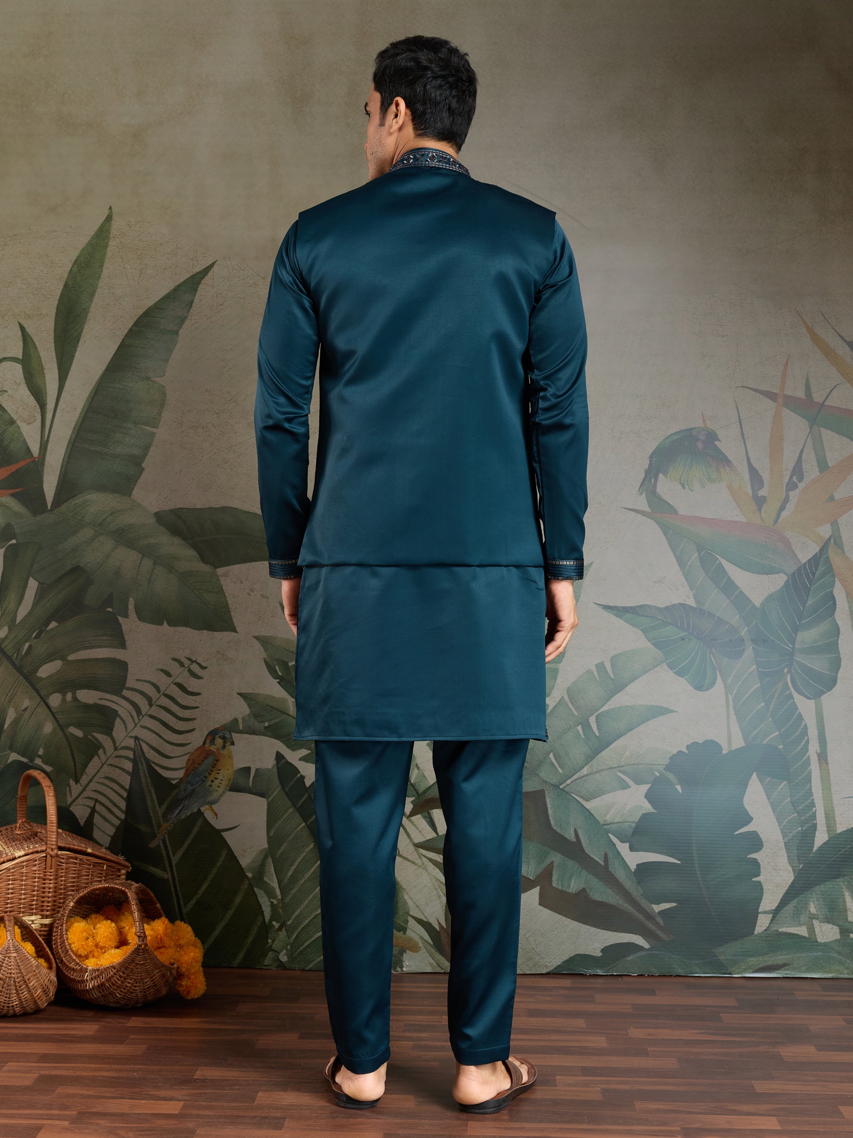 Step into timeless elegance with this royal teal kurta set, crafted with exquisite embroidery and a sleek modern silhouette. The kurta features fine floral and geometric embroidery along the hemline, collar, and cuffs, adding a regal charm. Designed in a rich teal shade, this ensemble perfectly balances tradition and sophistication.