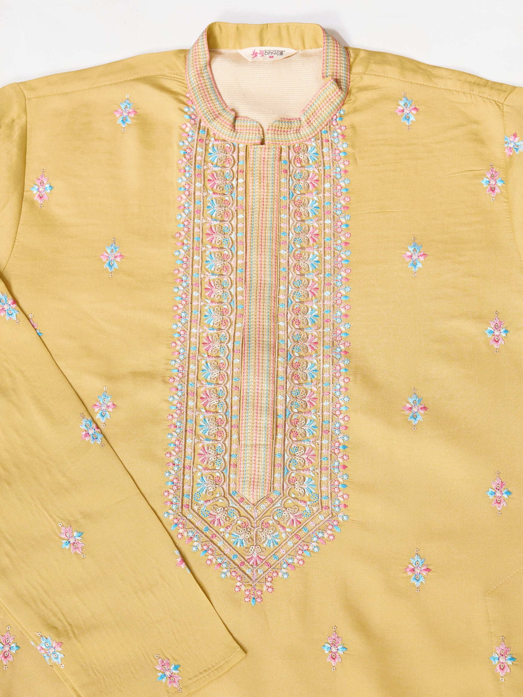 Bring a splash of sunshine to your festive look with this yellow embroidered kurta set. Adorned with delicate pastel threadwork in pink & blue, this outfit blends tradition with elegance. Perfect for weddings, haldi, festive celebrations, and special occasions, this kurta is designed to make you stand out with effortless charm.