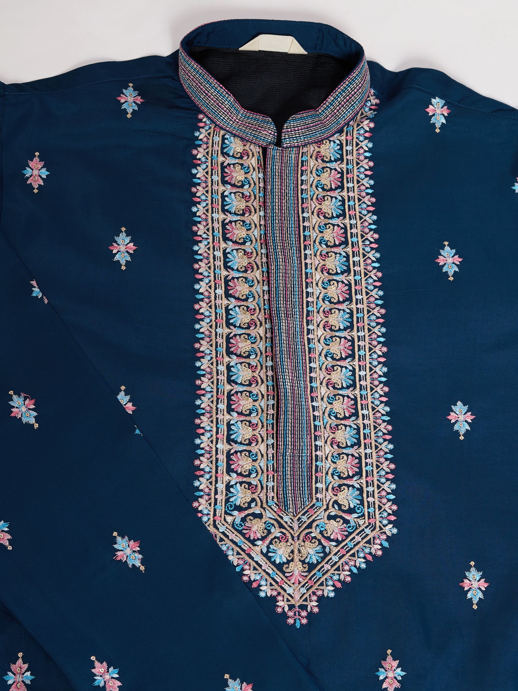Step into timeless elegance with our Teal Blue Kurta Set, crafted for the modern man who loves tradition with a touch of luxury. Designed with intricate multi-color thread embroidery on the neckline and jacket, this outfit exudes regal charm and festive sophistication.