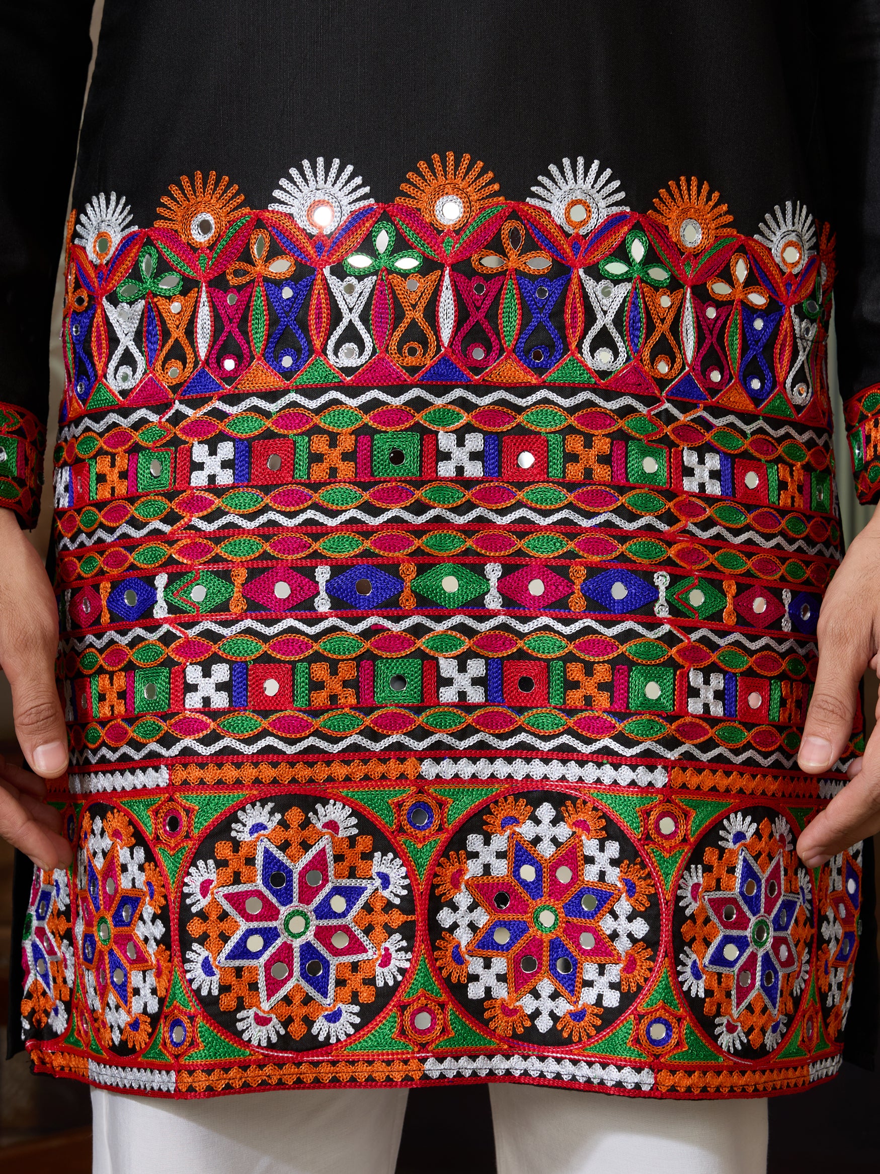 Bring a touch of tradition and elegance to your ethnic wardrobe with this black embroidered Gujarati mirror work kurta for men. Crafted from premium quality fabric, this kurta showcases intricate multicolor thread embroidery and mirror embellishments that reflect the rich heritage of Gujarat.