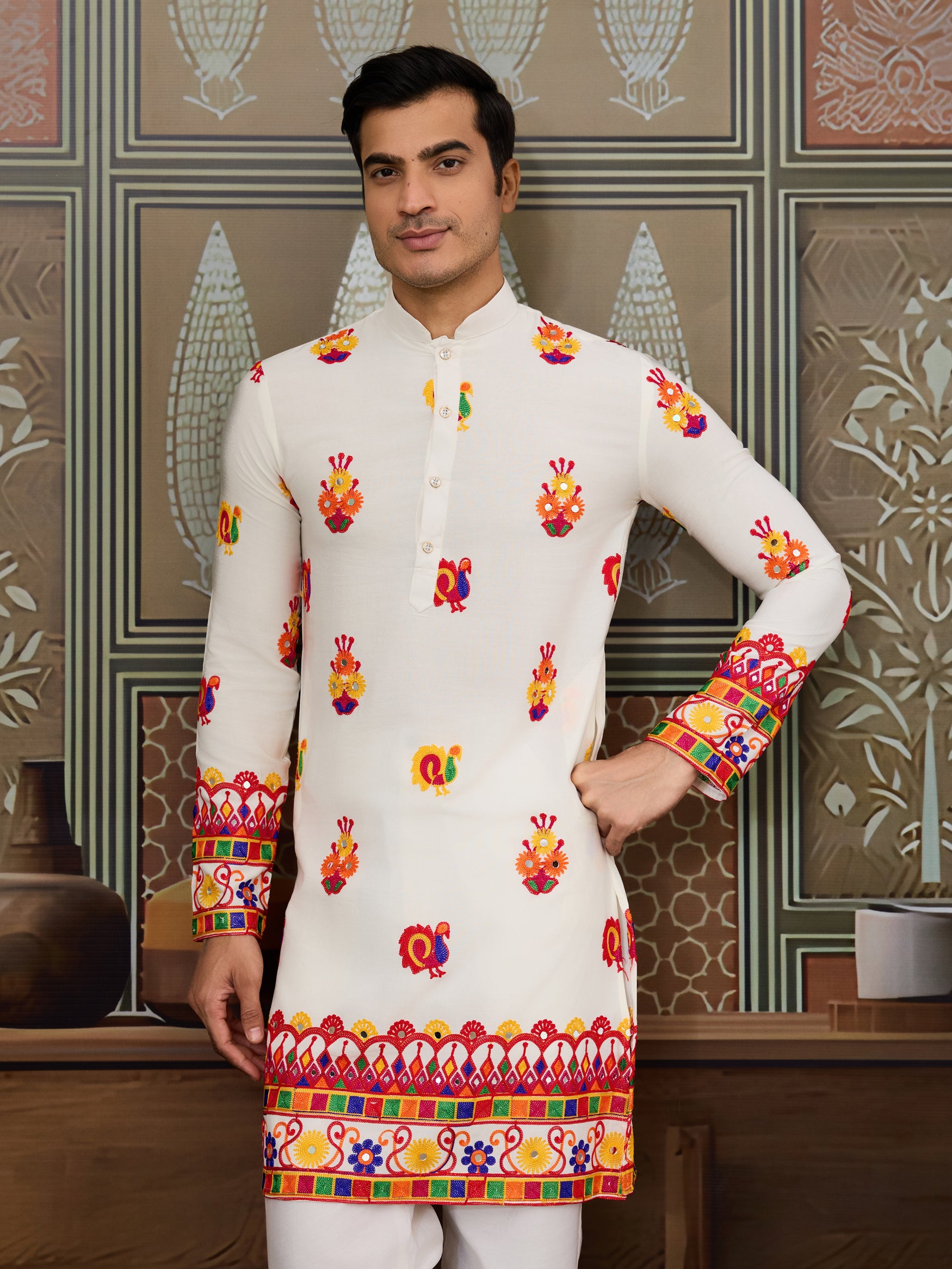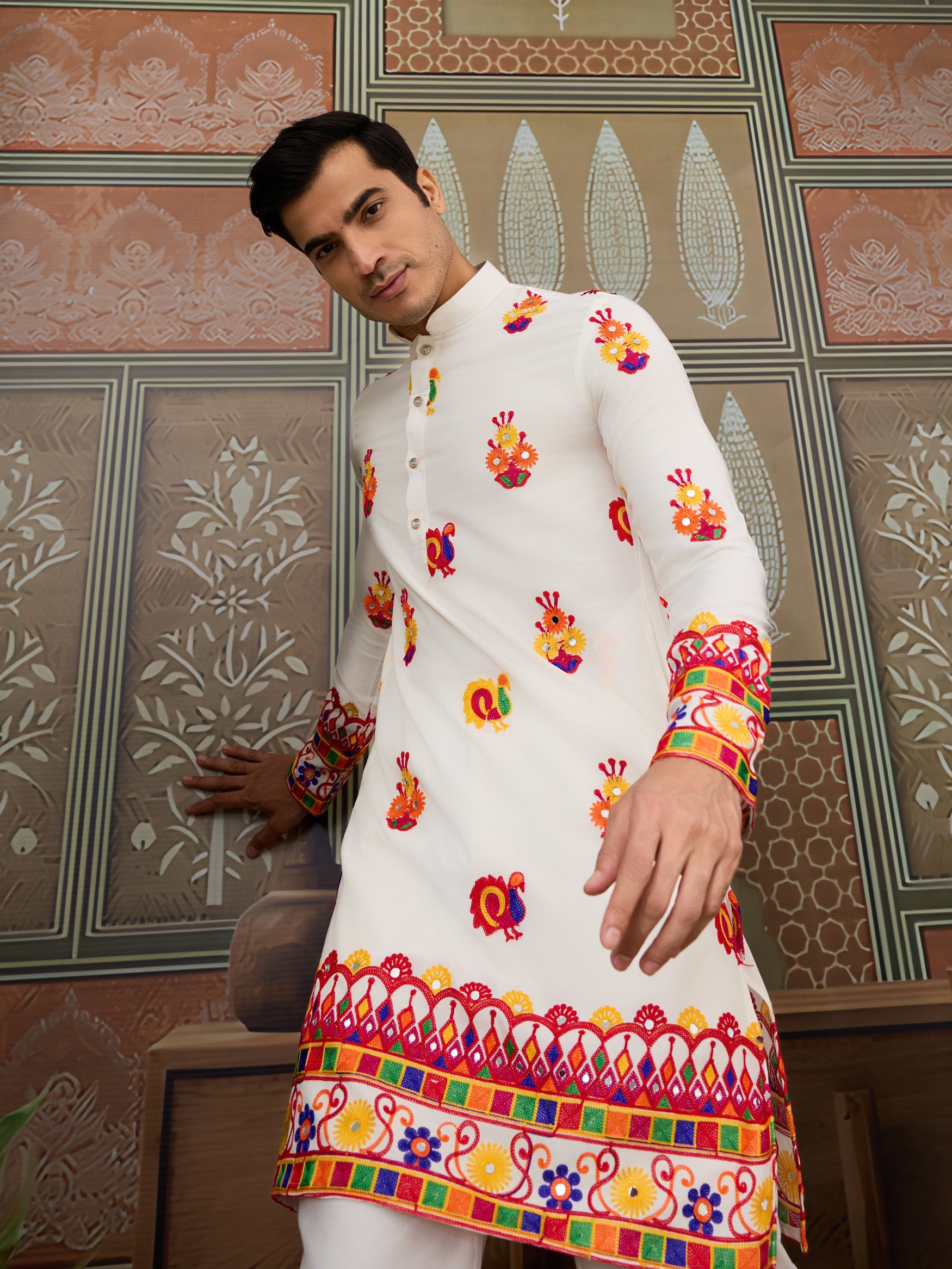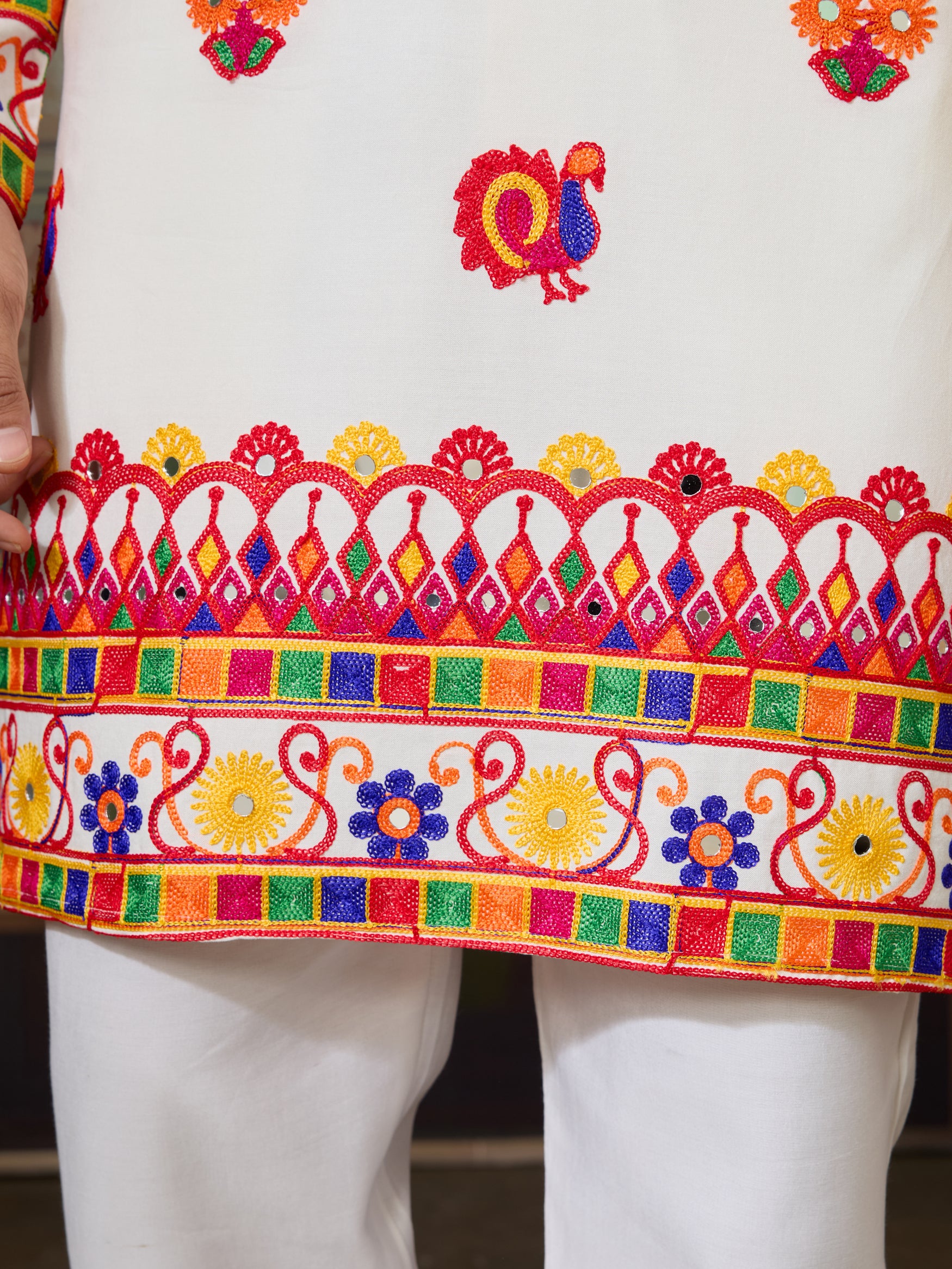 Elevate your ethnic look with this White Kurta, adorned with vibrant multicolor embroidery, mirror highlights, and traditional motifs. A perfect choice for weddings, Garba nights & festive celebrations. Pair with white pants or churidar for a royal vibe.