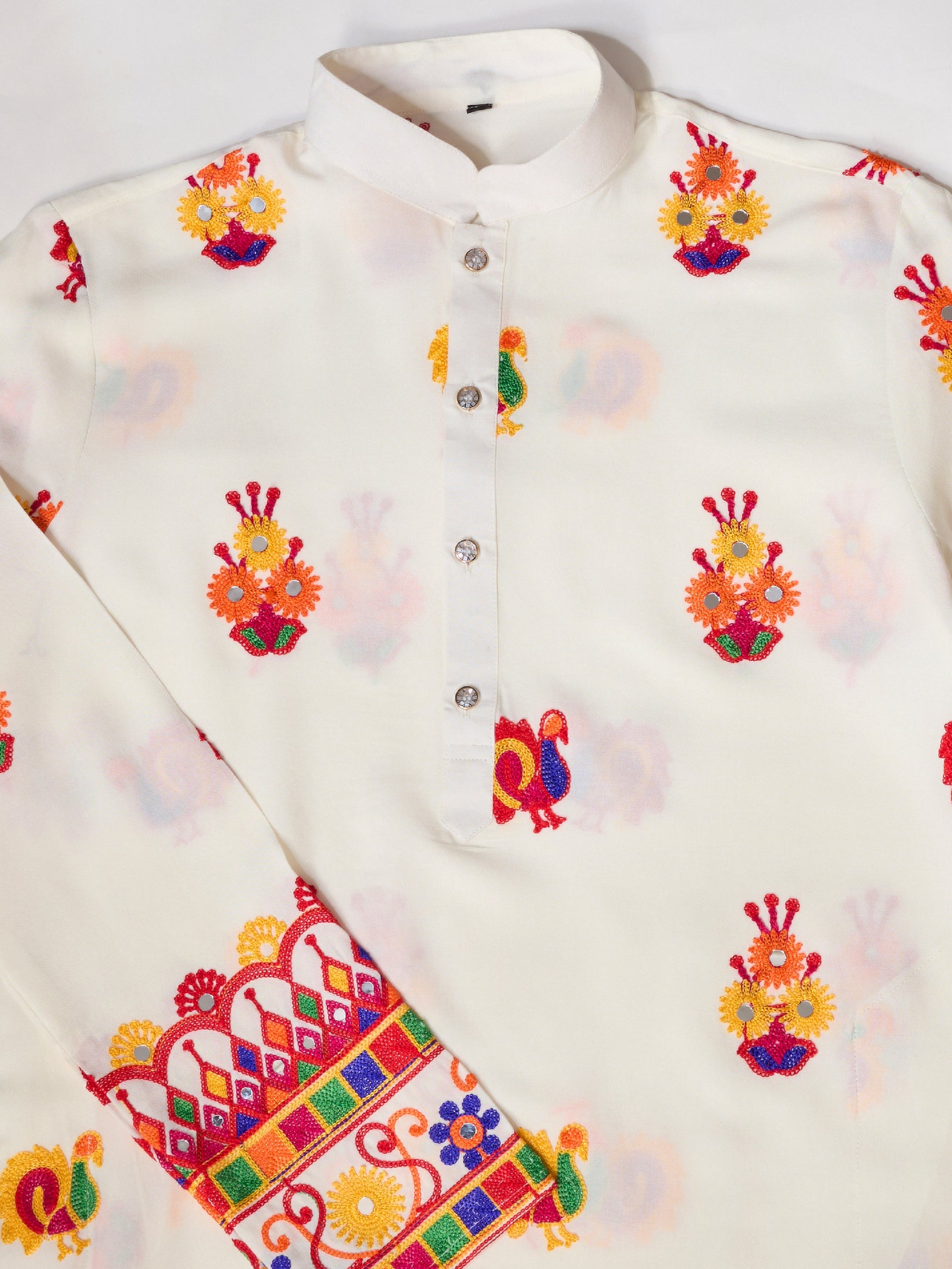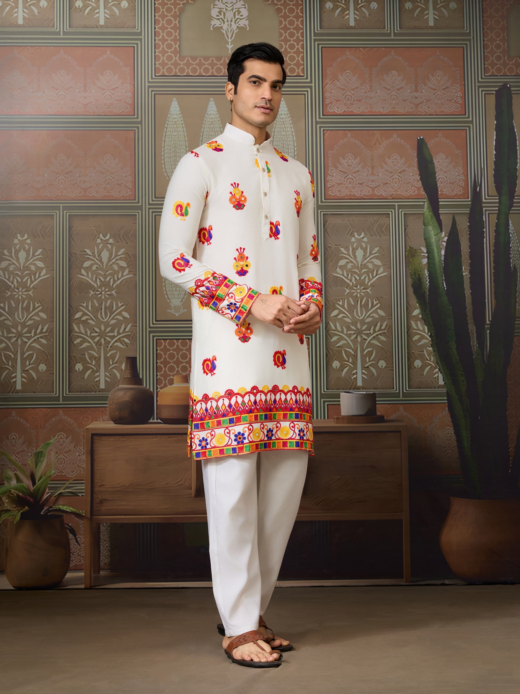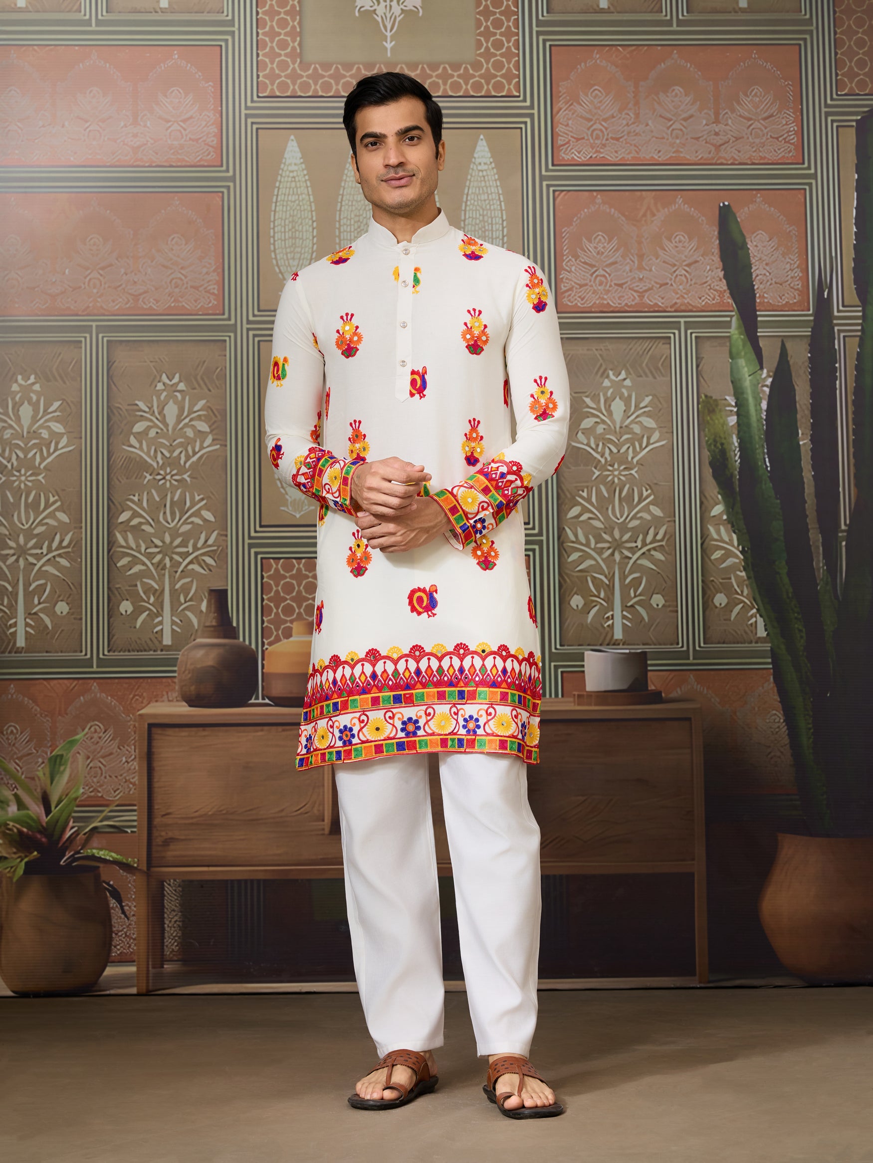 Elevate your ethnic look with this White Kurta, adorned with vibrant multicolor embroidery, mirror highlights, and traditional motifs. A perfect choice for weddings, Garba nights & festive celebrations. Pair with white pants or churidar for a royal vibe.